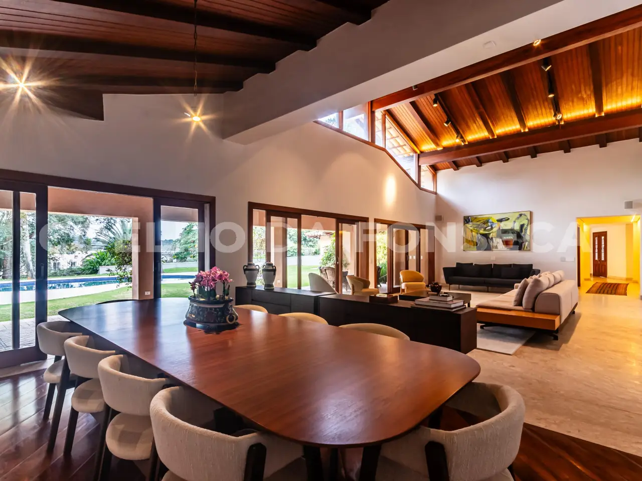 Located in one of the city's most exclusive and centrally located areas, this property impresses with its impeccable maintenance and stunning views. With a large private lot, this semi-story residence features a unique layout, with only the master suite located on the upper floor. On the ground floor, you'll find three suites with fine, light wood floors, while all other rooms feature travertine marble. The quality of the materials and finishes is simply exceptional. Furthermore, the house boasts a home theater, gym, dry and wet saunas, a full gourmet area, a stunning French garden, and a large lawn, providing comfort and warmth. Don't miss the opportunity to see this incredible property. Schedule a viewing and be amazed! House in the TAMBORÉ I condominium, with 923m² of built area, 4 bedrooms, 4 suites, 10 parking spaces, 8 bathrooms, swimming pool, office, sauna, air conditioning, maid's quarters, balcony, solar water heater, double-height ceilings, and a single-story house.