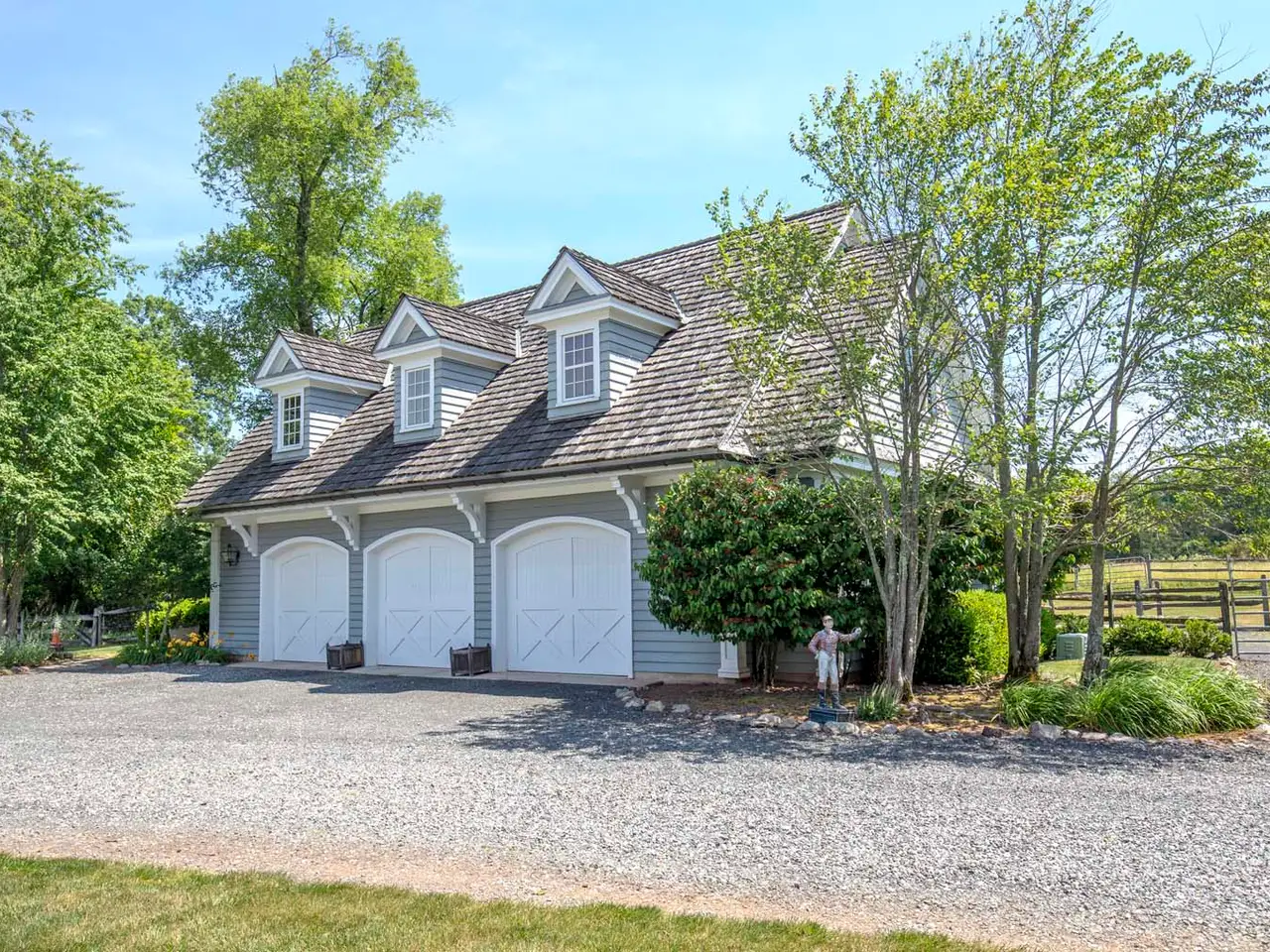 Exquisitely-Detailed Colonial Revival Estate on 43± Acres in Bedminster Set on 43± open, rolling acres in Bedminster Hunt Country, an exceptional gated Colonial Revival estate with equestrian facilities is set along one of the township's most desirable lanes. Featured in NJ Design magazine, the sophisticated interiors create a relaxed ambiance characterized by rich colors and remarkable millwork. The expansive seven-bedroom, eight full bath and two half-bath main residence is enriched by a three-stall horse barn featuring an attached three-car garage with a two-bedroom apartment above and an adjacent bonus room with kitchenette and full bath. Outside the main house, a generous patio and dual-covered side porches overlook sublime views of the acreage, while a pool tucked beyond a charming arbor and white picket fencing is lushly landscaped. Set far back from the road at the end of the long drive, this gracious property provides absolute privacy. Classic design elements within the layout include seven intricately mantled fireplaces, oak wood floors, arched doorways, traditional moldings and woodwork, stunning architectural details, unique built-ins, custom-painted rooms, exposed ceiling beams, two wet bars, a rear staircase and covered porte-cochère access to the home's three-car garage. Hiland Hall Turner Architects oriented the residence on the acreage to take advantage of morning sunlight in the front rooms and colorful sunsets in rear-facing spaces. A grandly styled layout invites epic entertaining as well as quiet times inspired by natural beauty viewed from numerous glass doors and oversized windows. A vestibule entry leads to the front-to-back foyer fitted with painted oak floors, a curving staircase and sightlines into some of the principal rooms. These include a formal living room anchored by an ornately mantled fireplace, a wood-paneled library featuring a fireplace and a connecting mahogany wet bar, and a dining room designed with built-in china cabinets, a fireplace, windowed seating niche and hand-painted wallpaper. An expansive fireside game room is finished in artful trim throughout. Nearby is a home office and formal powder room. The epicurean kitchen presents a center island with a prep sink, Franke farmhouse sink, custom cabinetry and a sun-splashed dining area with a domed ceiling featuring a hand-painted cloud mural. A collection of high-end appliances includes a Viking range, Sub-Zero refrigerator, Bosch dishwasher and wine refrigerator. Adjacent to the kitchen is a secondary office space and a butler?s pantry. The floor plan continues into a great room set under towering vaulted ceilings accented by reclaimed wood beams. Natural light spills into this space from fixed upper windows and French doors to the porch, while a floor-to-ceiling stone fireplace is a handsome focal point. This part of the home is completed by a mud room with storage options, informal powder room, staircase to the finished lower level, secondary stairs to the bedroom level, and access to the porte-cochère and garage. Upstairs, a captivating window seat in the landing overlooks tranquil grounds. A primary suite begins in the vaulted ceiling bedroom featuring a fireplace, sitting area, built-ins and access to the extra-large primary balcony. An oversized dressing room with wardrobe organizers and two walk-in closets provide ample storage. The spa-like primary bath has a heated floor and includes a jetted soaking tub, separate water closet with a toilet and bidet, an oversized shower and double vanity. Four additional en suite bedrooms each connect to a full, private bath, and a laundry room is a smart addition. Over the garage, a finished guest area contains a kitchenette, large bedroom, full bath and amazing countryside views. The third level was renovated in 2020 and offers a bedroom, full bath, sitting area and roomy cedar closet. The walkout lower level is accessible by stairs in both the entrance foyer and mud room area. Of special note is the Tuscany-inspired wine cellar which is temperature-controlled and provides storage for over 1,500 bottles. The beamed-ceiling tasting room has a gas fireplace, terra cotta floors and a wrought iron chandelier. This level also has a home theater/media room with a wet bar, refrigerator and popcorn machine; a huge playroom; a home gym with glass doors to the yard; a full bath; infrared sauna and mechanical systems including a whole-house generator. A detached three-car garage is designed with an adjacent horse barn offering three beautifully finished stalls, a kitchen, bath, storage room and access to a turn-out field. The barn's second level has a two-bedroom apartment and a separate bonus room, ideal for guests or staff. Originally built in 2000 and thoughtfully updated through the years, this architecturally-nuanced residence is finished in whitewashed brick, gray clapboard and a cedar shake roof. Its Bedminster location in Somerset County is celebrated for open green spaces, winding country roads and legendary estates, yet is only about an hour from Manhattan and approximately 45 minutes from Newark Liberty International Airport.