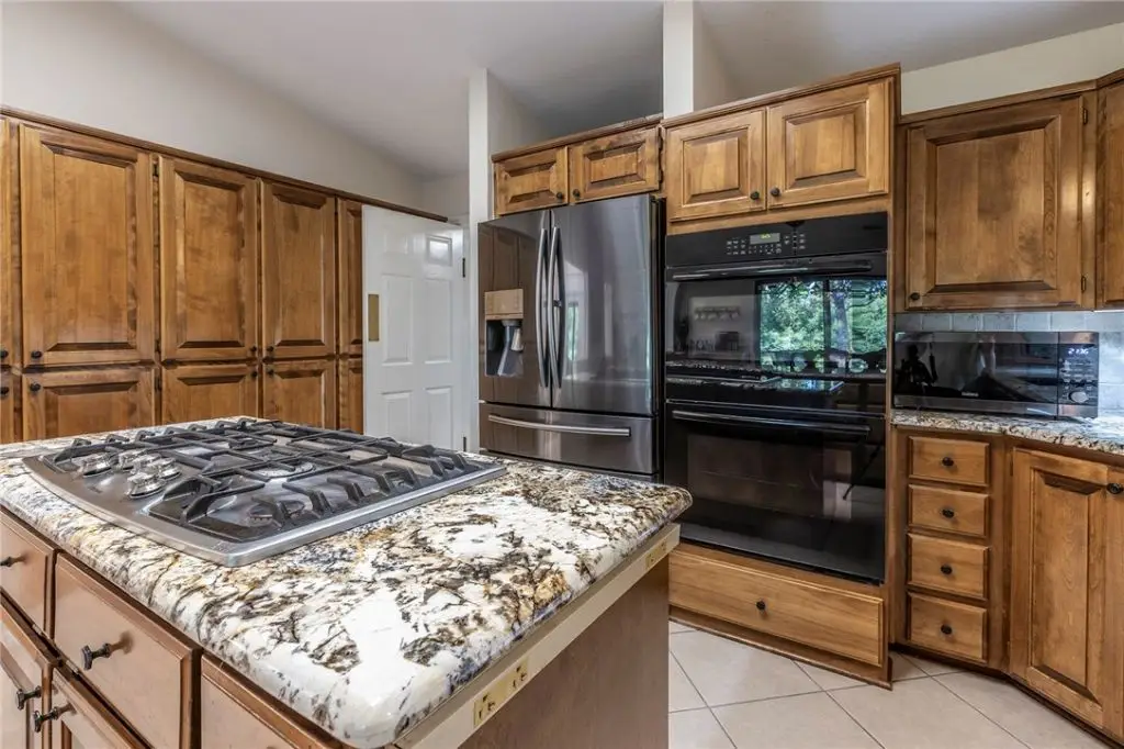 Piani di lavoro in granito, forno doppio, piano cottura a gas in cucina