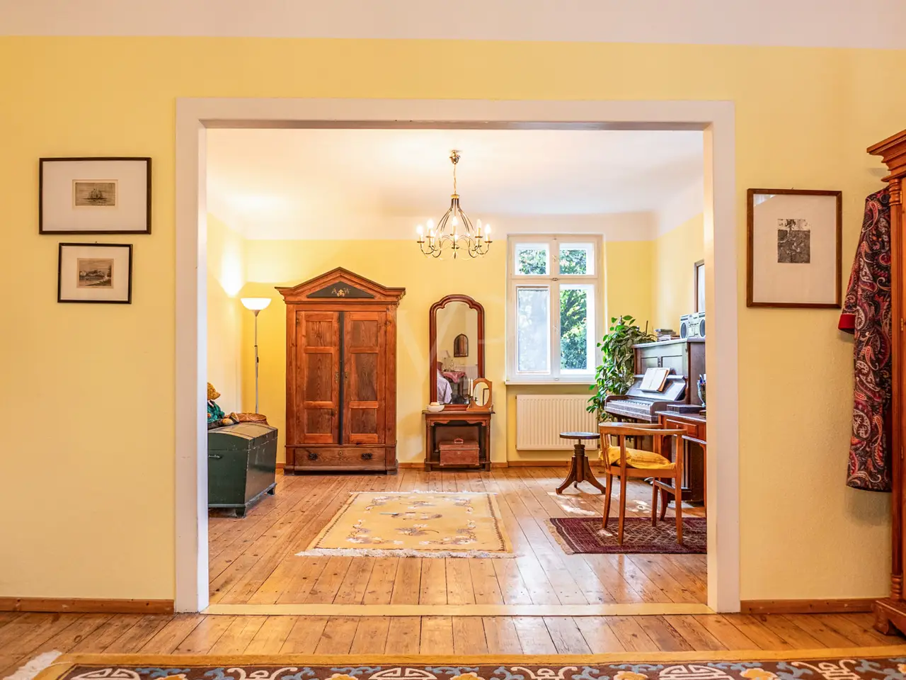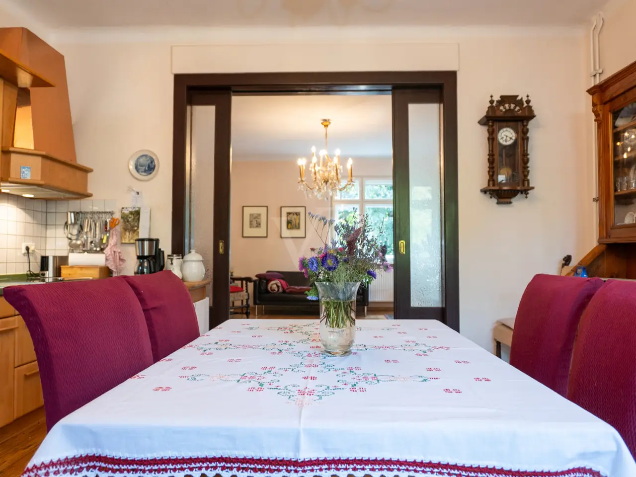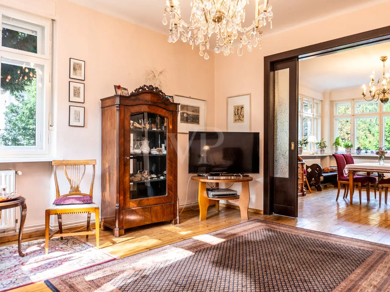 Welcome to your future home! This unique property from the 1930s not only offers a generous living space of approx. 221 m², but also the possibility of dividing the property, so that the rear part of the plot can also be built on. The park-like plot extends over an impressive approx. 1,303 m². The lawn to the rear with a beautifully landscaped garden, accessible via the veranda on the first floor, invites you to relax and offers plenty of space for your leisure activities. This stately detached house with a full basement and villa character impresses with its typical 1930s charm. It has parquet and floorboards as well as a fireplace, which creates a cozy atmosphere in the cooler seasons. All levels are accessed via a spacious entrance with a central staircase. On the first floor is the spacious living area with a historic sliding door leading to the generous dining room with open kitchenette, ideal for convivial evenings with family and friends. A further living area with fireplace and access to the conservatory with a small guest WC round off the space on offer. From the veranda you have direct access to the beautiful garden. The upper floor offers a large bedroom, two further living rooms and a bathroom. The balcony is accessible from both the bedroom and the living rooms and offers a wonderful view of the property. The unfinished top floor represents a reserve of living space and can be designed and used as you wish. The room layout in the basement includes a complete granny apartment, a hallway, a laundry room with a cellar room, a sauna with shower and an additional WC. The granny apartment consists of a bathroom, a kitchen with dining area and a bedroom/living area. Extensive renovations were carried out in 1998, including the installation of the basement apartment, the opening up of the staircase area and the installation of a sauna. This charming property currently offers six living spaces with a living area of approx. 221 m² and a usable area of approx. 120 m². It impresses with its spacious layout and versatile usage options. Experience for yourself the charm and possibilities offered by this unique property. We look forward to introducing you to your new home!
