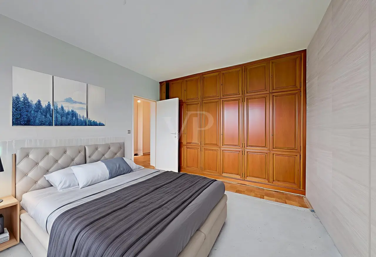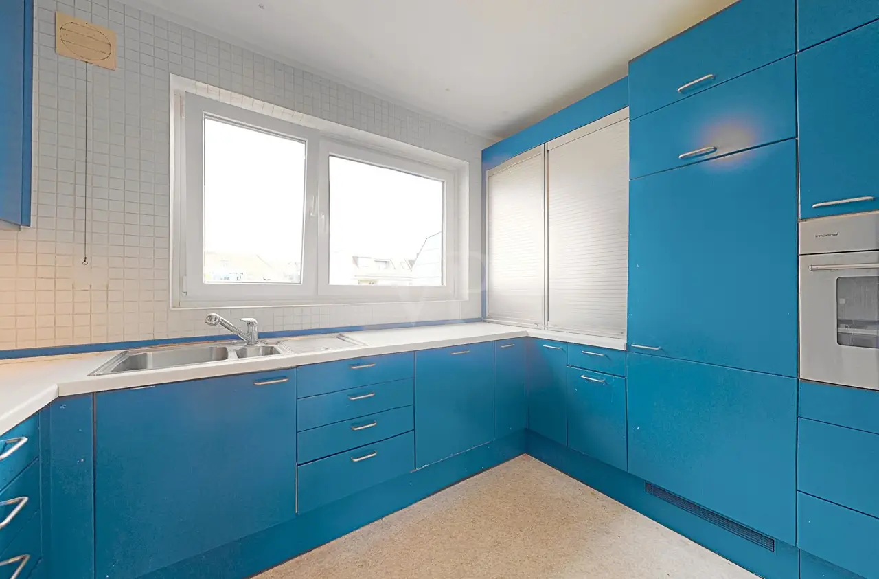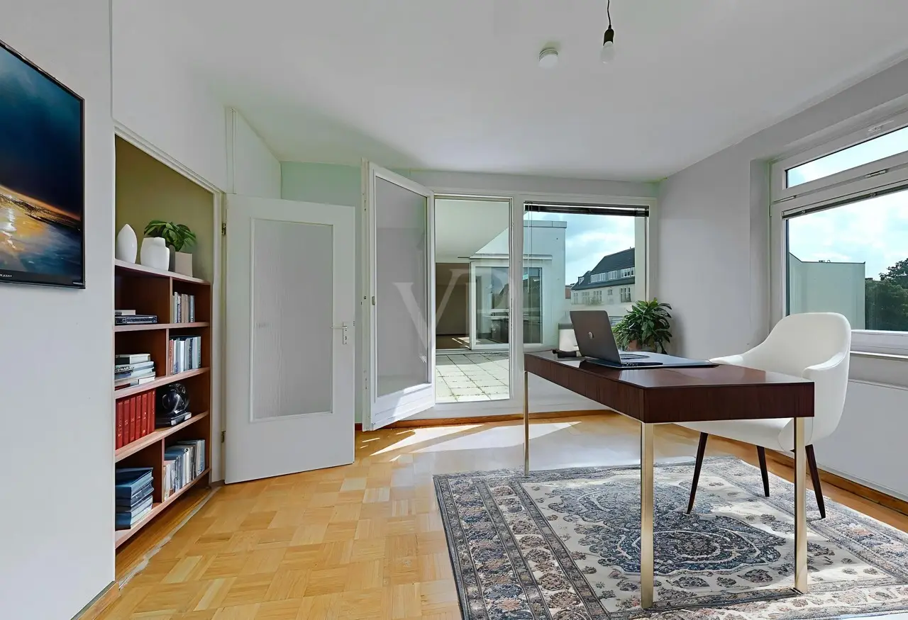 Spacious top-floor living with sunny south-facing terrace This charming top-floor apartment (5th floor) can be easily reached by elevator. It is located in a well-kept apartment building from 1969 and, with approx. 130 m² of living space, offers a spacious and comfortable home in the immediate vicinity of Kurfürstendamm. The apartment impresses with its central location and at the same time with its remarkable tranquillity! It has three rooms and impresses with its well thought-out room layout. The centerpiece is the open-plan living and dining area with access to the south-facing sun terrace - ideal for relaxing hours outdoors or social gatherings. Particularly noteworthy is the approx. 40 m² living room, which impresses with its brightness and far-reaching views. The quiet bedroom, facing north, offers pleasant coolness on warm days and serves as a perfect retreat. A separate, walk-in closet is directly adjacent. Another room can be used flexibly as a children's room, guest room or study - according to your needs. Two modern bathrooms provide additional comfort: one with a shower, the other with a bathtub - ideal for a quick start to the day or a relaxing bath in the evening. The kitchen is generously proportioned and offers plenty of space for your culinary ideas. A modern district heating system ensures even and energy-efficient heat distribution in all rooms. Undoubtedly the highlight: the spacious terrace. It offers numerous possibilities for individual design - whether for relaxing, gardening or for cozy evenings with friends. The location scores points for its excellent transport links and proximity to shopping facilities, schools and a wide range of leisure activities. The surrounding area offers a pleasant living atmosphere with an excellent infrastructure and short distances to all everyday amenities. Additional features include a private cellar room and practical communal areas such as a bicycle and drying room. There is also plenty of storage space within the apartment. It is possible to rent a parking space. The apartment was last modernized in 2020 and is in an attractive condition, but in need of renovation. Are you looking for a new home with plenty of space, two bathrooms and a sunny outdoor area in an absolute top location? Then come and see for yourself during a viewing on site. We look forward to your inquiry!