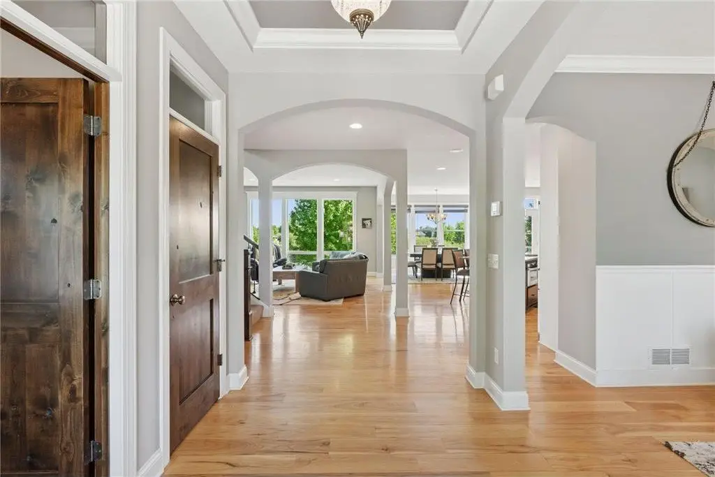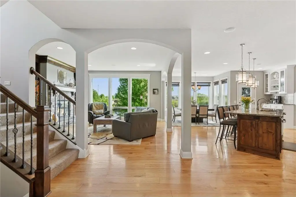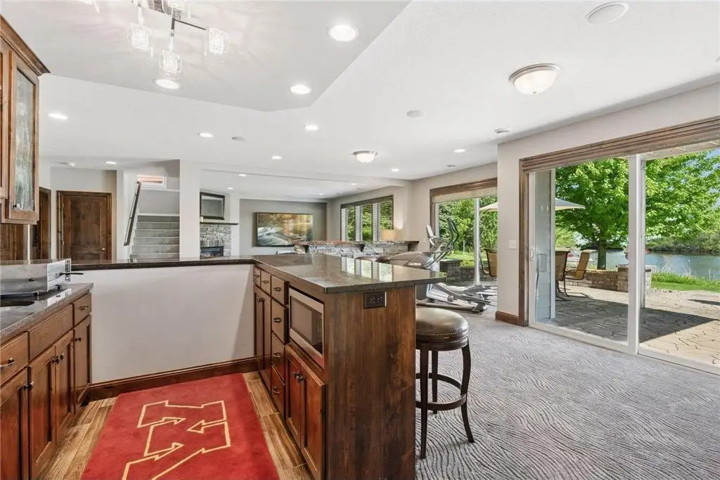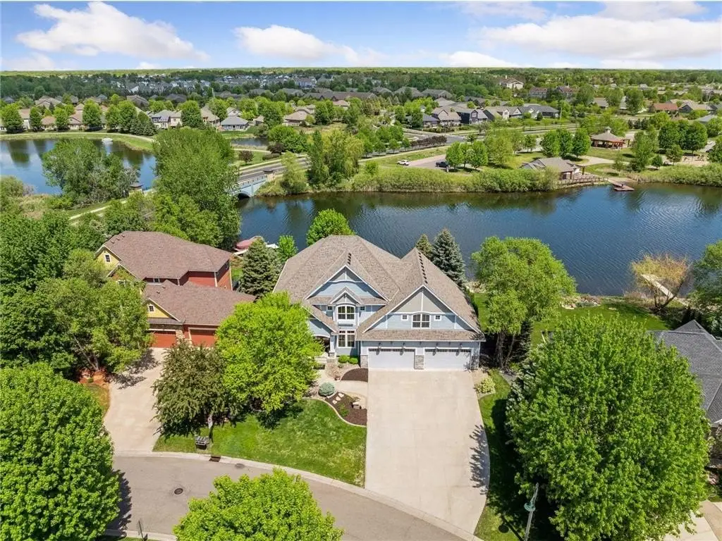 Welcome to this exquisite one-owner lakefront home, custom-built by award-winning Hanson Builders, showcasing unparalleled craftsmanship and timeless elegance. Nestled in the heart of The Lakes community on Sunrise Lake, this stunning 5-bedroom, 5-bathroom residence spans almost 5,400 square feet of meticulously designed living space, offering a perfect blend of luxury and comfort. Step inside to discover an open-concept main level featuring soaring ceilings, gleaming real site-finished hickory hardwood floors and abundant natural light. The gourmet kitchen is a chef’s dream, featuring top-of-the-line stainless steel KitchenAid appliances, granite countertops, a spacious center island, coffee bar, and custom cabinetry. The adjacent living room, with its cozy gas fireplace and built-in knotty alder shelving creates an inviting space for gatherings. Entertain your guests in the formal dining room or use it as a flex-space for reading and relaxing. Work from home? We have you covered with the private main floor office with French doors and custom-built cabinetry to store all your work items. A main floor “flex room” can also double as a bedroom or be used as a sunroom to look out at the lake. Upstairs, the primary suite is a true retreat, complete with a tray ceiling, walk-in closet, and a spa-inspired ensuite with dual vanities, a soaking tub, and a walk-in shower. Three additional bedrooms, one with a private ¾ bath and the other two share a jack and jill bath with separate tub and shower, are also conveniently located on the upper level. Unwind, watch a movie, have family game night, or get some homework done in the amazing bonus room! The lower level offers a versatile family room with warm fireplace and custom wet bar with full size refrigerator, ideal for entertaining your guests. An additional bedroom and exercise room complete the lower level. There’s also additional storage space under the stairs and in the mechanical room. Outside, the professionally landscaped yard features a maintenance-free deck and a serene custom paved patio and fire pit, perfect for enjoying Minnesota’s seasons. The oversized 4-car garage with floor drain provides plenty of storage and is completely insulated and ready for a garage heater. Additional storage is located in the garage and also in a backyard attached “shed” to store all your beach and lake toys. Located just minutes from top-rated schools, parks, shopping, and easy access to I-35W, this home combines suburban tranquility with urban connectivity. Impeccably maintained and thoughtfully designed, this masterpiece is ready for its next chapter. Schedule your private tour today to experience luxury living at its finest!