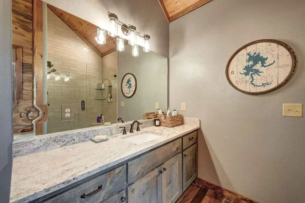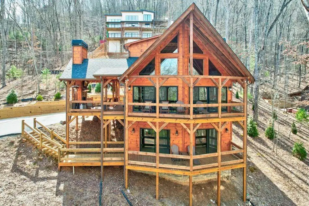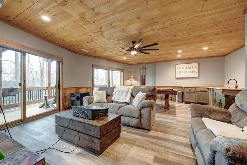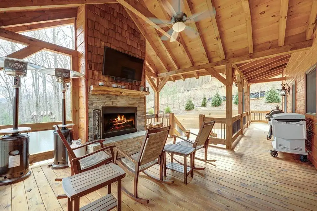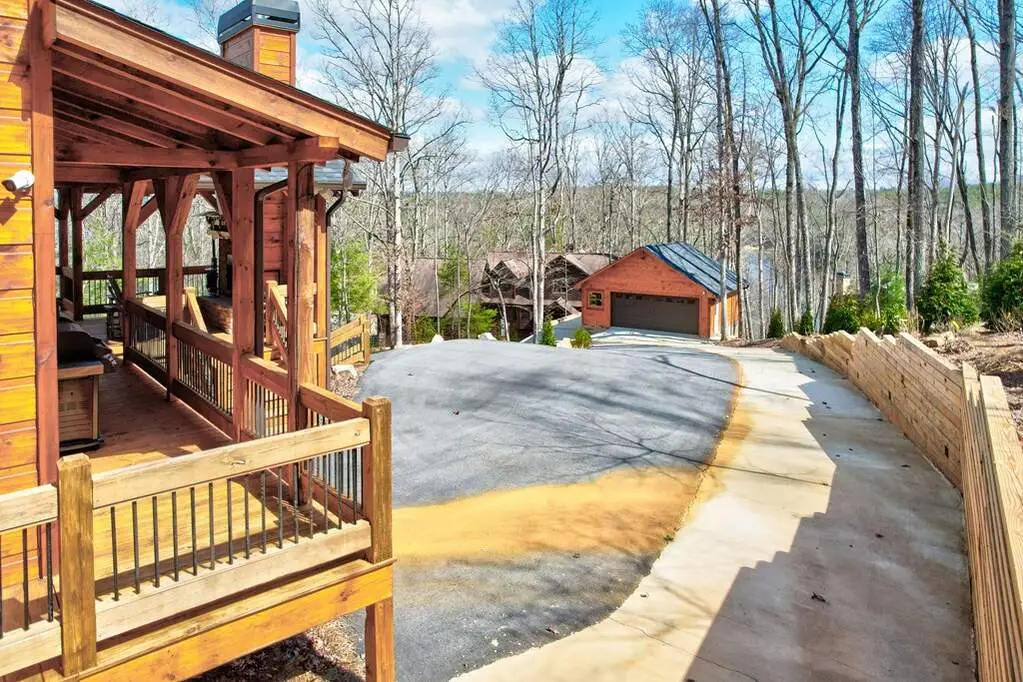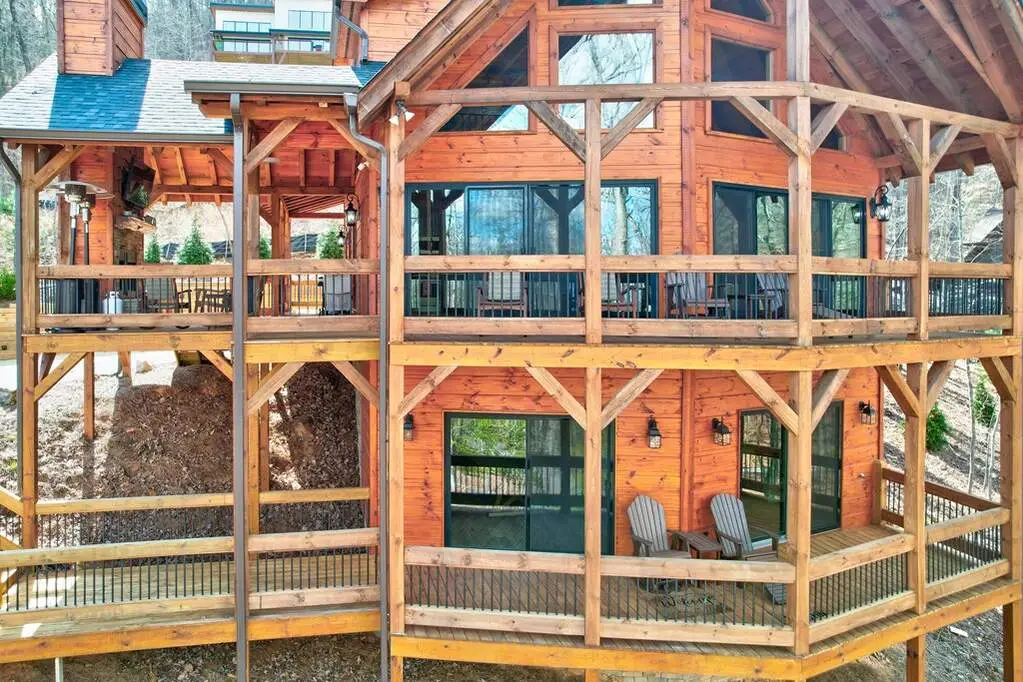 This stunning prow-front cabin features a window wall that brings the outdoors inside. The cabin offers a spacious Garage and multiple outdoor living areas, including a Party Porch with a wood-burning fireplace, a Hot Tub porch, wraparound decks, and a generator. The direct access to Lake Blue Ridge is ideal for kayaking and paddle boarding. The great room boasts a majestic stone fireplace with a cedar mantel that seamlessly flows into the dining area: the kitchen has granite countertops, custom cabinetry, and stainless-steel appliances. The cabin showcases beautiful "Blue Buggy" tongue-and-groove (T&G) interior walls, bark accents, tiled showers, and granite countertops. The terrace level includes a family room featuring a wet bar, pool table, and rocked fireplace. Each level has a spacious bedroom with a full bath and an additional half bath on the main floor. The laundry is conveniently located on the main level, and ample storage space ensures you have room for all your gear and belongings. The cabin is situated in an established neighborhood with all-paved access, this cabin is just a short walk from the Necowa Cove community access. You can take advantage of the nearby Aska Trail System for hiking, mountain biking, and immersing yourself in nature while only ten minutes away from downtown Blue Ridge. Public boat launch and the Toccoa River are just minutes away. Fully furnished and offering seasonal views of the mountains and shimmering light off of the lake, this cabin is the perfect getaway. Short-term rentals are allowed.