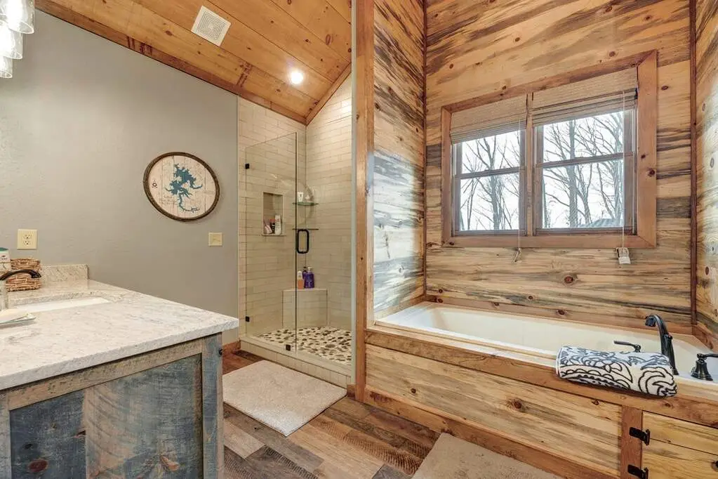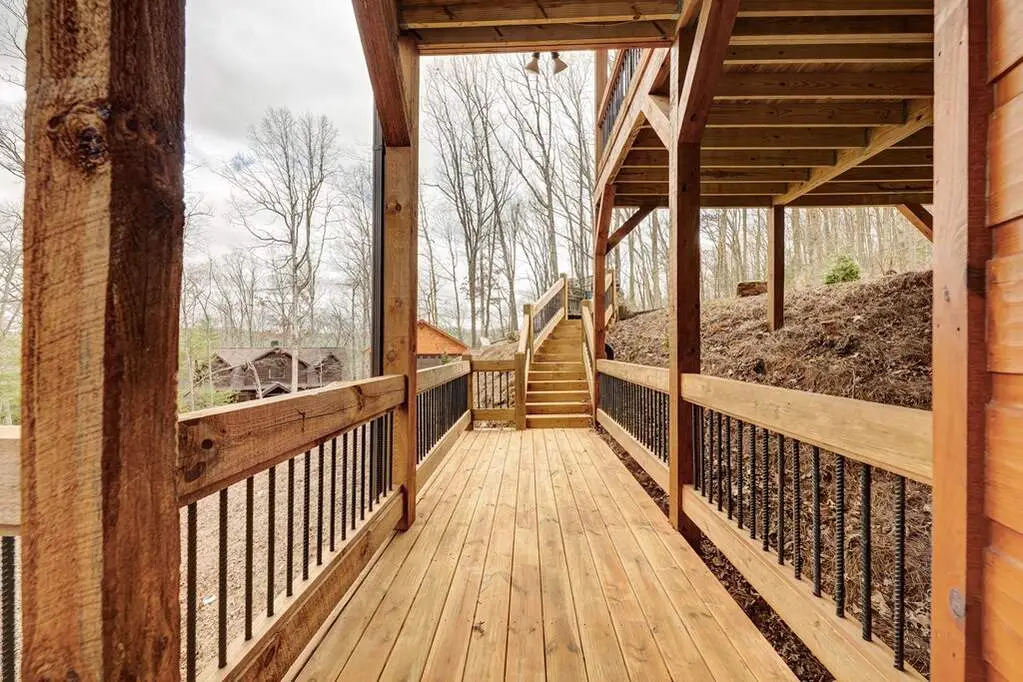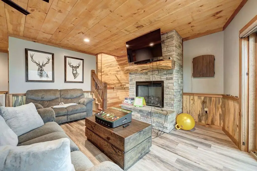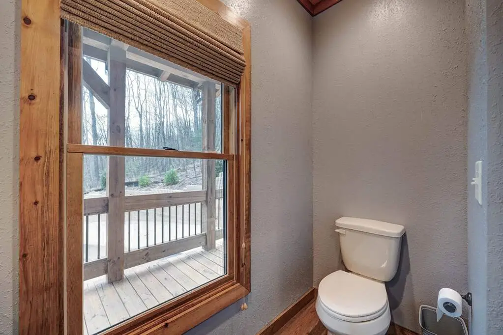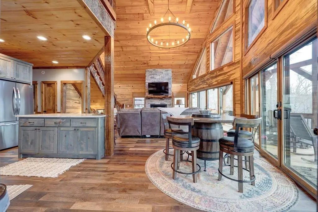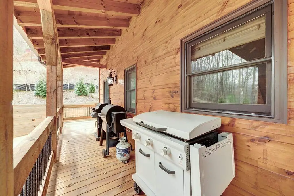 This stunning prow-front cabin features a window wall that brings the outdoors inside. The cabin offers a spacious Garage and multiple outdoor living areas, including a Party Porch with a wood-burning fireplace, a Hot Tub porch, wraparound decks, and a generator. The direct access to Lake Blue Ridge is ideal for kayaking and paddle boarding. The great room boasts a majestic stone fireplace with a cedar mantel that seamlessly flows into the dining area: the kitchen has granite countertops, custom cabinetry, and stainless-steel appliances. The cabin showcases beautiful "Blue Buggy" tongue-and-groove (T&G) interior walls, bark accents, tiled showers, and granite countertops. The terrace level includes a family room featuring a wet bar, pool table, and rocked fireplace. Each level has a spacious bedroom with a full bath and an additional half bath on the main floor. The laundry is conveniently located on the main level, and ample storage space ensures you have room for all your gear and belongings. The cabin is situated in an established neighborhood with all-paved access, this cabin is just a short walk from the Necowa Cove community access. You can take advantage of the nearby Aska Trail System for hiking, mountain biking, and immersing yourself in nature while only ten minutes away from downtown Blue Ridge. Public boat launch and the Toccoa River are just minutes away. Fully furnished and offering seasonal views of the mountains and shimmering light off of the lake, this cabin is the perfect getaway. Short-term rentals are allowed.