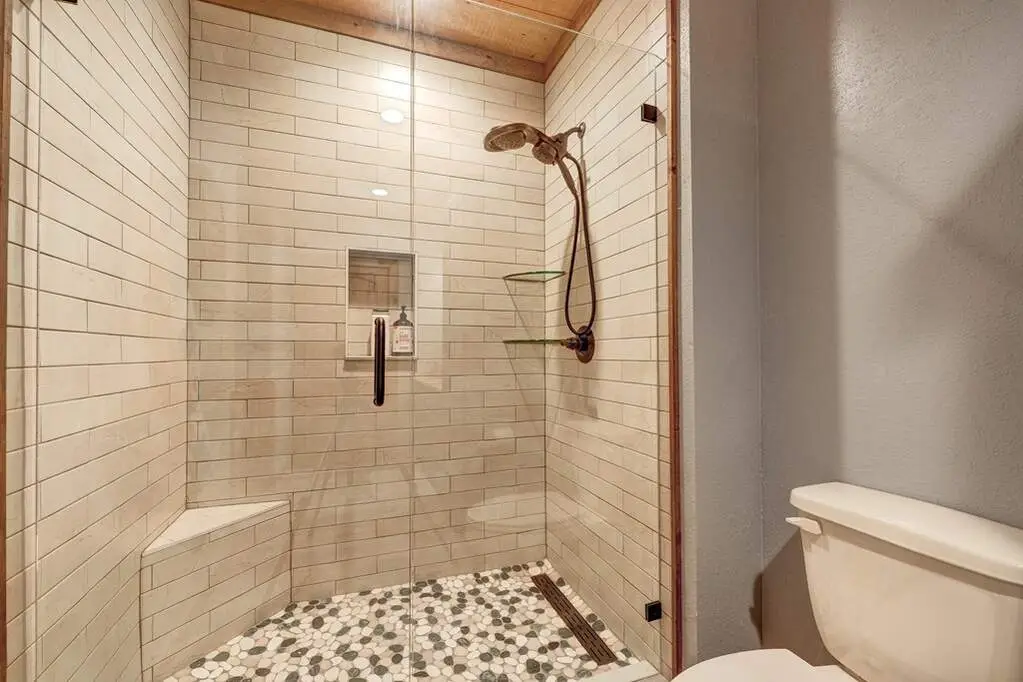 Stone fireplace with cedar mantel