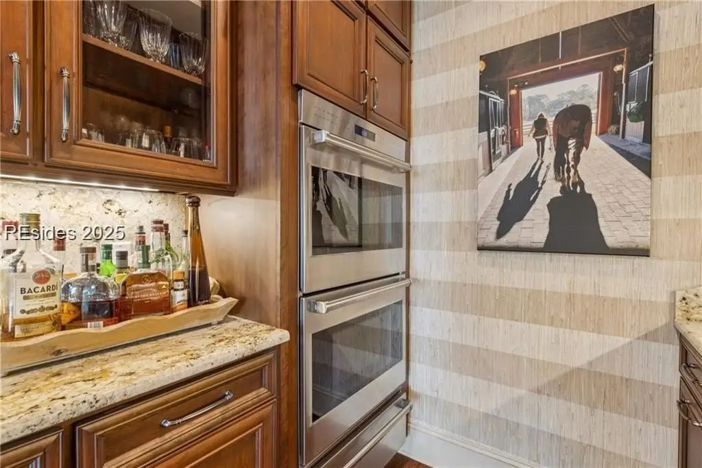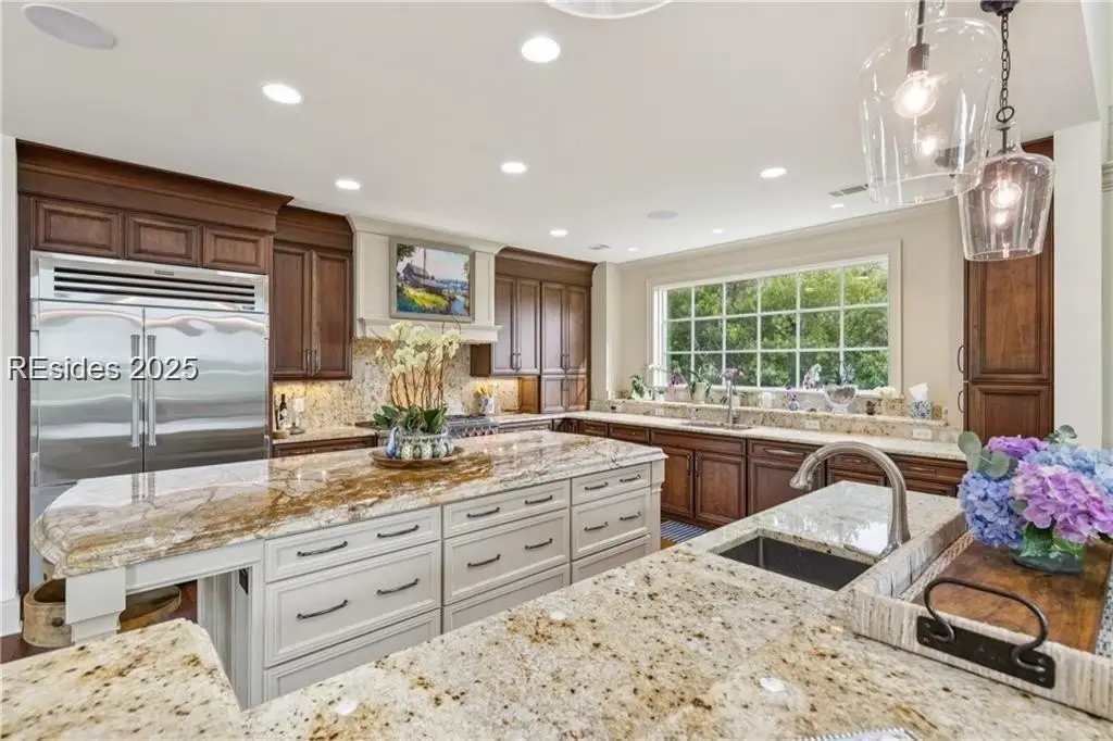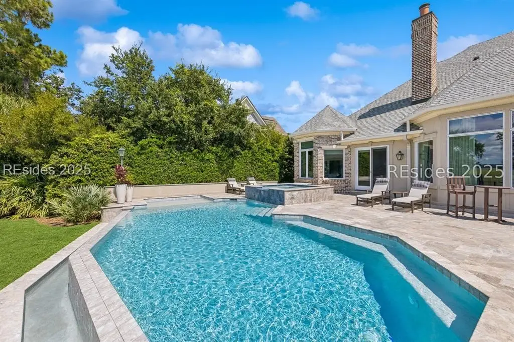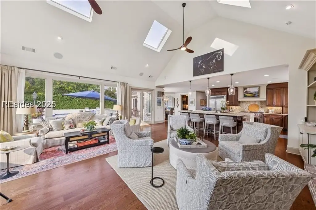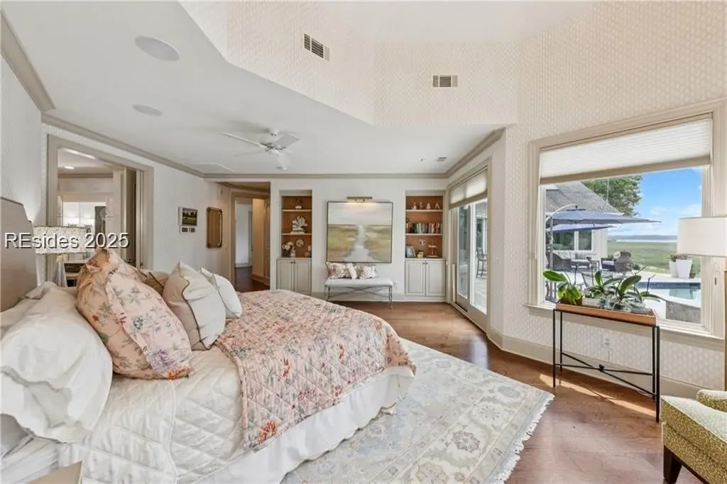 Spectacular marsh-to-river views framed by live oaks in this beautifully updated custom home. Enter through a gated garden into soaring 12’ ceilings, abundant light, and elegant living spaces. The chef's kitchen boasts a Wolf range, 4 ovens, Sub-Zero fridge, wine fridge, 10' island, 2 dishwashers, and more. First-floor primary suite has dual walk-in closets and a private laundry. Bonus room, custom closets, second laundry, new carpet (2023), HVAC (2020), pool heat/cool pump (2024), UV window film, custom built-ins, fire pit, and more. It's an ideal layout for entertaining and hosting family.
