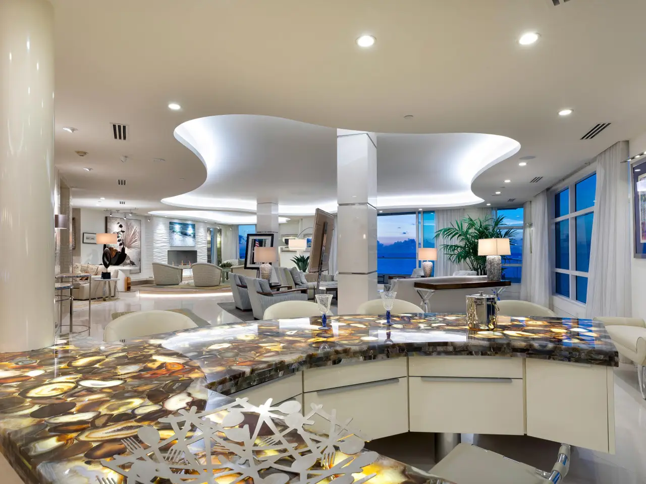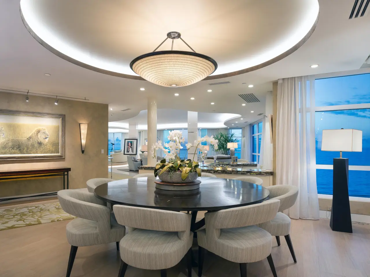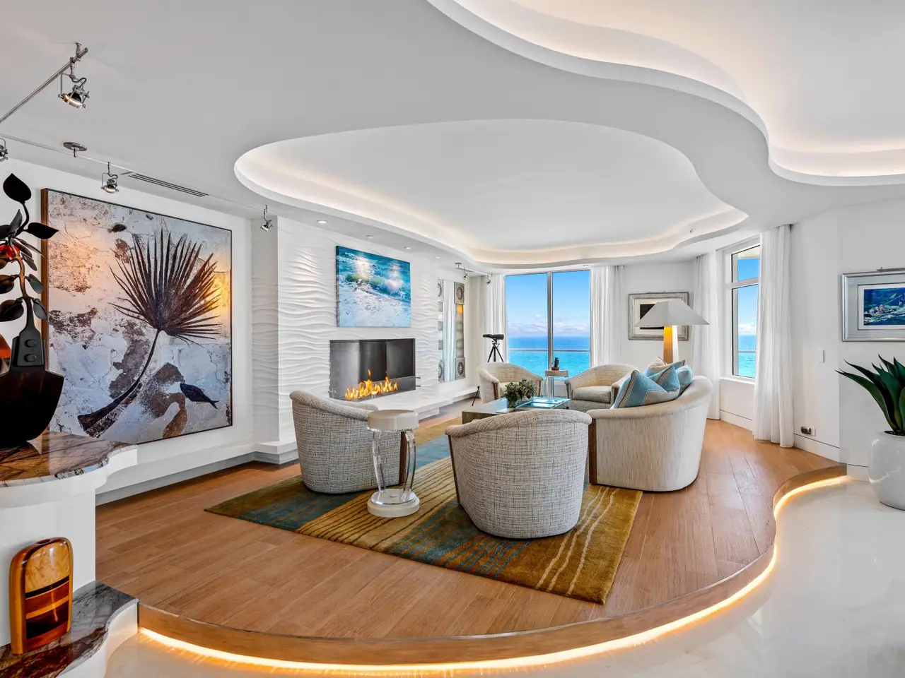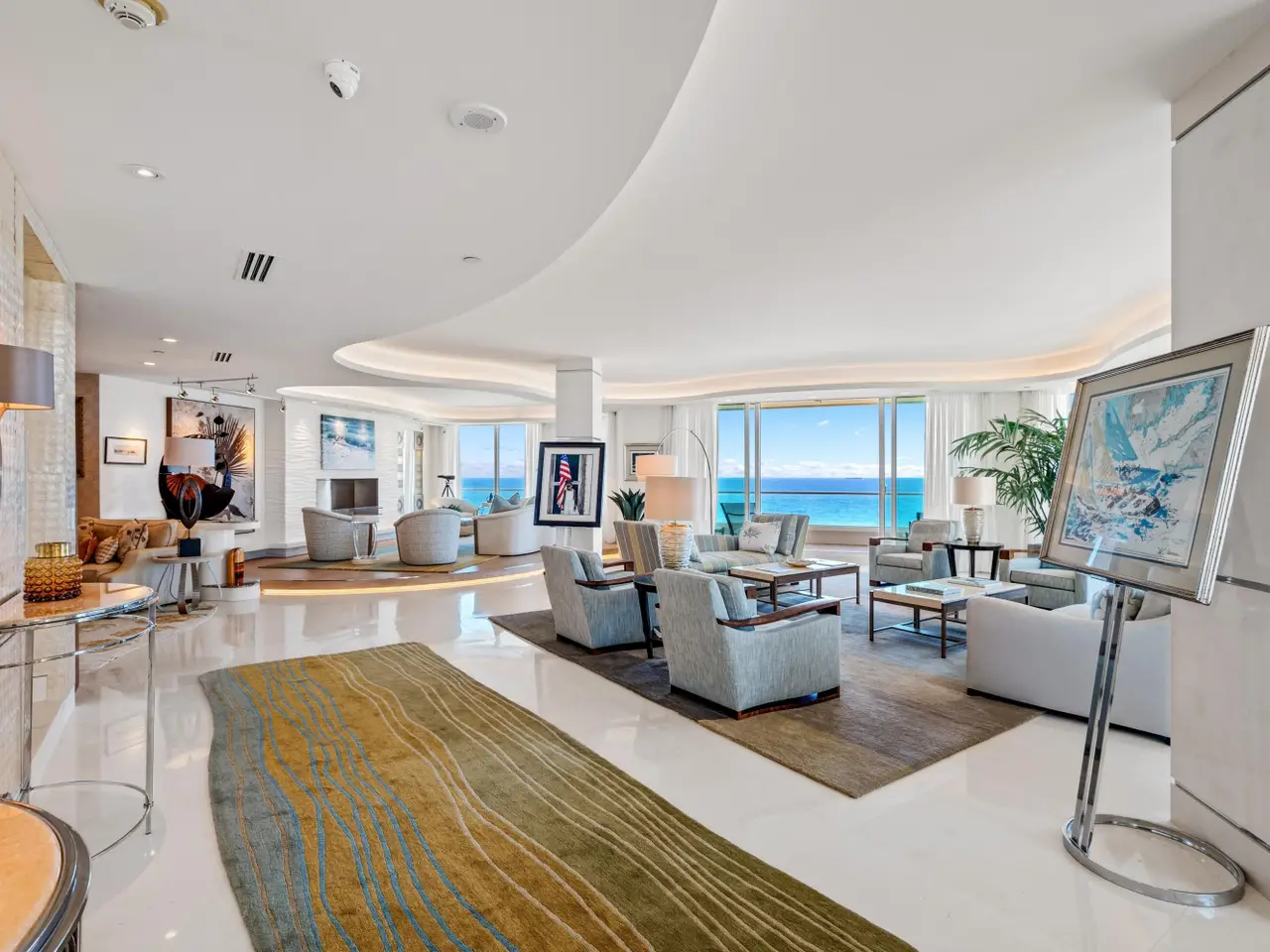 Custom-designed direct oceanfront, fully-furnished 4-bedroom double residence at The Aragon with an oceanfront cabana. Designed, executed and furnished with the finest detail by decorators unlimited. Stunning water views immediately upon entry from the private elevator. Oceanfront living room with adjoining den and library opens to a large oceanfront balcony. Limestone floors, detailed ceilings, Crestron home automation system, custom finishes and furnishings compliment stunning architecture. Chef’s kitchen with double islands, custom cabinetry and commanding views. A well-appointed primary suite offers ocean and city views, a fabulous bath with sauna and a great office overlooking the water. Three additional bedroom suites plus a media room. Aragon is a full-service, concierge building.