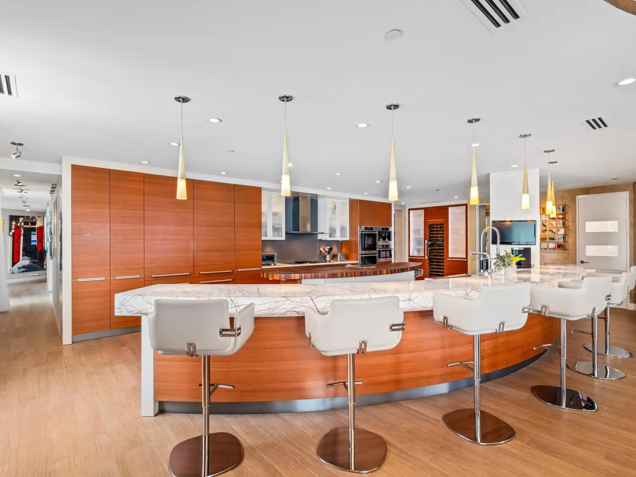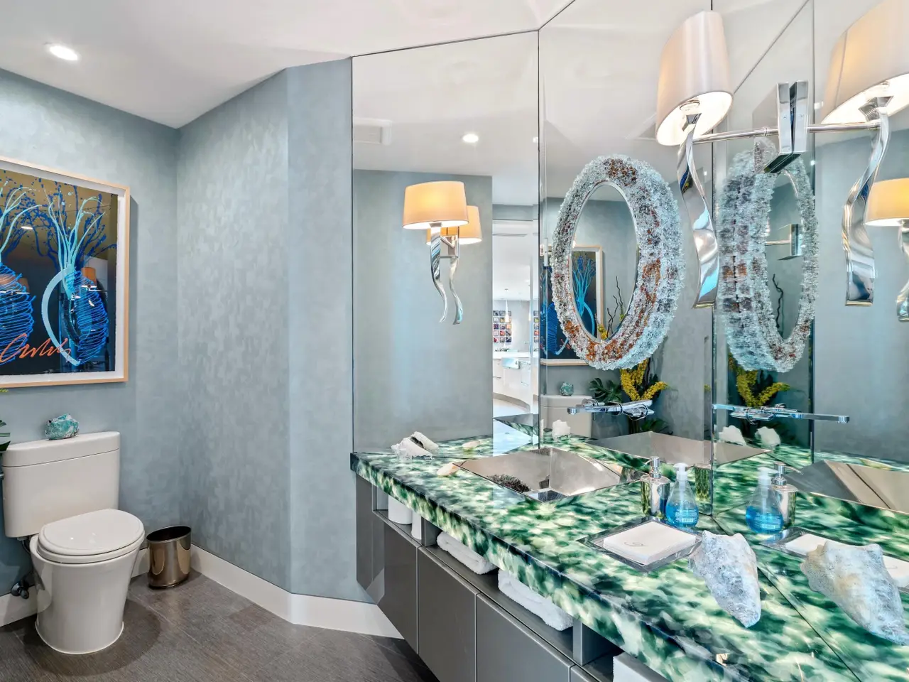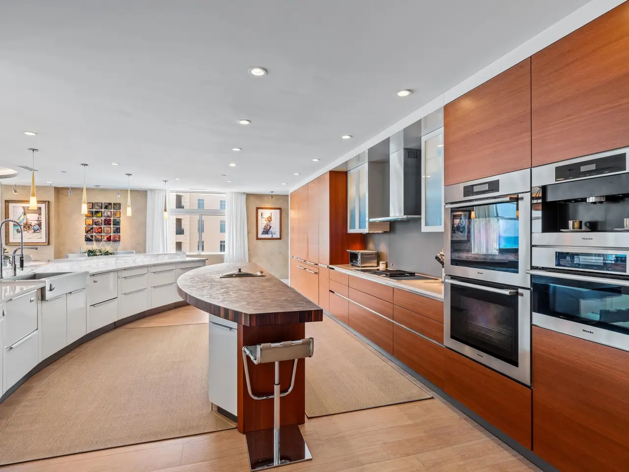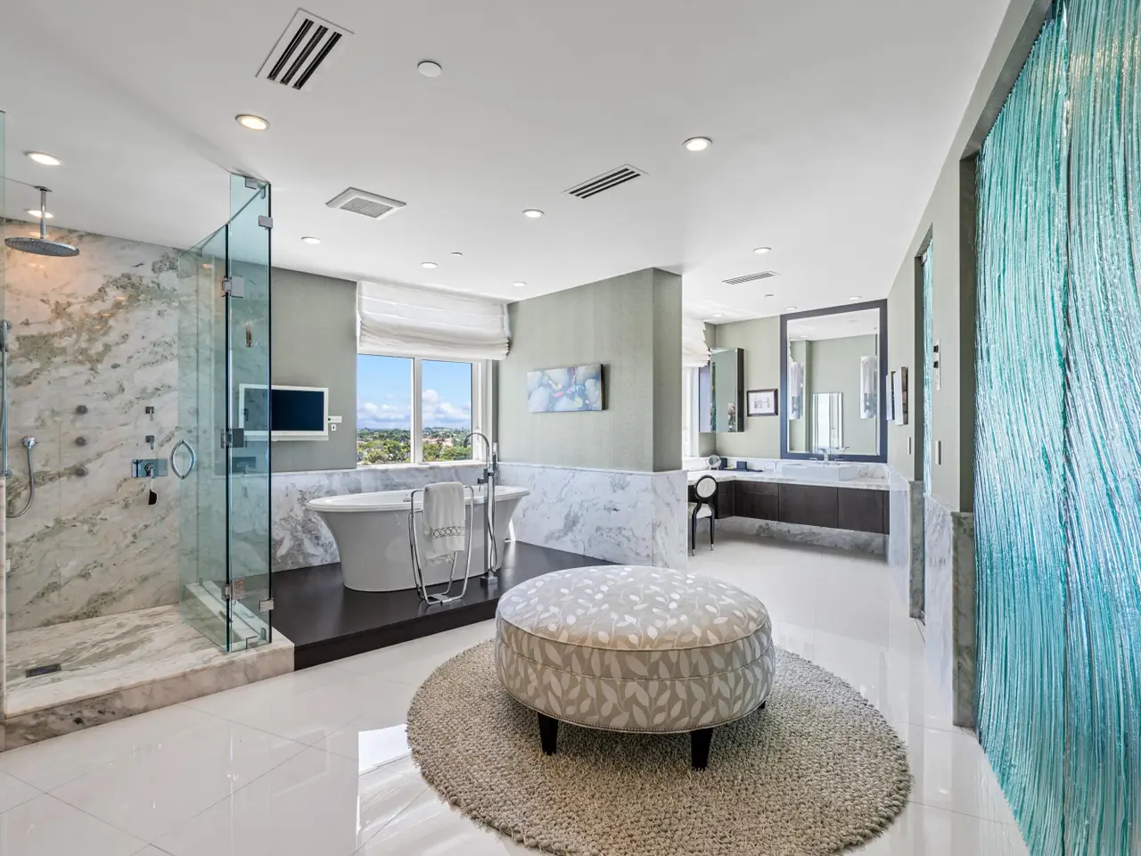 Custom-designed direct oceanfront, fully-furnished 4-bedroom double residence at The Aragon with an oceanfront cabana. Designed, executed and furnished with the finest detail by decorators unlimited. Stunning water views immediately upon entry from the private elevator. Oceanfront living room with adjoining den and library opens to a large oceanfront balcony. Limestone floors, detailed ceilings, Crestron home automation system, custom finishes and furnishings compliment stunning architecture. Chef’s kitchen with double islands, custom cabinetry and commanding views. A well-appointed primary suite offers ocean and city views, a fabulous bath with sauna and a great office overlooking the water. Three additional bedroom suites plus a media room. Aragon is a full-service, concierge building.