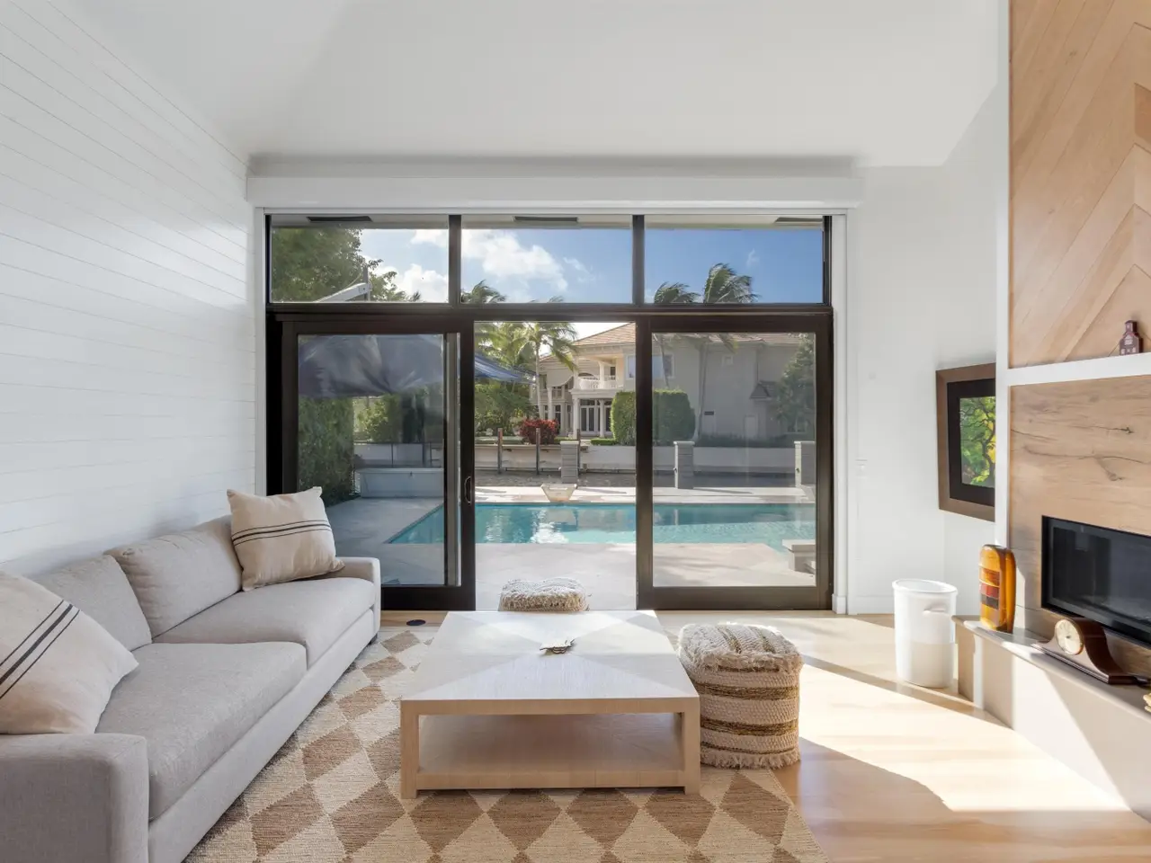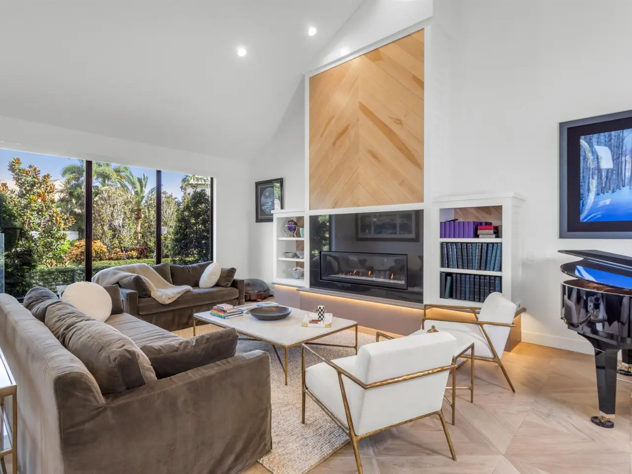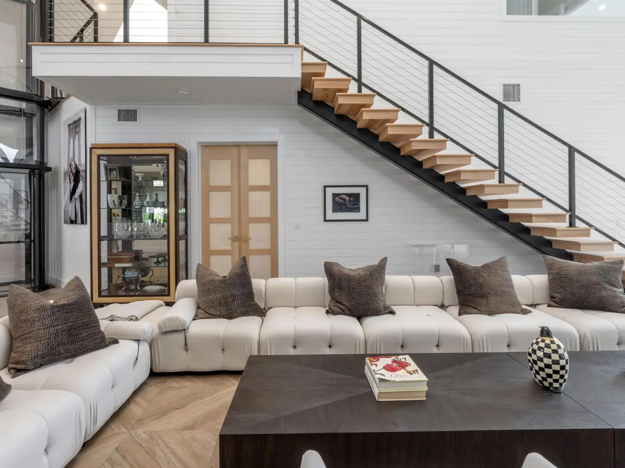 Blending contemporary architecture with lofty urban chic, this dramatic yachting estate offers a voluminous open floor plan with stunning interiors, serene water views, and direct ocean access. A massive glass grid entry with oversized custom double doors reveals a towering 30-foot foyer, which is a prelude to the voluminous expanse of this open-plan design. A skylit gallery sitting area is framed by twin suspended staircases with open cable rails and recessed stair lights. The dining area offers a floor-to-ceiling expansive grid window wall view of the sun-drenched pool and waterway. Soaring shiplap walls and bleached oak designed porcelain floors provide a modern farmhouse ambience.