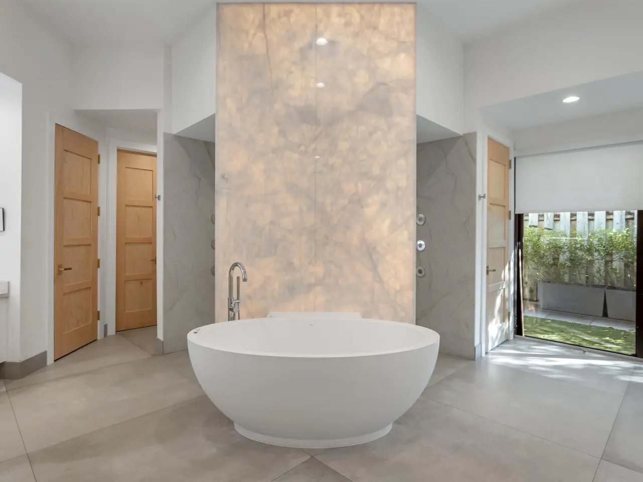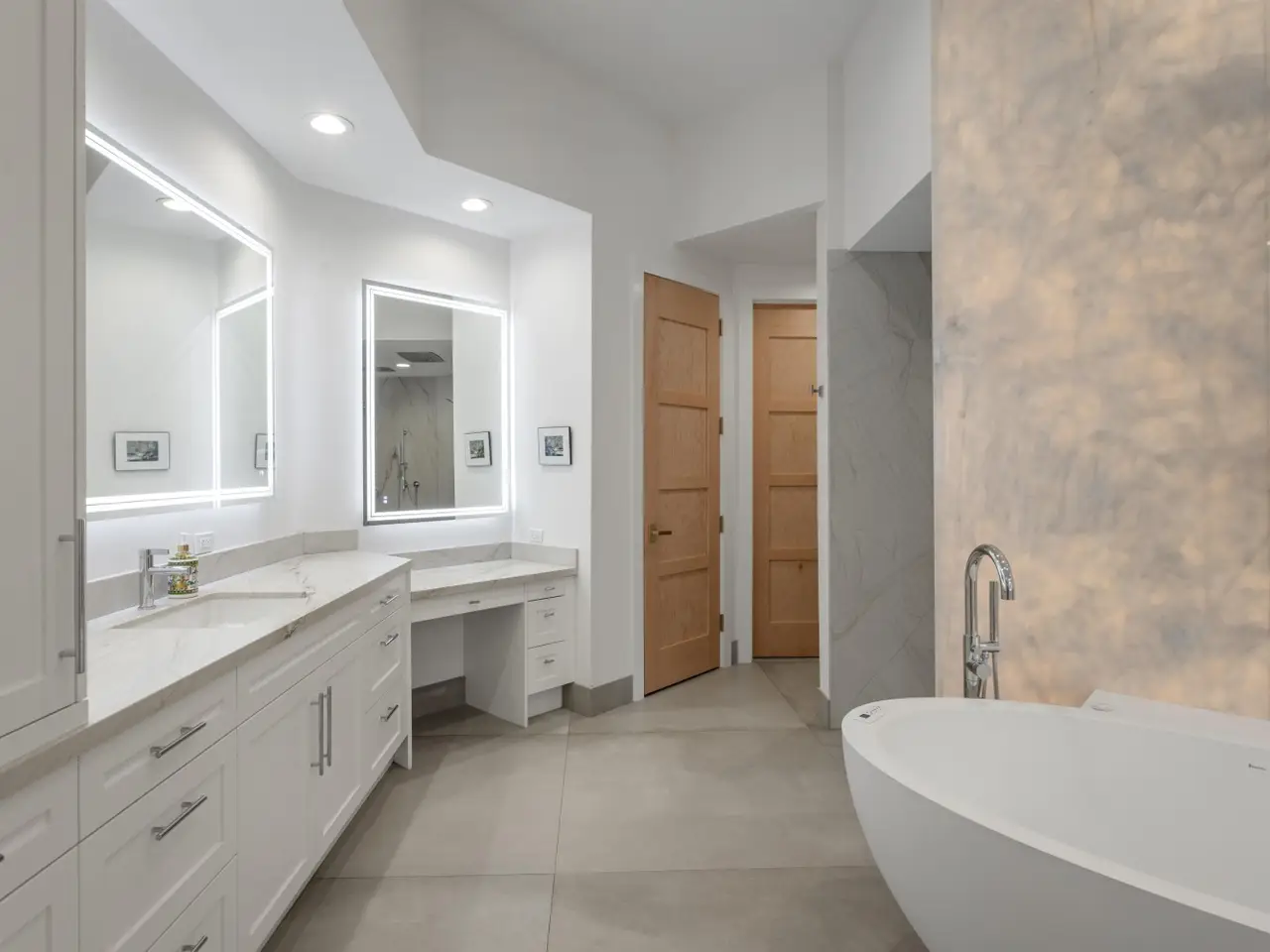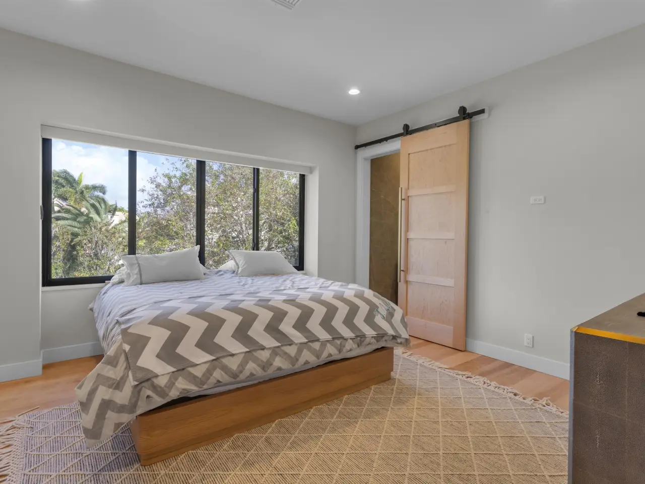 Blending contemporary architecture with lofty urban chic, this dramatic yachting estate offers a voluminous open floor plan with stunning interiors, serene water views, and direct ocean access. A massive glass grid entry with oversized custom double doors reveals a towering 30-foot foyer, which is a prelude to the voluminous expanse of this open-plan design. A skylit gallery sitting area is framed by twin suspended staircases with open cable rails and recessed stair lights. The dining area offers a floor-to-ceiling expansive grid window wall view of the sun-drenched pool and waterway. Soaring shiplap walls and bleached oak designed porcelain floors provide a modern farmhouse ambience.