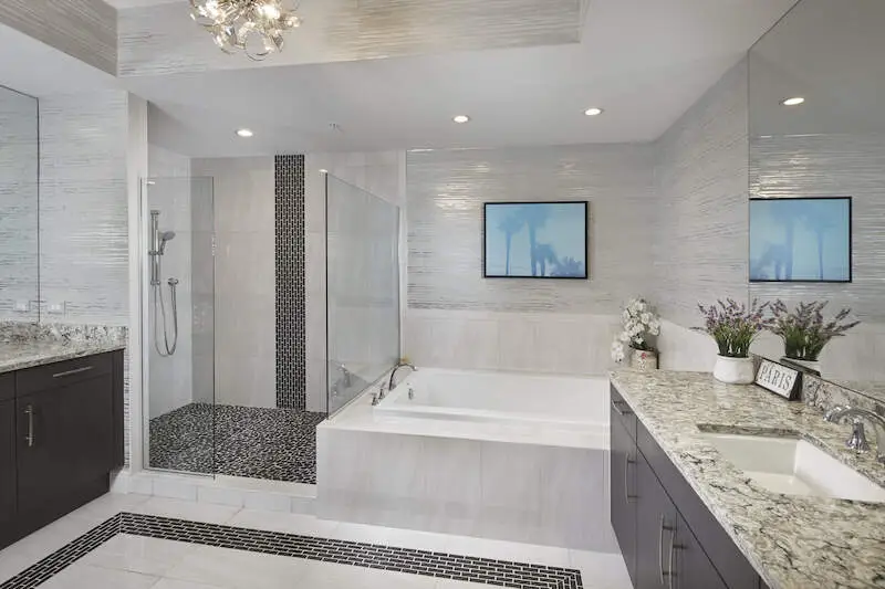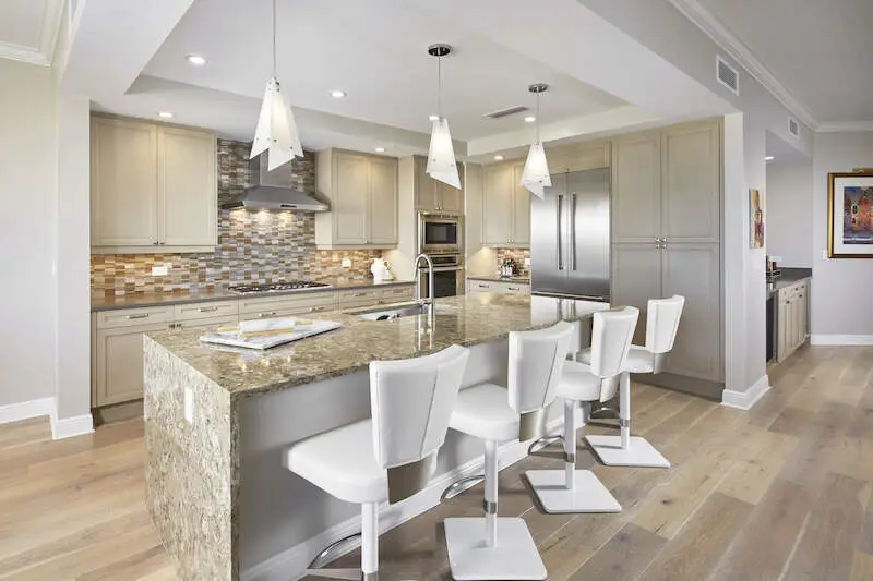 • Quartz kitchen counters and glass tile backsplash