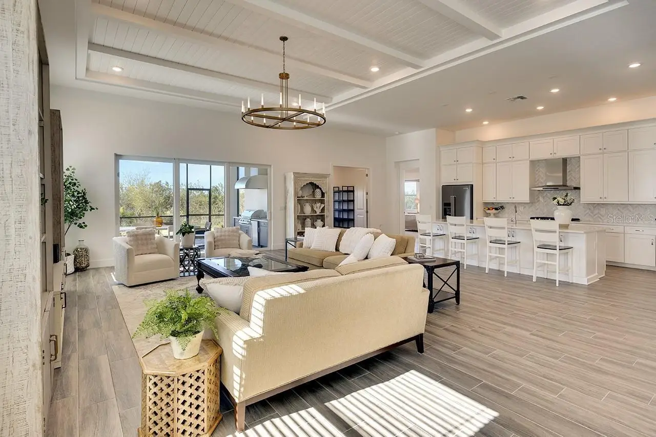 You'll be Wowed from the moment you walk in! This 3-bedroom, 3-bathroom home spans 3,022 square feet and is located on an oversized lot with picturesque views of a serene preserve, offering privacy and a stunning natural backdrop. Ceramic tile floors run throughout the home, creating a cohesive and low-maintenance living space. The expanded great room and dining room features beautiful, coffered ceilings with shiplap and beams, adding a touch of architectural elegance, while designer chandeliers enhance the sophistication of both the great room and dining area. The alternate kitchen layout is a chef's dream, featuring sleek quartz countertops and marble backsplash, 5 burner gas stove, walk-in pantry and a spacious design perfect for entertaining. A tankless water heater and hurricane impact windows and doors provide modern efficiency and peace of mind. A central vacuum system is built in which is designed to make household chores easier. The primary suite is a luxurious retreat with a large walk-in closet and a spa-like bathroom, featuring recessed shower niche, rain shower head, as well as standard shower fixture and dual sinks. The second bedroom offers an en-suite bathroom, ideal for guests or family members seeking comfort and privacy. A home office with a view of the preserve provides a tranquil space for work or relaxation. Outdoor living is exceptional with a welcoming front porch, a screened-in back porch for year-round enjoyment, and a fully equipped outdoor kitchen perfect for entertaining featuring a grill, refrigerator, sink and a tranquil view of the pond and preserve. Located in an amenity -rich community, residents of The Isles at Lakewood Ranch enjoy access to a resort-style pool, along with lap lanes, clubhouse, fitness center, tennis and pickleball courts, and scenic walking and biking trails. This exceptional residence seamlessly blends luxury, functionality and natural beauty, offering an unparalleled lifestyle in a truly breathtaking setting.