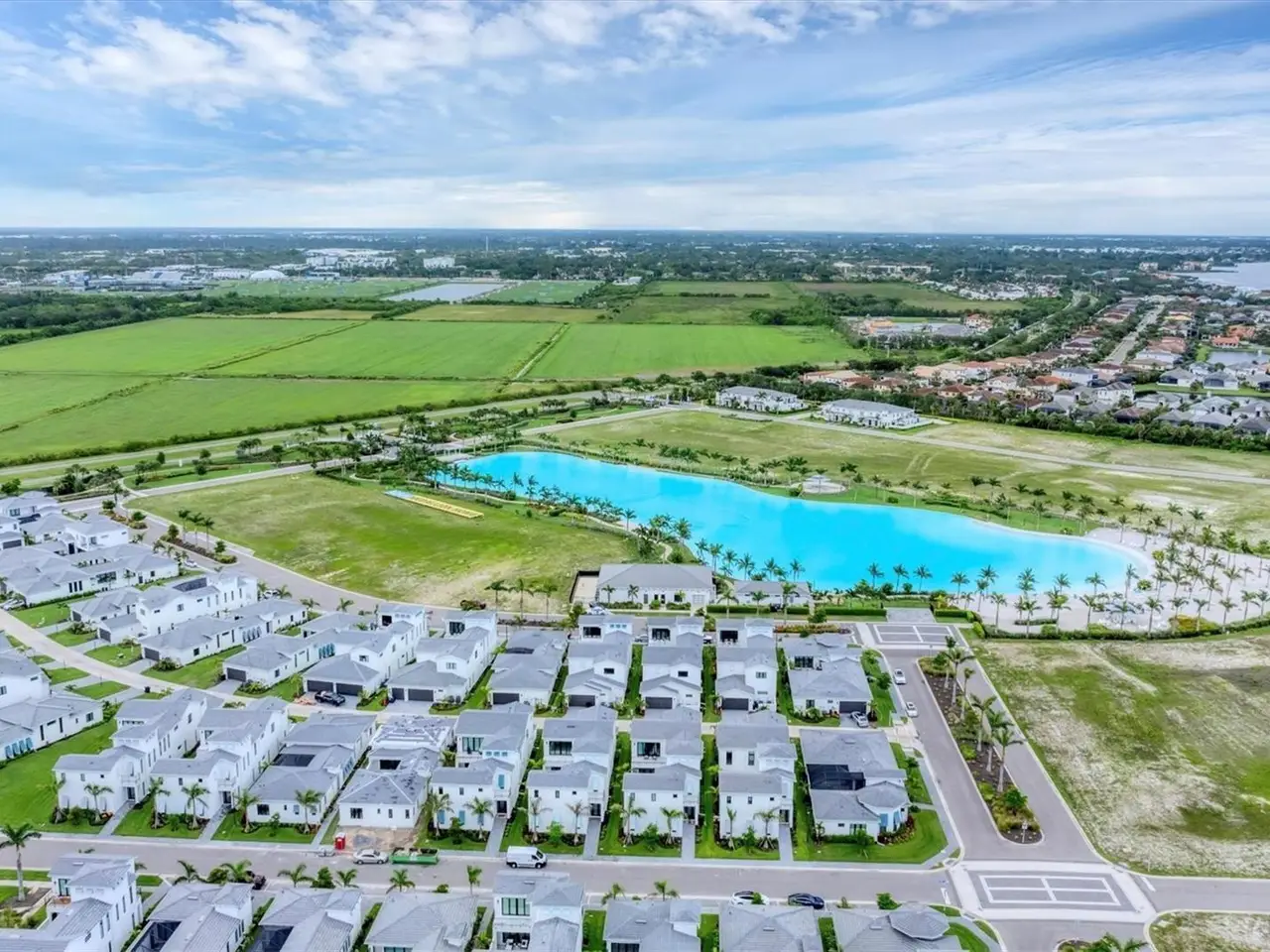 Stunning 2024-built FURNISHED home in premier gated community AQUA LAGOON, located near Sarasota Bay. Set on a premium lot, this two-story residence is steps away from AQUA's signature four-acre blue lagoon and tropical shoreline - bringing serene views and a beach-like setting right to your doorstep. Featuring high ceilings, brand-new luxury vinyl flooring in some main living areas, and an elegant European-inspired interior throughout, the main level features a bright and airy open-concept layout with a formal dining room, oversized living room, flexible den/office space, and a cozy nook beneath the staircase, perfect as a sitting or lounge area. A masterpiece of design, the gourmet kitchen boasts beautiful wood cabinetry and large ceiling beams, creating a warm and welcoming ambiance. The large center island features a gas cooking and seating for four, while Caesarstone quartz surfaces and stainless steel appliances round out this dream cooking space. Upstairs, the primary suite offers a private balcony overlooking the pool and courtyard, an oversized walk-in closet, and a spa-inspired bath with dual vanities, walk-in shower, and freestanding Jacuzzi tub. Two additional guest suites, each with full bath and one with its own balcony, plus a second living room and a well-appointed laundry room complete the upper level. The tranquil outdoor oasis centers around a private courtyard with a salt-chlorinated pool with waterfall feature, and covered lounge area. Additional features include a two-car garage with epoxy flooring and luggage shelving, paver driveway, four-zone A/C, impact-rated windows and doors, gas pool heater connection, and a Sonos sound system with room-by-room volume control. Ideally located near IMG Academy, IMG Golf Club, Anna Maria Island, Cortez Village, SRQ Airport, and a short drive to shopping and dining destinations including UTC and St. Armands Circle. Enjoy the perfect fusion of luxury living and waterfront tranquility in this exceptional home where every day feels like a resort getaway.