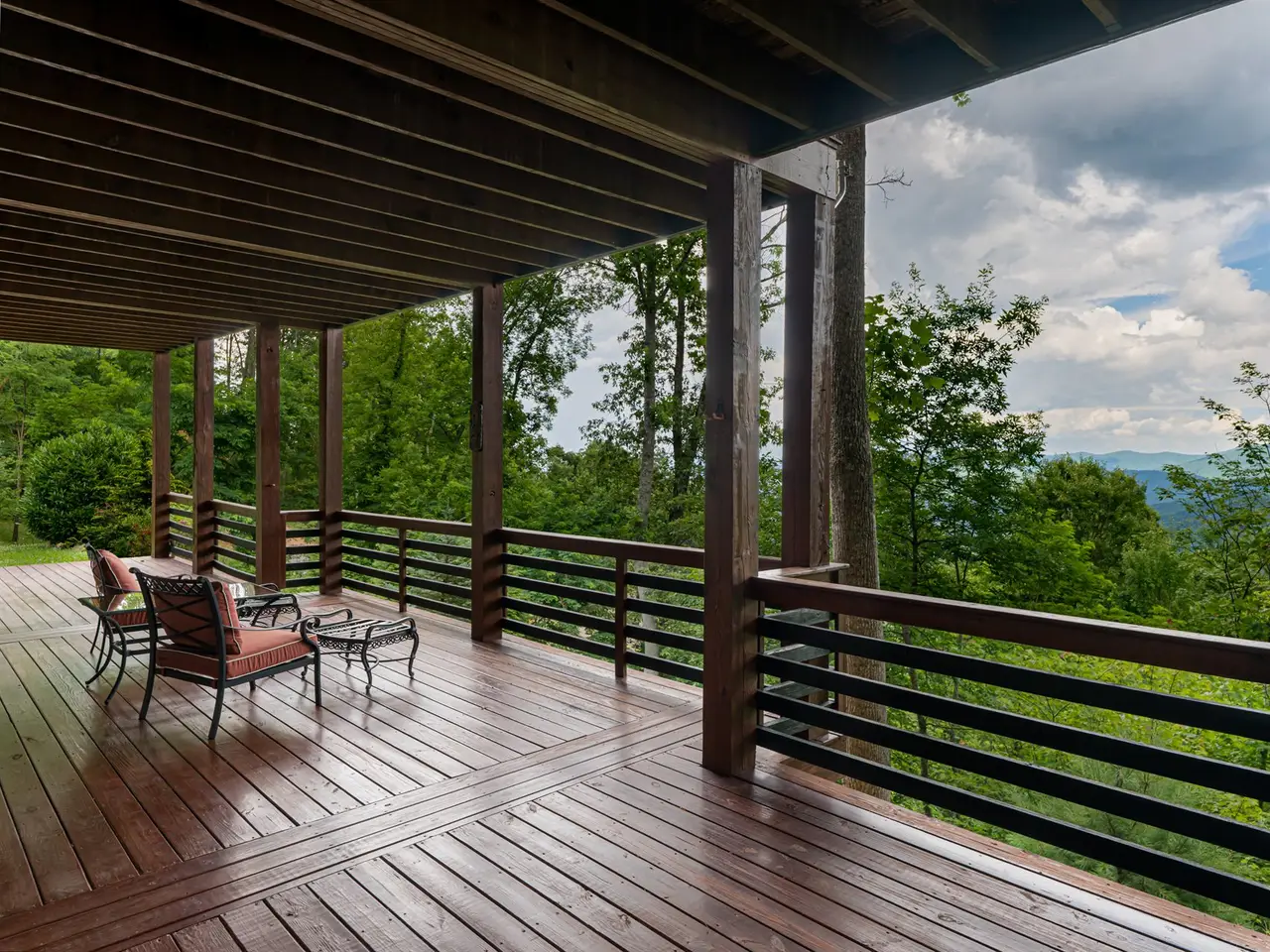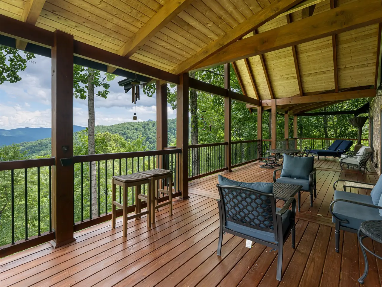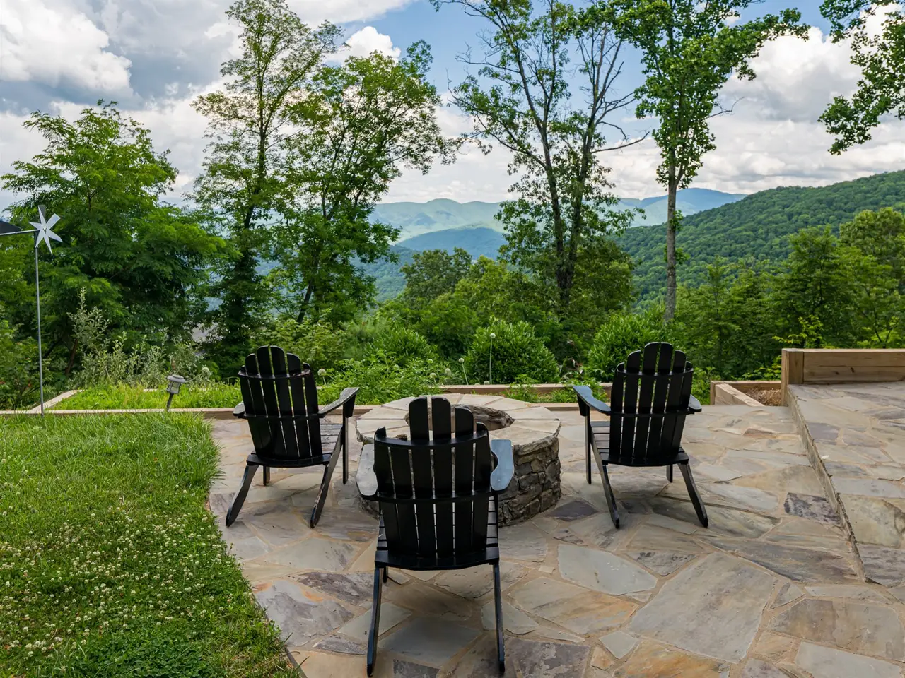 Year round views are stunning from this elevation of over 3500 feet. Main house has upper and lower primary en suites, a lower level entertainment room, additional bedroom/office with views and over 1500 feet of covered decks. The detached garage apartment and additional 2.24 buildable lot with views, makes this property impressive for large family or 3 rental income potentials. The outdoor enthusiast will enjoy the tiered garden area, small orchard, bees, fruit trees, and cutting your own wood for the stone fireplace in great room. Located inside the small, gated community of: The Bluffs at Curtis Creek and within a few miles to dining, shopping, new State Park, Blue Ridge Parkway and Asheville you can enjoy privacy with convenience.