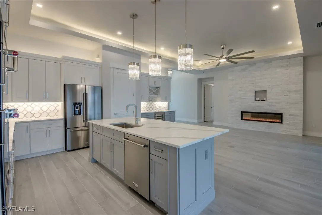 Direct Gulf Access, Luxury Lake Front Home with Gorgeous 400 Ft Intersecting Canal Views! * Brand New Construction, 2025 Built, Move-In Ready, Includes Builder's Warranty * Spacious 2535 Sq Ft, 3 Bed/3 Bath/+ Office/3 Car Garage w/Epoxy Coated Flooring * Heated Salt-Water Pool & Spa w/ Panoramic Views; Oversized Lanai w/Wall to Wall High Impact Sliders * Gourmet Kitchen w/Upgraded SS Appliances/ Quartz Countertops/Designer Backsplash & Two-Tone Cabinetry * Wine Bar w/Beverage Fridge, Under/Over Cabinet Lighting * Tray Ceilings w/Structured Rope Lighting * Porcelain Tile Flooring & Shower Surrounds, Designer Lighting/Fans Throughout * 8 Ft Interior/Exterior Doors & Sliders, High Impact Windows & Doors * Paver Drive & Walkways, Floratam Sod, Mature Landscaping W/Multiple Royal Palms, Sprinkler System * Prewired for Cable/Internet, Plumbing/Electric for Outdoor Kitchen, Alarm System, Wi Fi Extenders * Pentair Pool Equipment w/Remote & App, Concrete Underlay for Pool/Deck Pavers * 50GAL Water Heater, Concrete Tile Roof