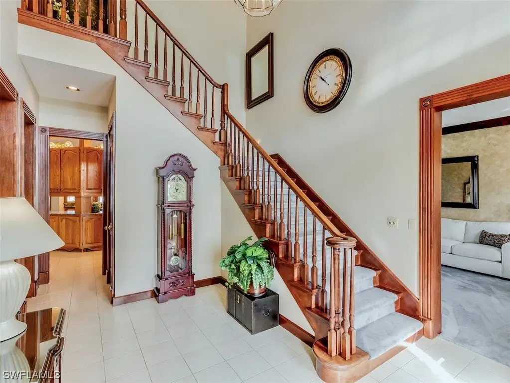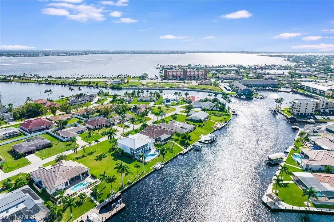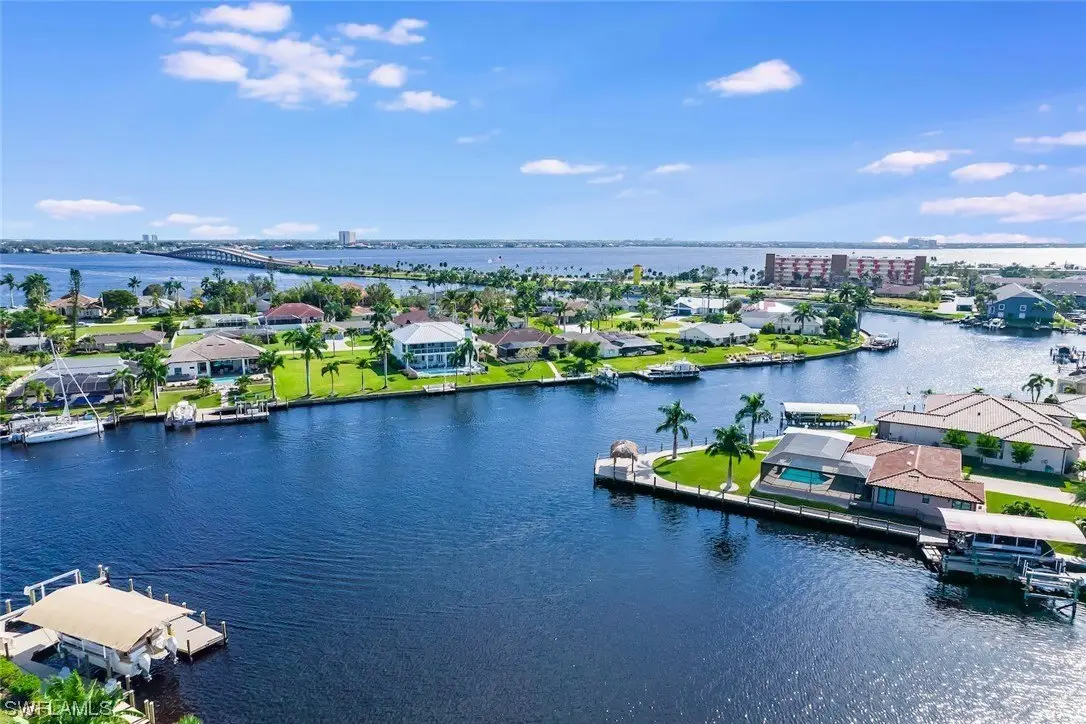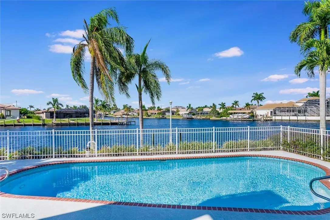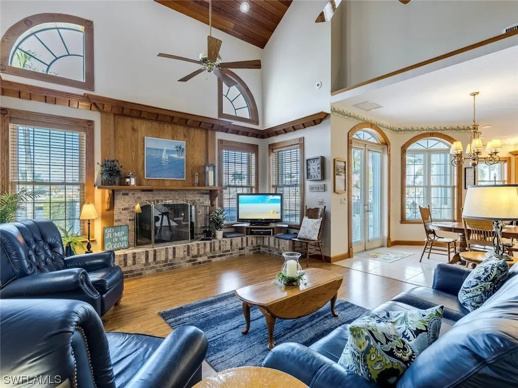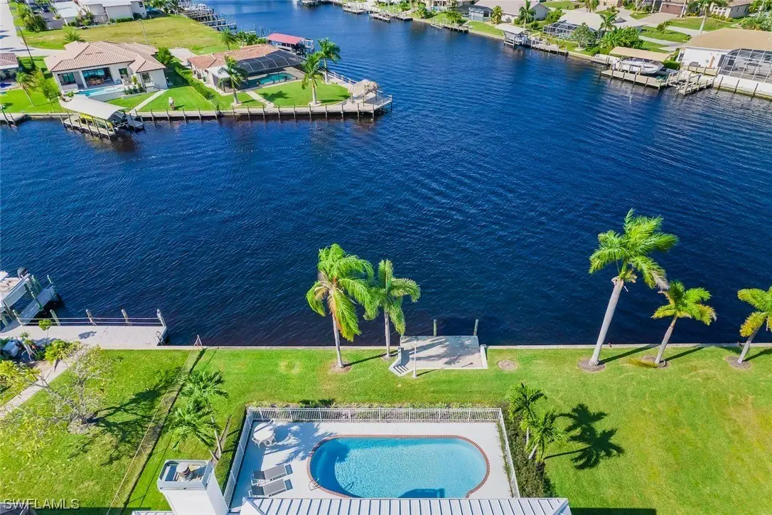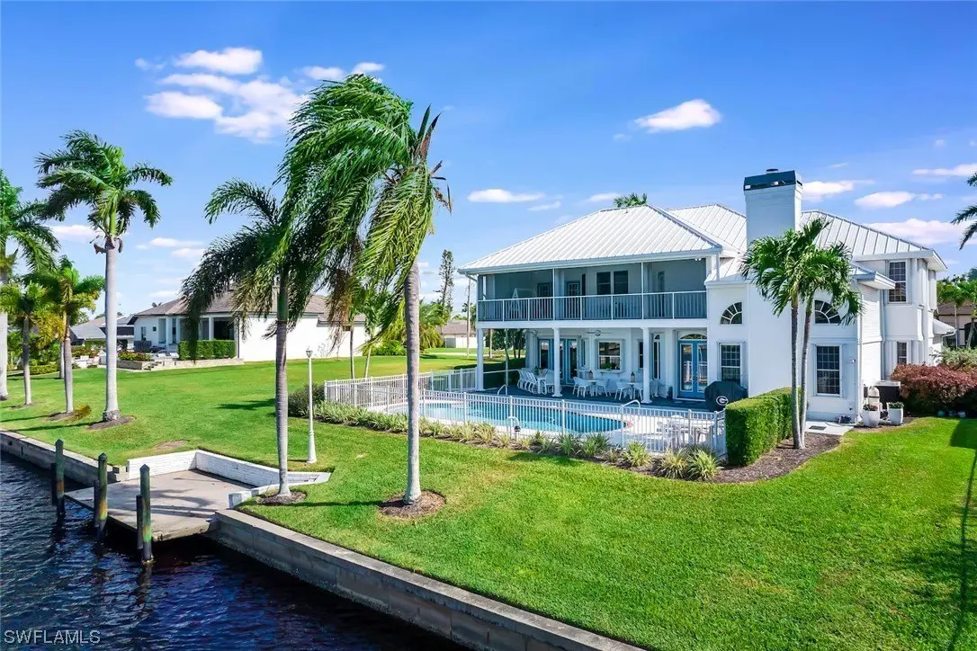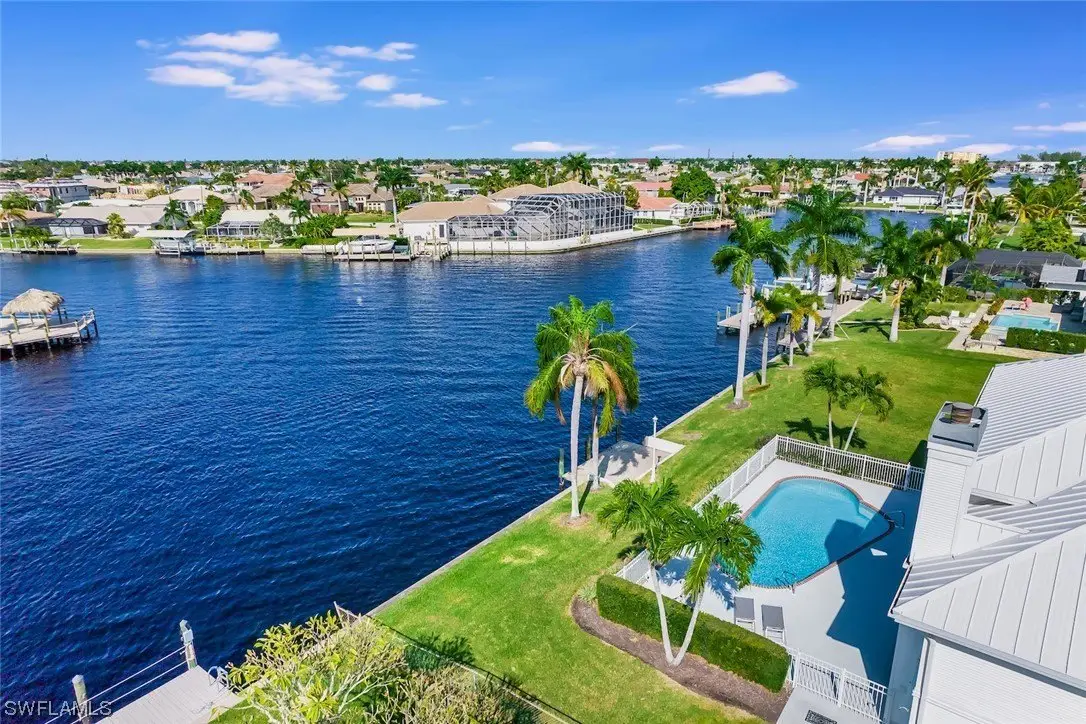Absolutely one of the best locations in Cape Coral with incredible boating access, big water views and fully furnished for your convenience. This beautiful home has been meticulously cared for and boasts a brand-new metal roof in 2023. The interior showcases exquisite craftsmanship, highlighted by custom solid wood cabinetry throughout. The gourmet kitchen is a chef's dream, featuring dual dishwashers, two ovens, marble countertops, and not one but two islands, all complemented by a breathtaking view out to the intersecting canal view. The family room impresses with a vaulted ceiling adorned with beautiful tongue and groove wood. On the second floor, a vast screened porch, offering panoramic views of the water and stunning sunsets. Upgrades abound, including dual staircases, a three-car tandem garage, a convenient laundry chute leading to a spacious laundry room, and a generously-sized multipurpose game room on the second floor that could easily be converted into an additional bedroom or used as an office. Further enhancing this residence are a wood-burning fireplace, and custom millwork throughout. This level of detail must be seen to be truly appreciated.