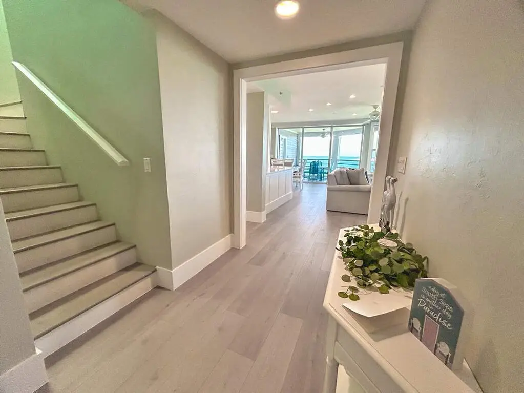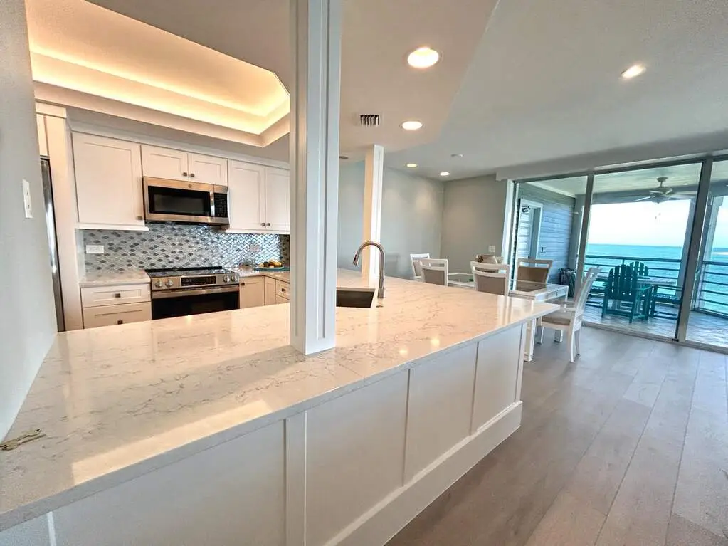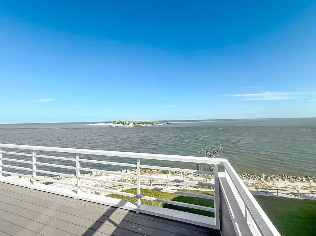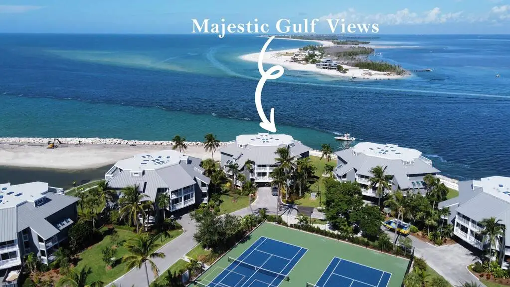 At the northern tip of Captiva, 1618 Lands End Village is situated within the "Eucalyptus" complex commanding extraordinary views across Red Fish Pass where Pine Island Sound meets the Gulf. This three-bedroom multi-level penthouse with elevator access combines spacious design, thoughtful detailing, and an exceptional island setting. The main living area opens through pocketing sliders to a generous screen lanai and balcony overlooking the channel-a perfect vantage point to take in ever-changing skies and the movement of the tides. The kitchen blends practicality and style with quartz counters, a glass decorative backsplash, farmhouse sink, and bar seating that connects naturally to the great room's open plan. Soft coastal finishes and abundant windows create a bright, easy flow that captures the surrounding water views. On this main level, an oversized guest suite features a king bed and private bath, while a second guest suite offers bunk beds ideal for family or visiting friends. The upper-level penthouse suite introduces additional storage and a private retreat complete with a morning kitchen. Its expansive ensuite bath includes a sunken tub beneath skylights, an extended vanity, and a separate walk-in shower-offering a quiet, spa-like escape.