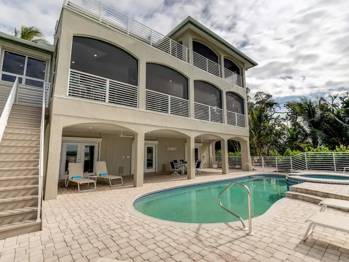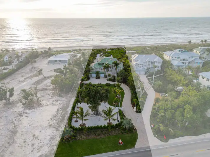 SOUTH HAVEN - Experience unparalleled tropical luxury at South Haven, a meticulously designed concrete piling home that seamlessly blends elegance and functionality. Recent enhancements include a fully remodeled kitchen, dining room, and primary bath, along with a 2023 roof replacement and premium finishes throughout. The main level features a sunlit foyer, guest accommodations, and dual guest retreats in a private wing. The redesigned kitchen boasts modern amenities and a bright dining nook, while the living room offers sweeping coastal views. Upstairs, the owner's suite captivates with Gulf of Mexico vistas, a stone-clad electric fireplace, and sophisticated woven flooring. The ground level includes a spacious garage and versatile spaces, all accessible via an elevator serving every level. Outside, Royal Palms frame the exquisitely designed pool area, complete with a sunbathing platform, covered dining, and lounging spaces. A beachside yard features a private cabana, landscaped greens, and a serene walkway to the shore. South Haven is the ultimate coastal retreat, offering exceptional craftsmanship, lush surroundings, and unforgettable sunsets.