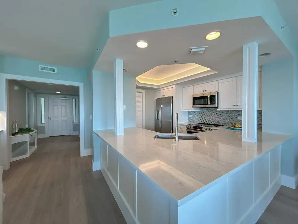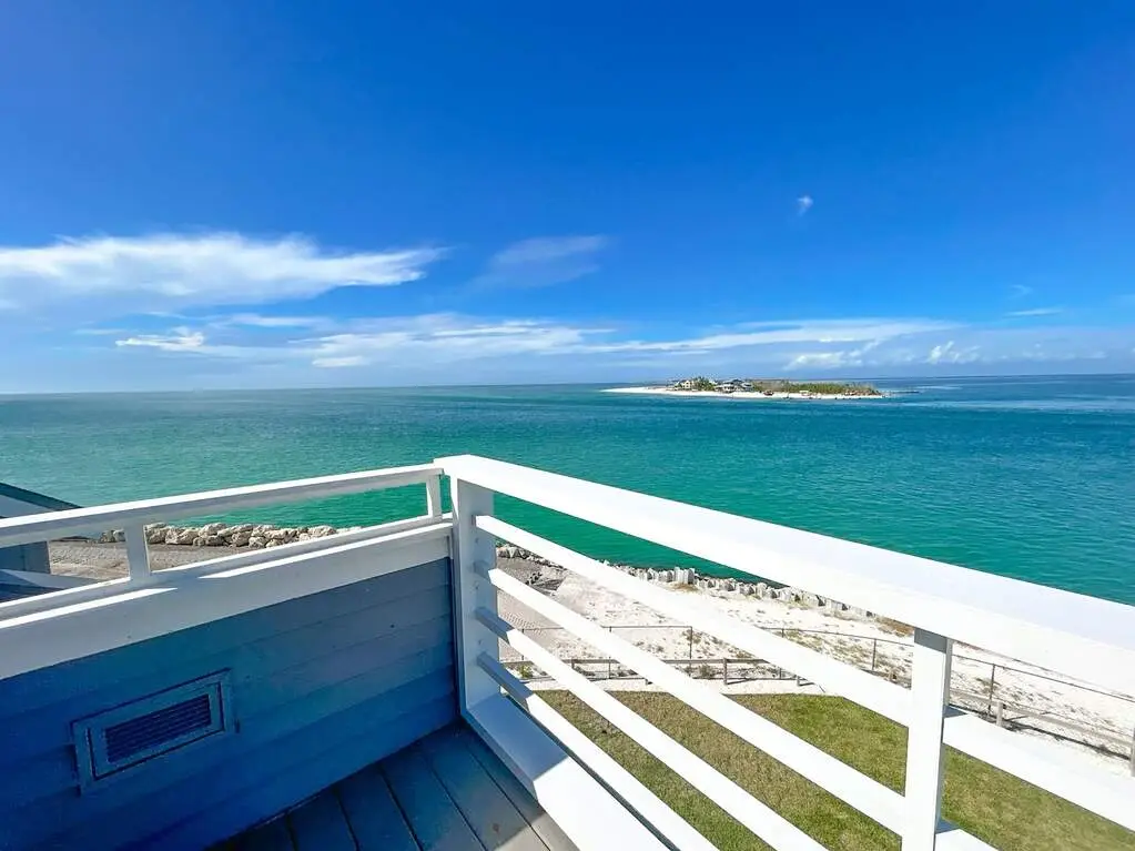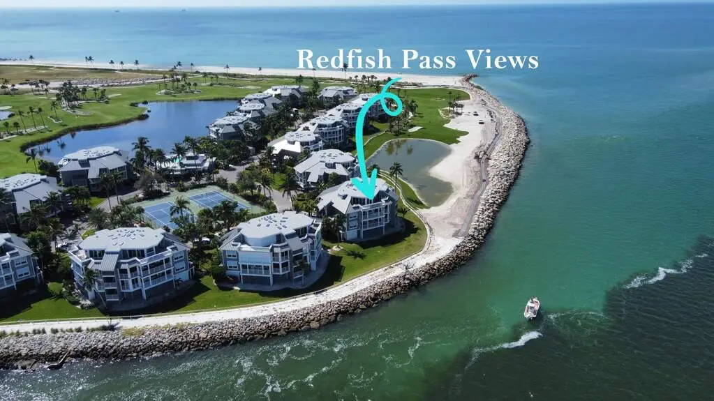 At the northern tip of Captiva, 1618 Lands End Village is situated within the "Eucalyptus" complex commanding extraordinary views across Red Fish Pass where Pine Island Sound meets the Gulf. This three-bedroom multi-level penthouse with elevator access combines spacious design, thoughtful detailing, and an exceptional island setting. The main living area opens through pocketing sliders to a generous screen lanai and balcony overlooking the channel-a perfect vantage point to take in ever-changing skies and the movement of the tides. The kitchen blends practicality and style with quartz counters, a glass decorative backsplash, farmhouse sink, and bar seating that connects naturally to the great room's open plan. Soft coastal finishes and abundant windows create a bright, easy flow that captures the surrounding water views. On this main level, an oversized guest suite features a king bed and private bath, while a second guest suite offers bunk beds ideal for family or visiting friends. The upper-level penthouse suite introduces additional storage and a private retreat complete with a morning kitchen. Its expansive ensuite bath includes a sunken tub beneath skylights, an extended vanity, and a separate walk-in shower-offering a quiet, spa-like escape.