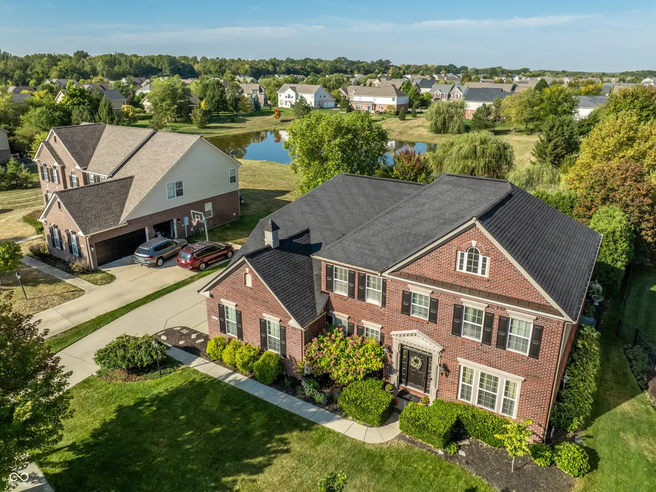 Stunning Carmel home with high-end renovations and water views! Welcome to this beautifully updated brick two-story home in the highly sought-after Carmel Clay Schools district. Designed with comfort and luxury in mind, this home blends timeless craftsmanship with modern upgrades throughout. The main level features solid oak hardwood floors and a primary suite with a completely renovated spa-like bathroom, including dual marble-topped vanities, a freestanding soaking tub, and a spacious walk-in shower. The chef's kitchen, fully renovated down to the studs in 2023, boasts custom Amish-made maple cabinetry, Quartzite countertops, a 48" commercial-grade gas range, under-cabinet lighting, and a custom butler's pantry with beverage station. A walk-in pantry provides abundant storage and organization space. Upstairs, you'll find new carpet, generous bedrooms, a large full bath, and a huge bedroom over the garage with custom built-in bunk beds (XL twins over queens) and an ensuite bathroom with walk-in shower, perfect for guests or a private retreat. The finished basement is an entertainer's dream, offering a custom home theater, 13-foot bar with dishwasher and beverage station, custom wine cellar with tasting area, game room, expansive workout room with rubber flooring & mirrored wall, 6th bedroom with egress window, and a luxury bathroom featuring a walk-in shower (with body jets). Outside, enjoy a pond lot with water views, an expansive patio with custom pergola, and an irrigation system to keep your landscaping lush. The three-car finished garage provides plenty of room for vehicles and storage. Updates include new roof & gutters (2017), upgraded attic insulation (2023), low-E glass windows, Bryant furnace/AC & whole house air filtration system, whole house water filtration system (2025), reverse osmosis system (2025), and new sump pump with backup (2025). This home offers a perfect blend of elegance, functionality & modern living all in a prime location!