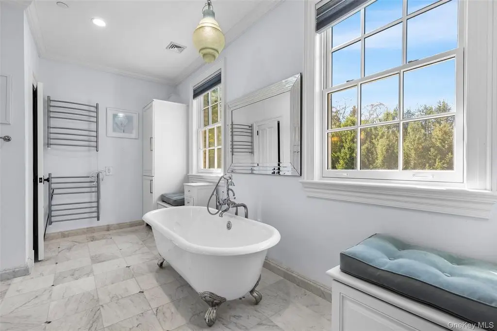 Privately gated and masterfully crafted, this exceptional custom brick estate is a showcase of timeless elegance and grand-scale living, nestled on over two acres in the heart of Chappaqua. Beyond the cobblestone apron and curbing, a sweeping driveway leads to a residence designed for both luxury and comfort, boasting soaring 10-foot ceilings, four stately fireplaces, exquisite architectural detail, and refined finishes throughout. Enter through a breathtaking grand foyer, where gleaming hardwood floors with intricate wood inlay medallion set the tone, and a dramatic three-story suspended spiral staircase anchors the home in architectural splendor. The main level is ideal for entertaining, offering a formal living room, formal dining room, an expansive family room with a custom bar, and seamless access to a private bluestone patio, perfect for indoor-outdoor gatherings. The chef's kitchen is a culinary masterpiece, featuring high-end appliances, breakfast area, butler's pantry, and dual access points to the patio. A main-floor guest/au pair suite, private office or den, and powder room complete the level. Upstairs, the serene Master Suite is a retreat unto itself, complete with a sitting area, dual walk-in closets, and a spa-like marble bath with heated towel racks, dual vanities, clawfoot soaking tub, and an oversized glass shower. Three additional generously-sized bedrooms, one with an ensuite, and a full hall bath, along with a dedicated laundry room, offer both comfort and convenience. The third floor adds a spacious game and media room, while the walk-out lower level features a gym, mudroom, recreation space, sitting area, and access to the beautifully landscaped backyard. Outside, enjoy artisan stonework, multiple patios, a gazebo, hot tub, built-in BBQ station, and lush, level grounds ideal for entertaining and play. Three heated garages, including an electric vehicle charging station, complete this extraordinary masterpiece with modern convenience and sophistication. Located just minutes from Chappaqua's charming village center, award-winning schools, fine dining, shopping, Mt. Kisco Country Club, Metro North, and major highways. This is a a rare opportunity to own one of Chappaqua's most distinguished estates, an architectural triumph of timeless sophistication and commanding presence, set within one of Westchester's most coveted communities.