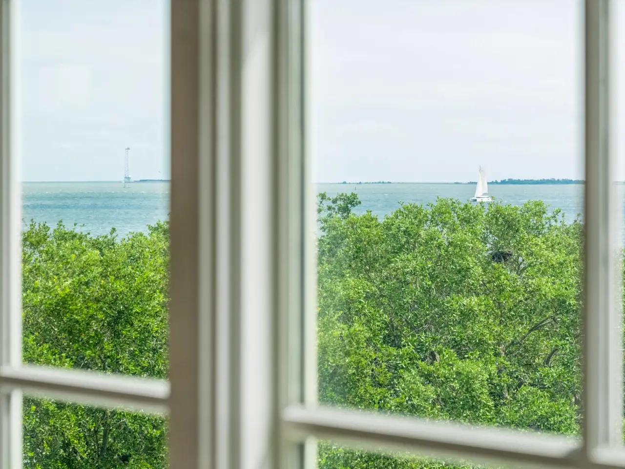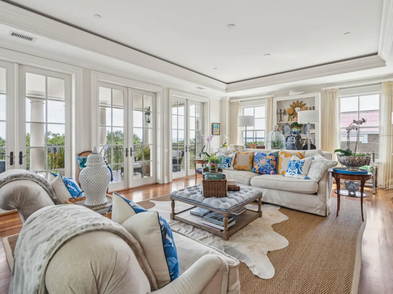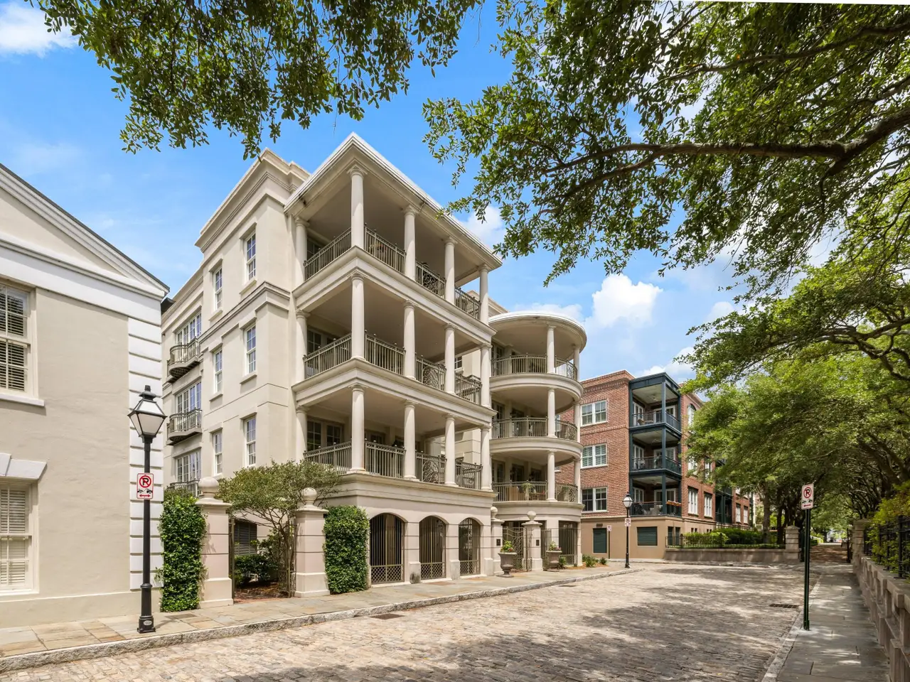 Rare, elegant penthouse-level apartment offering southern views of the Charleston Harbor from the living/dining room and terrace, with historic steeple views from the primary suite. This spacious residence offers the very best apartment floor plan in the city. Luxurious trim and mouldings throughout, this fine apartment lives like a grand home. Well-proportioned formal space with separate formal living room, and dining room divided by a mahogany paneled wet bar and storage. The side hall gallery connects the formal and informal spaces with abundant storage. The well-appointed kitchen offers a separate breakfast area with views of the harbor and beautiful sunrises. Adjacent to the kitchen is a library with mahogany built-ins and another fireplace perfect for evenings or desk working. The bedroom wing offers a comfortable guest bedroom with en suite bath. The luxurious primary suite features another fireplace with abundant light throughout. This suite is unique with two separate baths and two walk-in closets, all en suite. With its prime location, walkable to the very best restaurants and shopping, along with two garage spaces below, this luxurious residence is hands above any in the city.