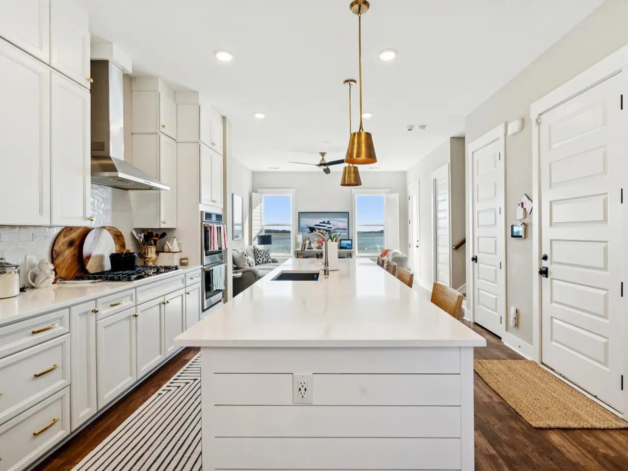 Gourmet kitchen with gas range, stainless-steel hood, and quartz counters