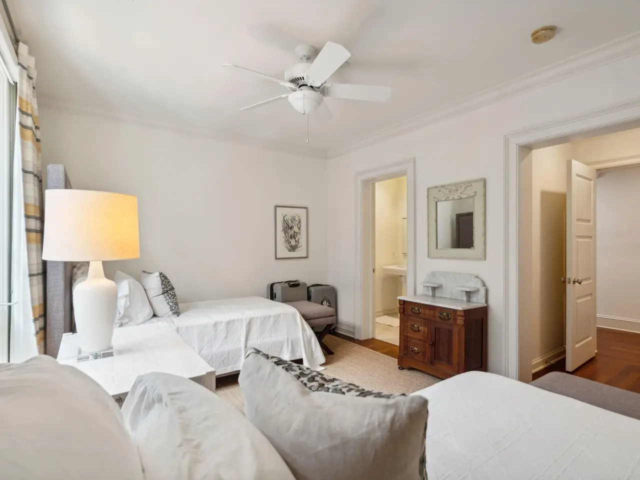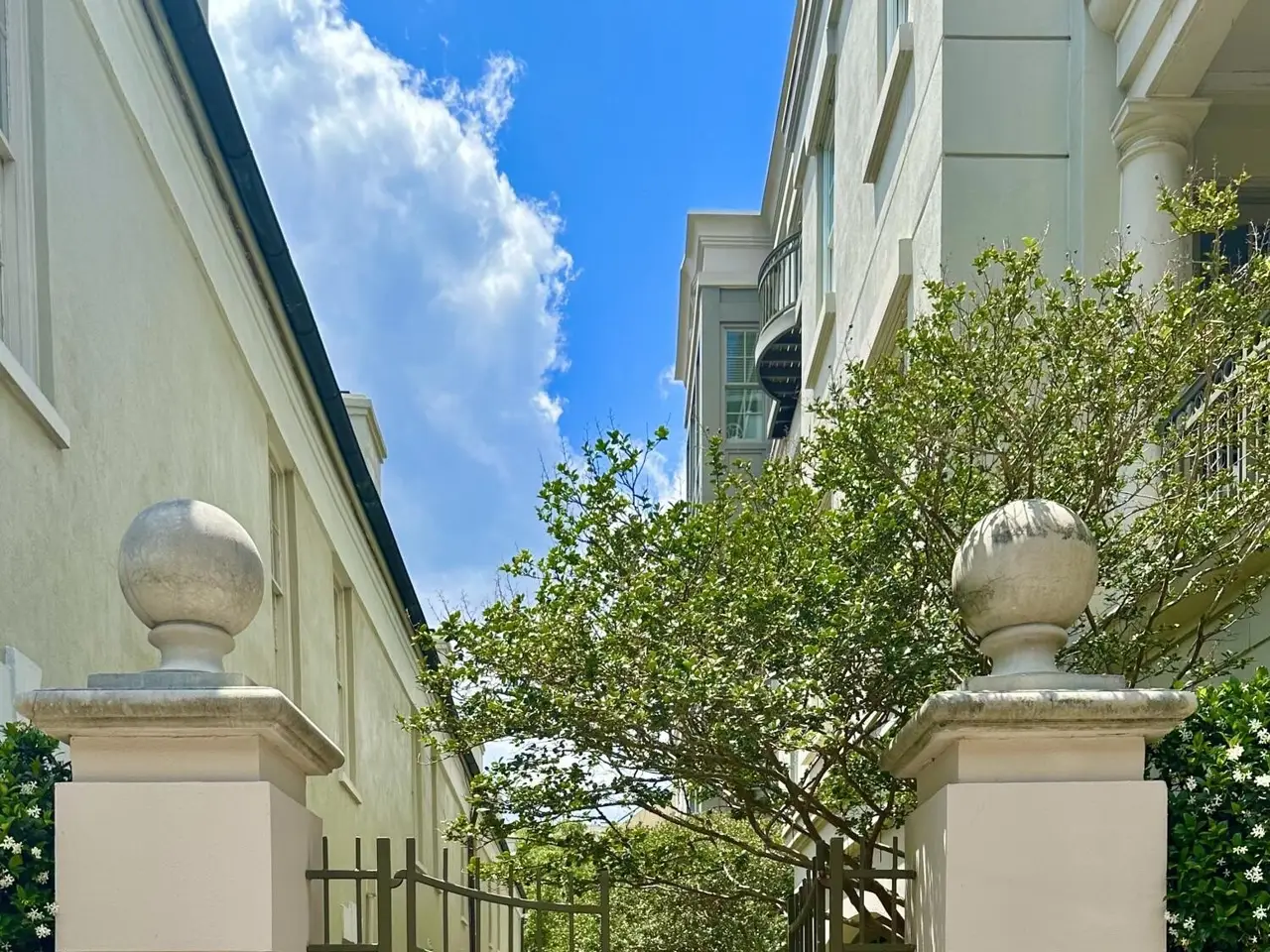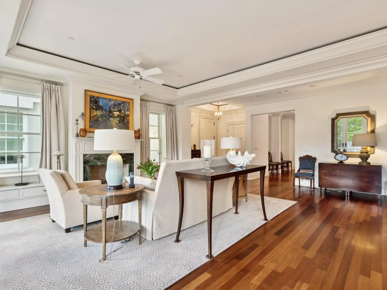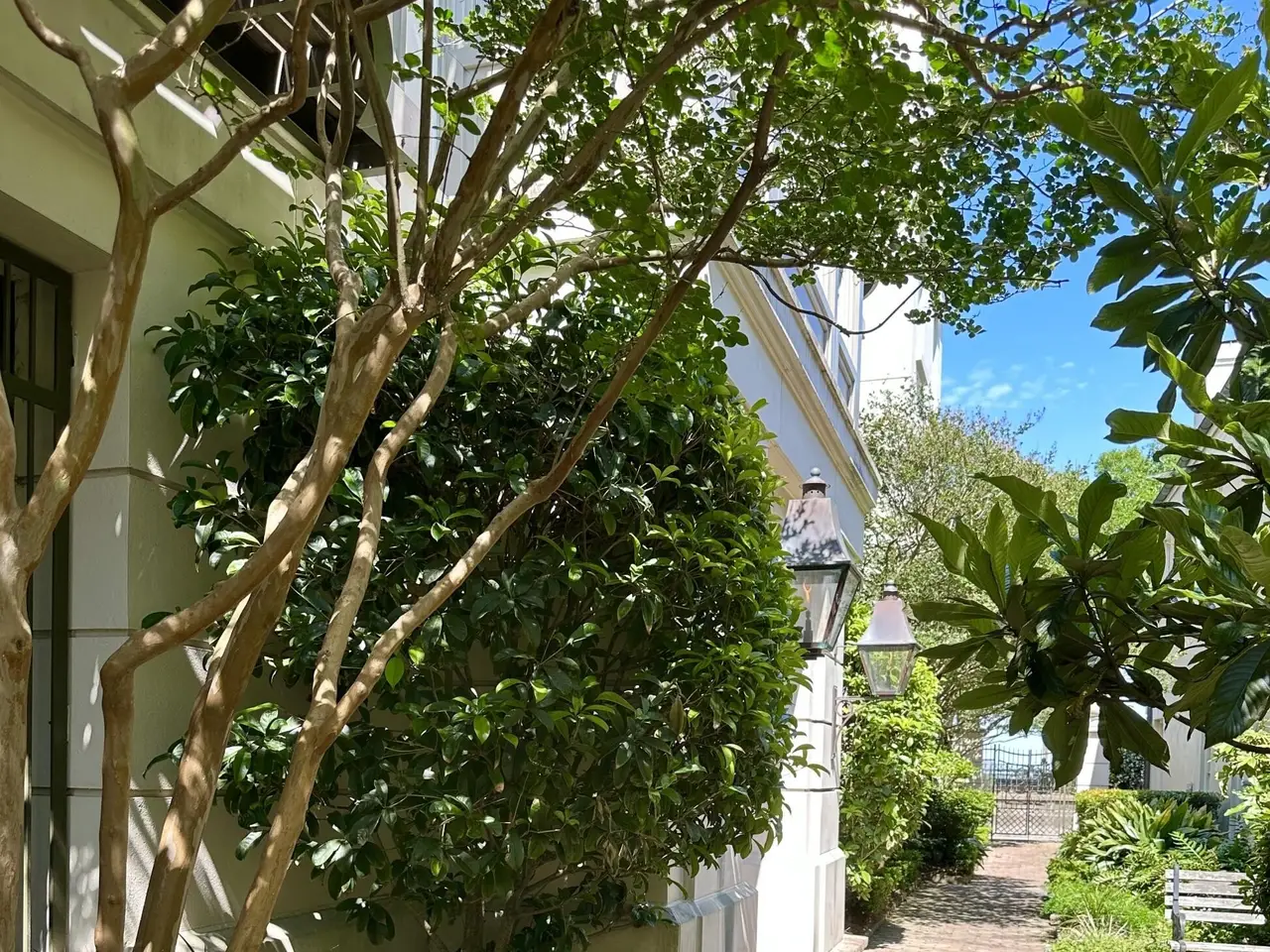 Factors Walk: the best there is in location, style, and maintenance-free luxury. Designed by Goff D'antonio Architects with historic Charleston as inspiration, this Classical Revival building has become a waterfront landmark. Distinguished by triple tiered columned porches overlooking the park, the Palladian style is continued in limestone-trimmed true stucco construction on a piano noble base. Apartment 3A is the largest of only 7 residences and runs the full depth of the building from the front piazza to a solarium at the rear. Parkside entry for guests with stone steps and gas lanterns. A coded elevator is accessed from secured garage parking, or from the gated garden entry. Grand rooms with floor to ceiling windows. Spectacular kitchen with fine cabinetry, three fireplaces, mahogany paneled elevator, piazza with columns and stone flooring, hurricane proof windows and doors, primary bedroom with fireplace and sitting room/office, building and residence security systems. Currently set up as a two bedroom, the library can easily be converted back to third bedroom.