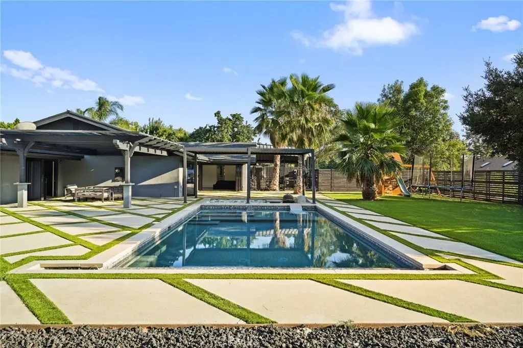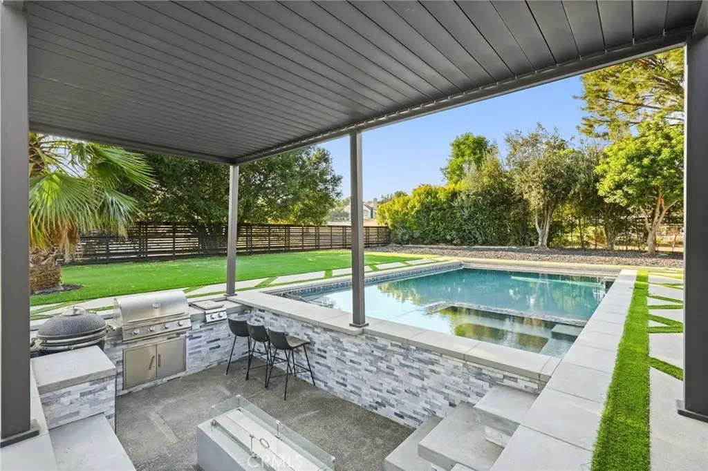 Resort-style backyard with pool, spa, fire pit, and built-in barbecue center