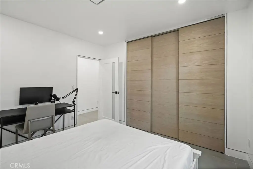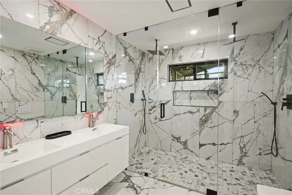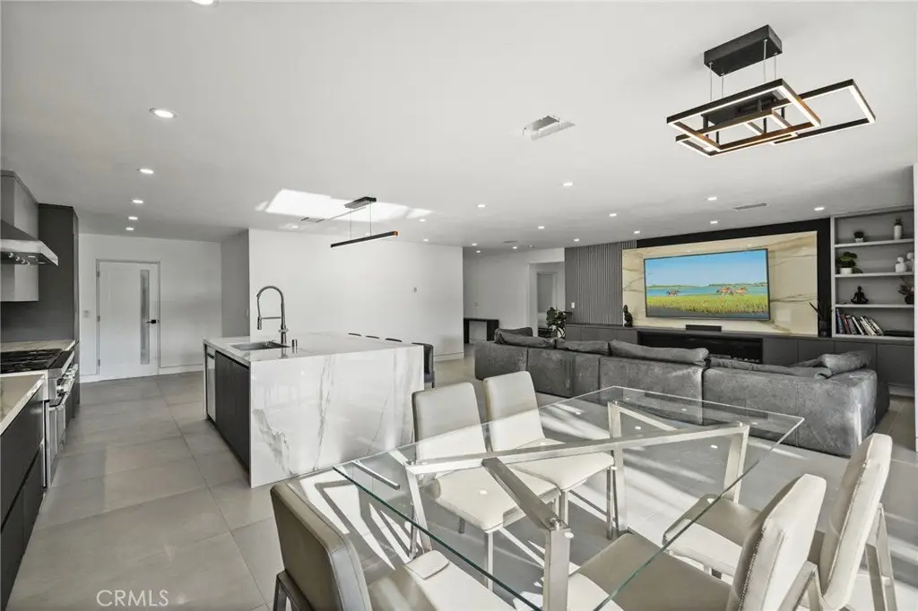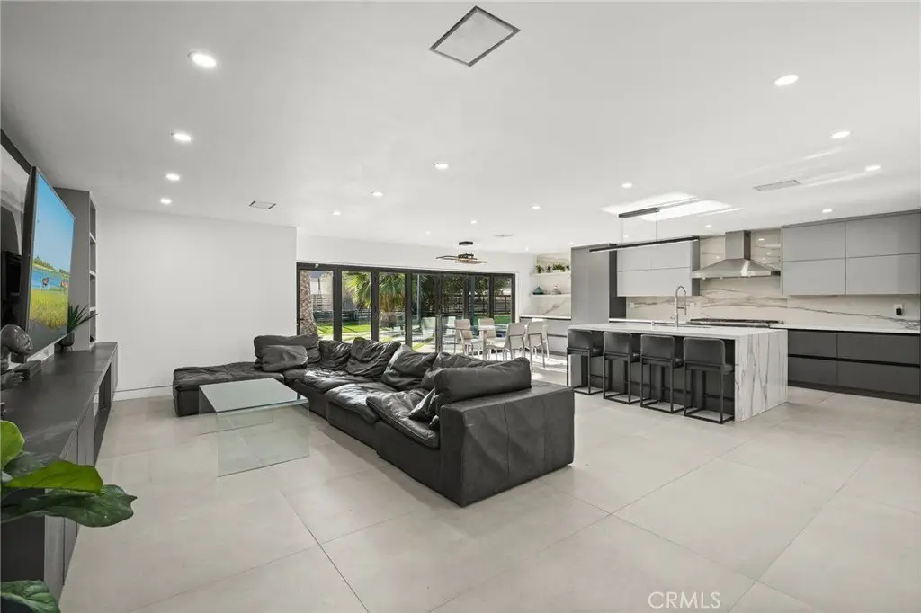 Picture-Perfect Modern Estate in Prime Chatsworth Neighborhood with ADU Potential! Welcome to this sprawling, single-story showpiece located in one of Chatsworth's most sought-after neighborhoods. Designed with a sleek, modern aesthetic, this minimalistic contemporary residence showcases minimalist interior finishes and exceptional craftsmanship throughout. Step into a seamless open floor plan where the living room impresses with a custom TV wall featuring built-in cabinetry, a dramatic slab backdrop, and a sleek electric fireplace. A full wall of windows floods the space with natural light, beautifully complementing the European grey tile floors, and modern finish throughout. The space flows effortlessly into a chef’s dream kitchen outfitted with a massive waterfall island, two-tone matte lacquer cabinetry, quartz countertops, and top-of-the-line Thermador appliances, including a built-in fridge and open shelving. Accordion-style glass pivot doors blur the lines between indoor and outdoor living, opening wide to reveal a resort-style backyard. Set on a massive, usable lot, the outdoor space is your private oasis, complete with modern landscaping, a sparkling pool and spa, sunken fire pit, built-in barbecue center with a Big Green Egg, and HUGE turf and concrete areas. The lot also includes RV access and ample space for an ADU. A dedicated pet-friendly area with privacy fencing ensures your furry friends have their own secure sanctuary. This 4-bedroom, 2.5-bathroom home features a luxurious primary suite reminiscent of a five-star resort. Enjoy serene backyard views through retractable accordion doors, and unwind in the spa-inspired en-suite bathroom adorned with 24”x48” porcelain tiles, black-veined accents, a massive walk-in shower with dual rain showers, and his-and-hers vanities. A spacious walk-in closet completes this dream retreat. Additional highlights include: Designer ocean-blue tiled guest bathroom with floating vanity and tub/shower combo. A private half bath in the fourth bedroom, perfect for guests or office use. Bonus family/media room adjacent to the kitchen, ideal for movie nights. 3-car garage with window views into the home and direct access to the living area. Whether you’re entertaining, relaxing, or envisioning future expansion with an ADU, this home delivers on every level. Don’t miss the opportunity to own this exceptional property in one of the Valley’s most desirable communities!