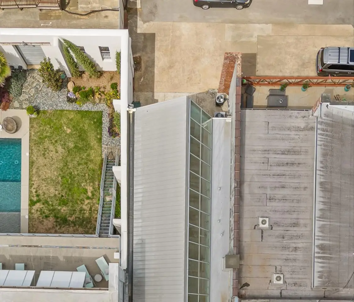 An intimate, European-inspired courtyard connects the front building with the rear studio. This courtyard features beautiful stonework as well as a mosaic mural covering the entire south wall. These mosaics, and others interspersed throughout the property, are originals created by the owners. This central space is perfect for quiet reflection or big parties (but the adjoining catering kitchen encourages entertaining)