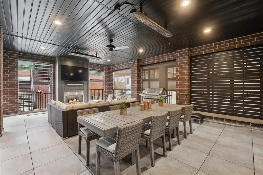 Outdoor covered patio with gas-powered fireplace