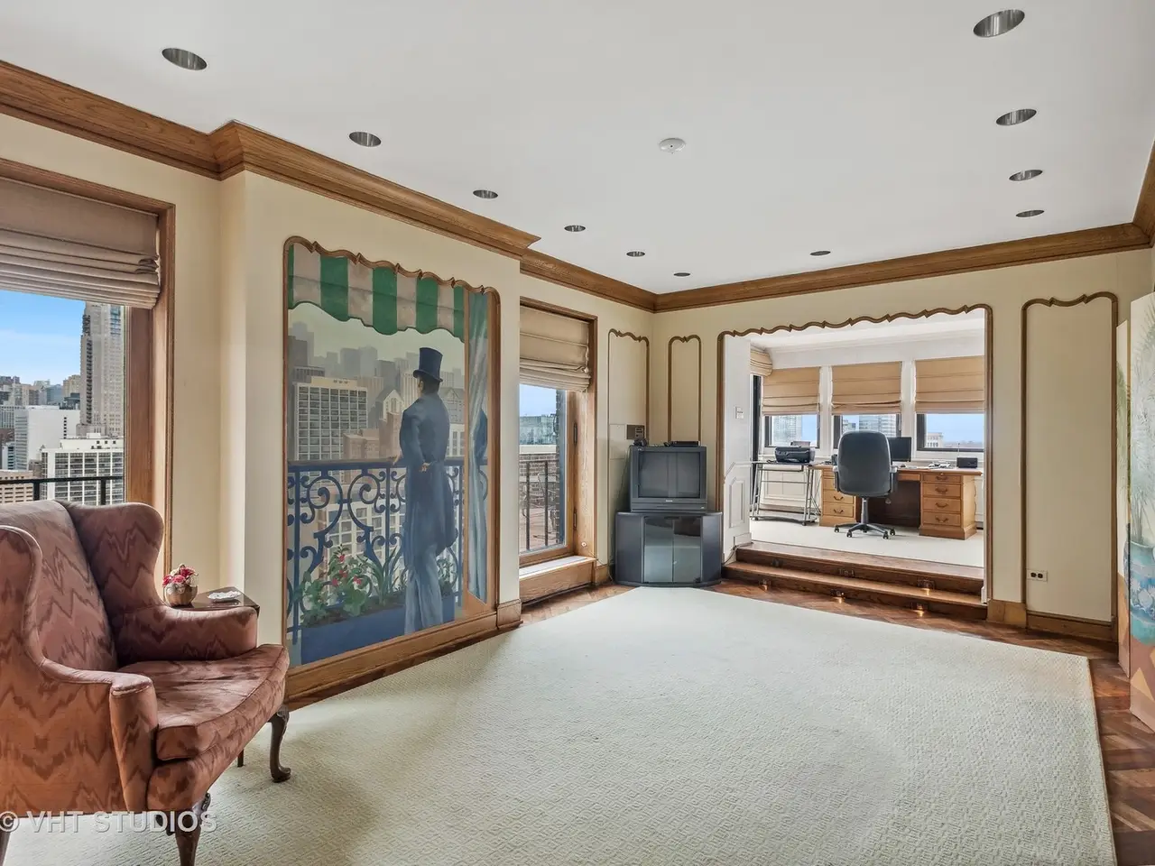 Huge 5327 sf duplex home with a 200+ sf terrace. Former home of Samuel Insul and Ray Kroc- offers panoramic wrap around views of lake and city. Home needs some updating but is priced accordingly. Amazing mural commissioned by Ray and Joan Kroc graces the circular stairway that leads to the second floor. Wood burning fireplace in the living room. Huge modern kitchen and a breakfast room with a wonderful lake view from the built-in banquette. Great home for entertaining and large enough for a family. Parking options close by.