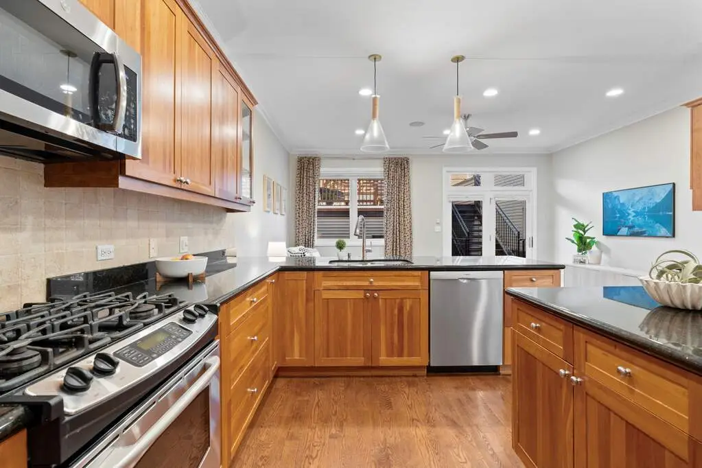 Perfectly positioned in the heart of Bucktown, directly across from Holstein Park, this stunning 4-bedroom, 3.1-bath full masonry home offers the ideal blend of elegance, comfort, and city convenience. Step inside to a sun-drenched living room highlighted by a charming picture window overlooking the park and a cozy wood-burning fireplace, seamlessly flowing into a sophisticated dining area. The chef's kitchen is designed for both everyday living and entertaining, featuring abundant cabinetry, a full pantry, expansive counter space, an eat-in breakfast bar, and a central island that opens into the spacious family room. Sliding glass doors extend the living space outdoors to a large Trex deck-ideal for grilling and al fresco dining-with stairs leading up to a beautifully appointed garage roof deck with pergola. Upstairs, discover three bright bedrooms, including a luxurious primary suite with generous closets and a spa-inspired bath boasting a soaking tub, oversized shower, dual vanities, ample storage, and natural light from a skylight. The two additional bedrooms share a thoughtfully designed bathroom with double sinks and a separate shower/toilet area. The lower level offers exceptional versatility with a sprawling recreation room, gas fireplace, built-in bar with wine fridge, storage closets galore, and space for relaxing or entertaining. A fourth bedroom with a full bath makes an ideal guest suite or home office. Additional highlights include a large laundry room, grand mud area, irrigated front lawn and a two-car garage. Enjoy the vibrant Bucktown lifestyle just outside your door, with Holstein Park's pool, playground, and green spaces serving as an extension of your backyard, plus easy access to the Blue Line for seamless commuting.