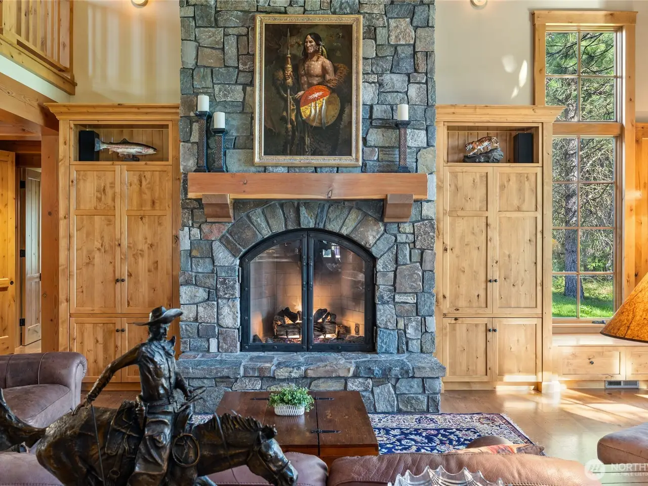 Floor-to-ceiling stone fireplace