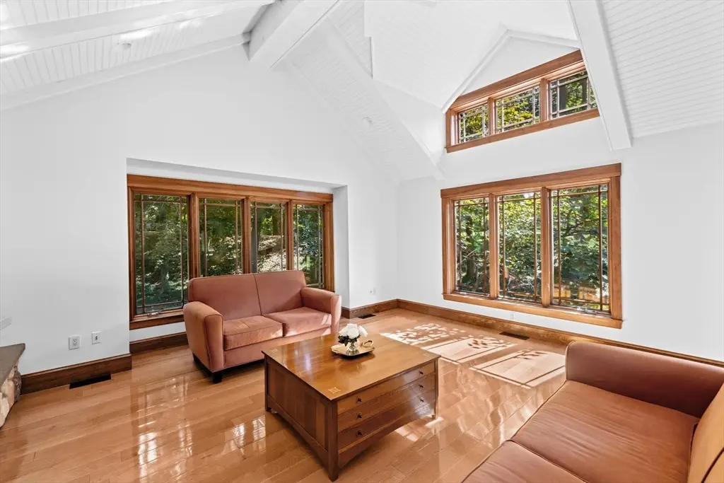Nestled on an enclave of 4 homes in a sought-after location between Cohasset Village and Sandy Beach, this lovely four-bedroom home combines Vermont-like charm with the ease of one story coastal living. The open floor plan features a chef's kitchen with walk-in pantry, a dining area, and a sunlit living room with soaring ceilings and a dramatic stone fireplace. The first-floor primary suite includes a spacious walk-in closet and full bath, while a second bedroom and bath open directly to the backyard. The walk-out lower level offers two additional bedrooms, a full bath, and a flexible living space. A screened-in porch with a gas fireplace overlooks the tranquil backyard, complete with a deck, waterfall feature, and a large side yard. With a one-car garage and an sought after location close to the village, beaches, and commuter rail to Boston, this home is a serene retreat in the heart of Cohasset.