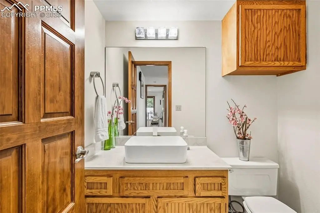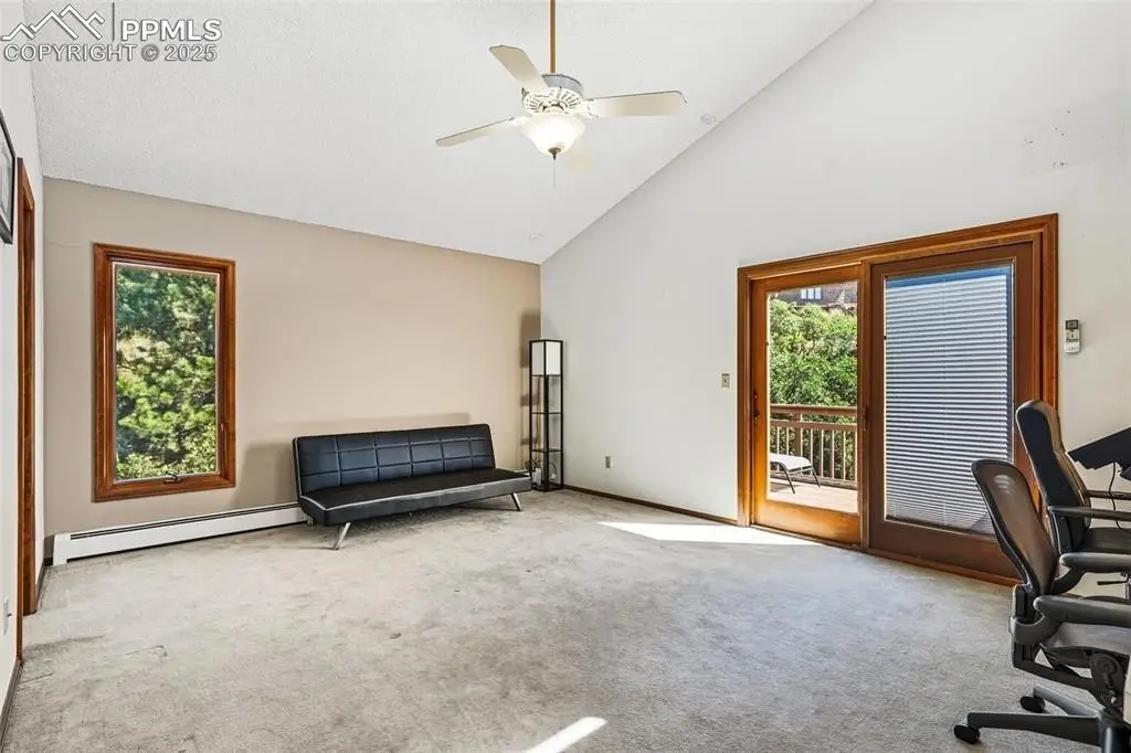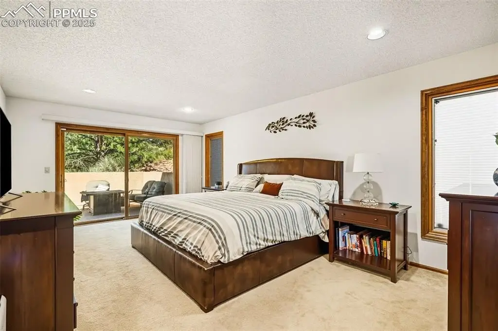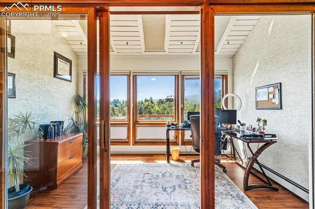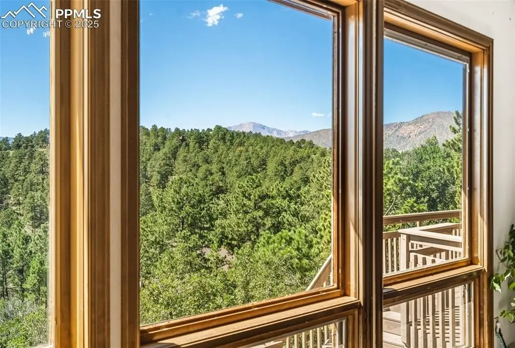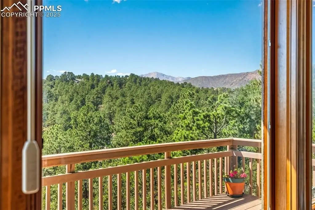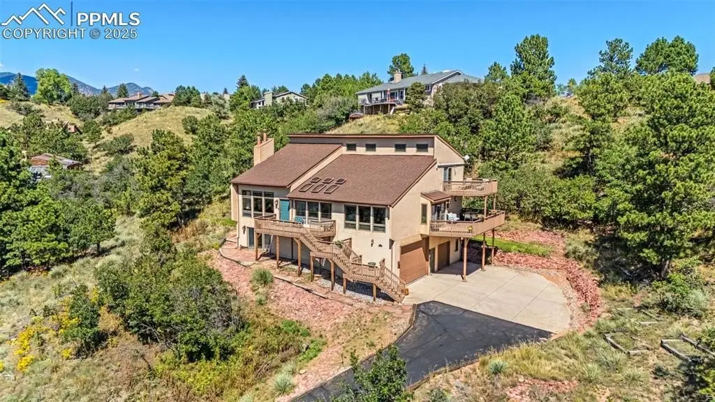 Nestled in the desirable Oak Hills neighborhood in Northwest Colorado Springs, this one-of-a-kind home offers breathtaking mountain, city, and bluff views from every window. Set on over an acre, the property delivers more than 1,200 sq ft of deck and patio space for the ultimate Colorado outdoor living experience. Inside, the main-level master suite features a spacious 5-piece bath, walk-in closet, and direct access to its own private deck with hot tub. A newly converted office with skylights and fresh finishes showcases dramatic mountain views, while a striking living room with fireplace and hand-painted tile floors by a local artist serves as a centerpiece. The expansive dining room and open kitchen with island, stainless steel appliances, and breakfast nook flow seamlessly to the deck for outdoor dining or entertaining. A family room with a wall of windows frames the sweeping vistas, creating an ideal gathering space. Upstairs, a versatile loft with private deck and adjacent ¾ bath is perfect for guests, an office, or playroom, and is complemented by two bedrooms, a full dual-vanity bathroom, and a charming reading loft. The oversized heated garage features its own zone and tall door for a conversion van. The walkout basement offers a spacious rec room with wet bar, projector screen, bedroom, ¾ bath, and large wine cellar/storage room. Updates include a new boiler (Sept 2024), newer mini-split A/C (2021), stucco exterior, and fresh touches throughout. With its rare privacy, custom floorplan, and resort-like feel, this home evokes the charm of a mountain retreat while being just minutes from I-25, shopping, hiking and biking trails, schools and parks. Located in award-winning Academy District 20, this home combines unique character with unmatched convenience. Don’t miss your chance to experience this extraordinary property—schedule your private showing today!