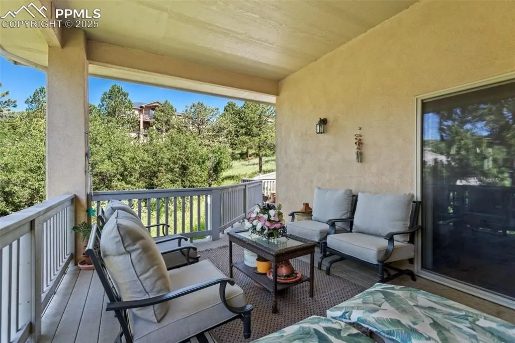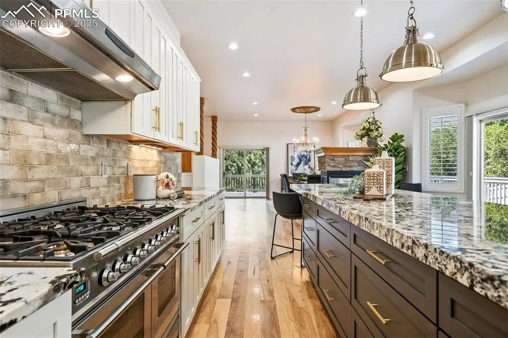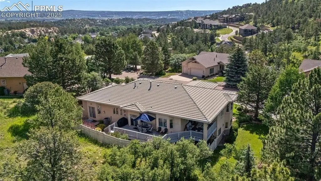 Stunning ranch-style home on a private cul-de-sac in Peregrine, features true main level living and is designed to capture the essence of Colorado living. From the moment you enter, soaring beamed ceilings, alder doors and rich hickory floors set an elegant tone in the open-concept great room complete with a wall of windows framing the foothill views. At the heart of the home is a beautifully remodeled kitchen featuring striking Patagonia granite, a sprawling center island, Italian Ilve professional range with 6 burner cooktop and dual ovens, and abundant cabinets. The adjoining dining room, anchored by a dual-sided fireplace, creates an inviting setting for gatherings. The luxurious primary suite is a retreat of its own, with a private walkout to the backyard, a cozy gas fireplace, and a spa-inspired bath featuring a jetted tub, oversized walk-in shower, and walk-in closet. A secondary bedroom with adjoining bath offers the perfect guest suite or private office. The main-level laundry is conveniently located. The walkout lower level was made for entertaining, with a sprawling family room, gas fireplace, wet bar, and seamless access to the patio. Two additional bedrooms, and two full bathrooms provide comfort and privacy. The versatile flex room is ideal for a gym, dance studio, or hobby space. Generous storage completes the level. Step outside to experience the tranquility of this truly special location. Relax on the expansive deck overlooking a cascading water feature with the backdrop of towering ponderosa pines and scrub oak. Located minutes to award winning District 20 schools, shopping and dining with easy access to I-25. This home embodies the perfect balance of luxury, functionality, and natural beauty—truly the ideal Colorado lifestyle.