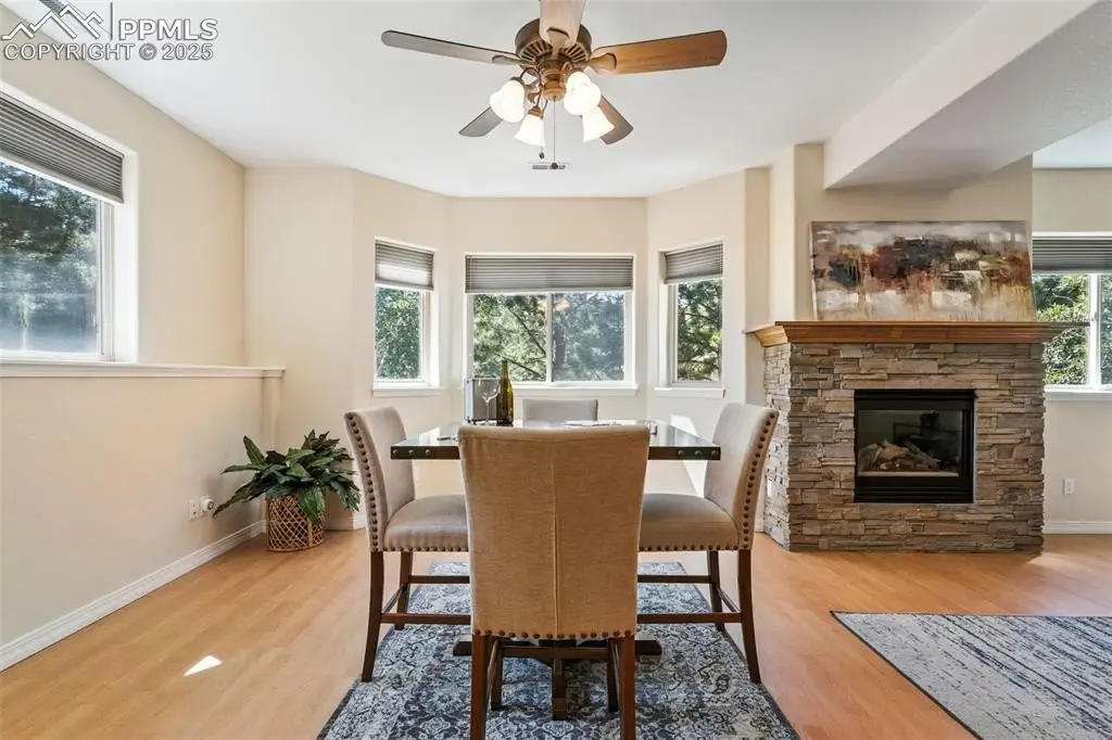 - Dual-sided fireplace in dining room