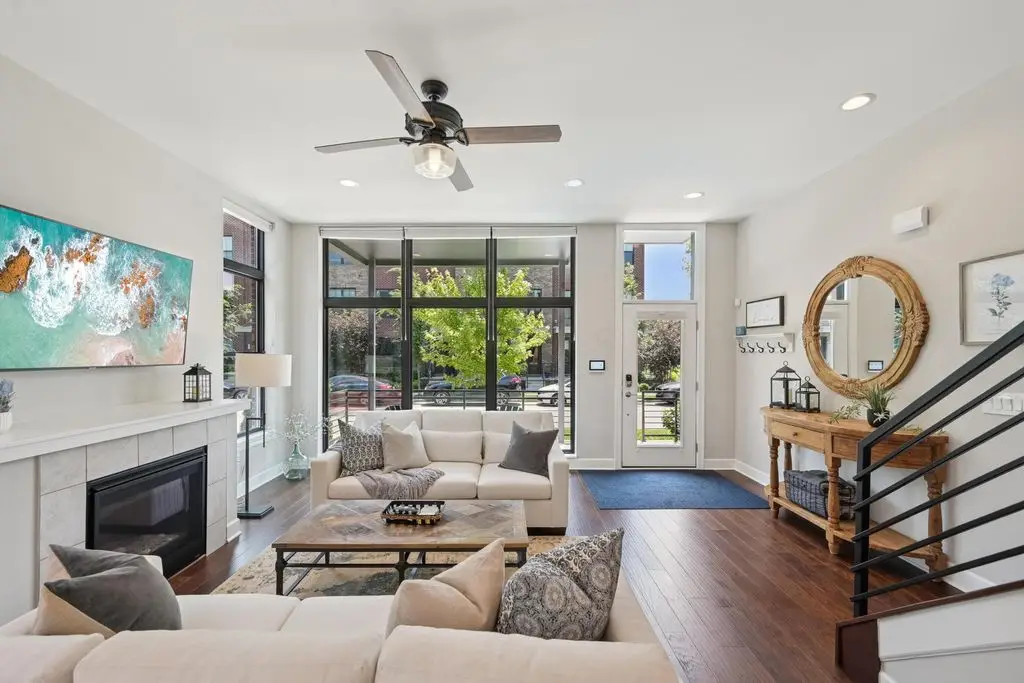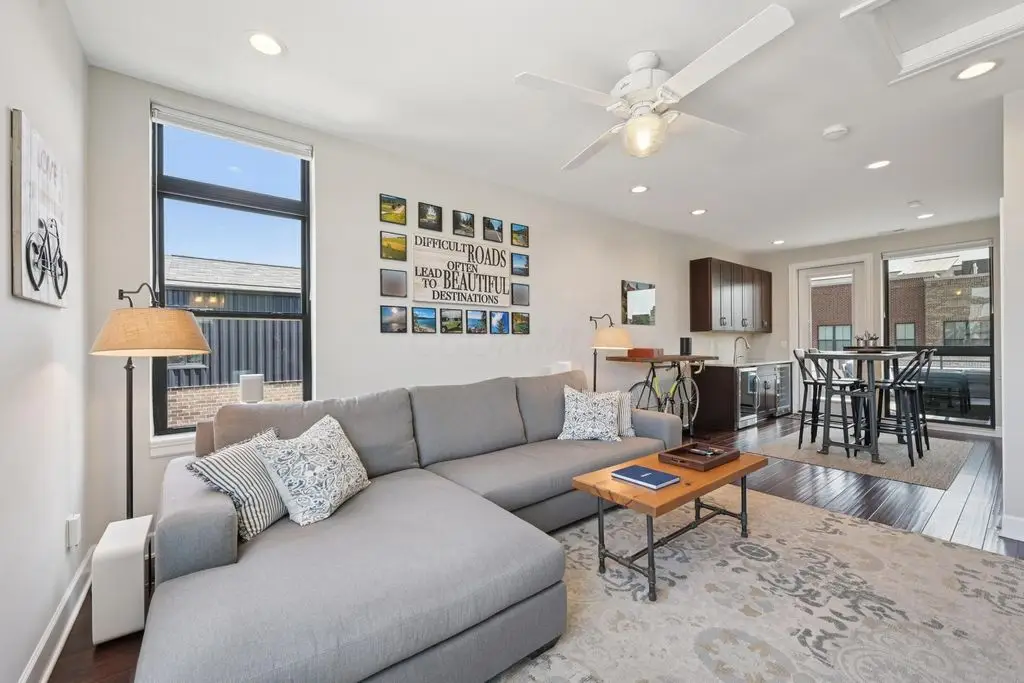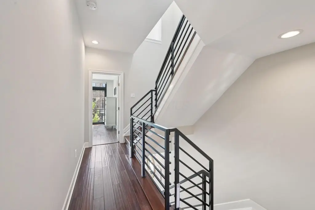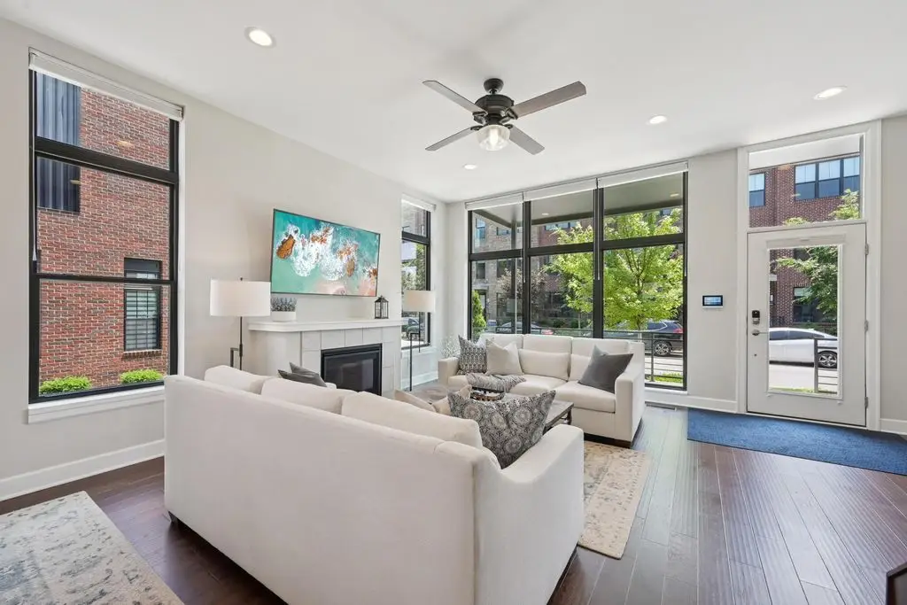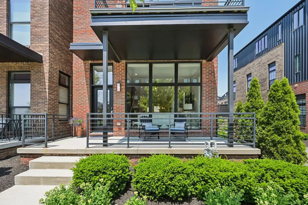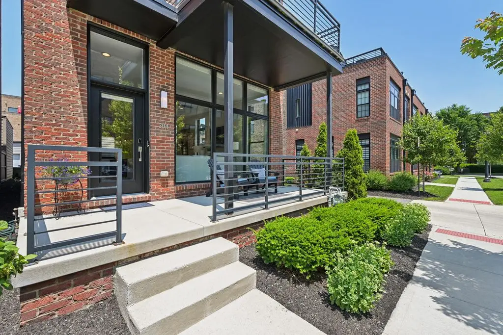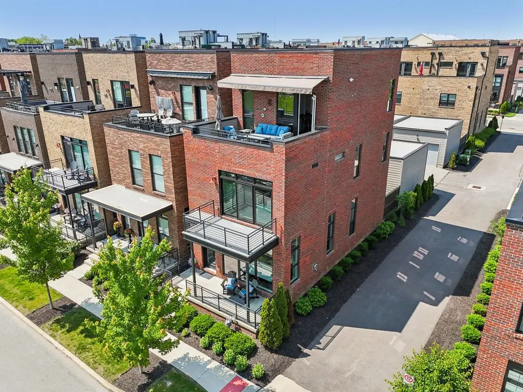 OPEN HOUSE! 9/20,1-3PM. This rare BRIGHT, end unit-with NO SHARED WALLS, has light shining brightly with wonderful views! FOUR LEVELS are finished spaces for you to appreciate including THREE w/ OUTSIDE SEATING. The FIRST FLOOR includes an open concept living room with a fireplace, chef's kitchen, granite countertops, modern stainless-steel appliances, and half bath. The SECOND FLOOR offers a private balcony with relaxing views. from the primary suite, an en suite bathroom with a dual vanity quartz countertop, spa-like shower, two huge walk-in closets. The laundry room, and a second bedroom or office down the hallway. The THIRD ROOFTOP FLOOR boasts a flex space for a bedroom, relaxing or entertaining, a full bathroom, a wet bar, and an outside lounge area-with a remote retractable awning and a view of the city skyline.The LOWER LEVEL provides yet another large room to entertain with, a bedroom, and a full bathroom. Everything you'd want in a community is available for you: Clubhouse, pools, state-of-the-art gym, coffee house and more... Enjoy LUXURY URBAN LIVING here- close to all that Columbus has to offer. *TAX ABATEMENT