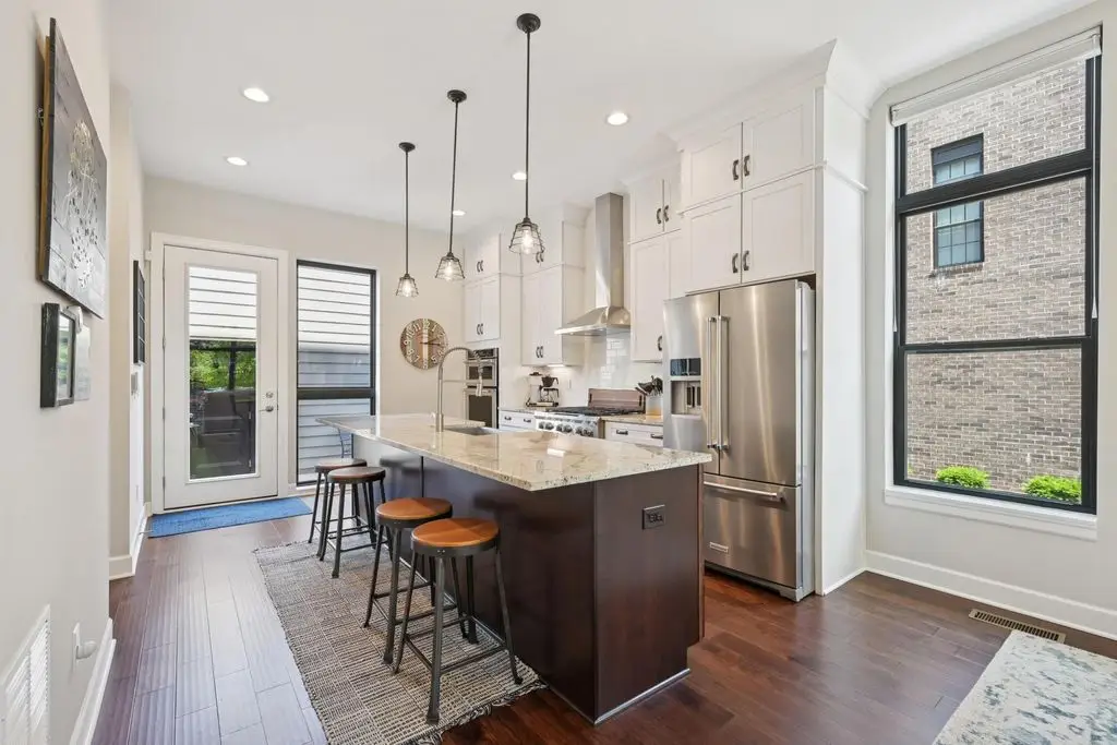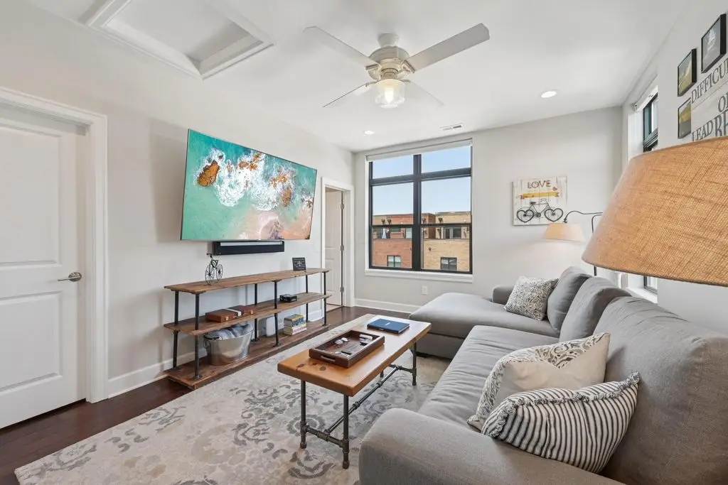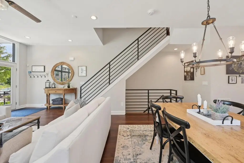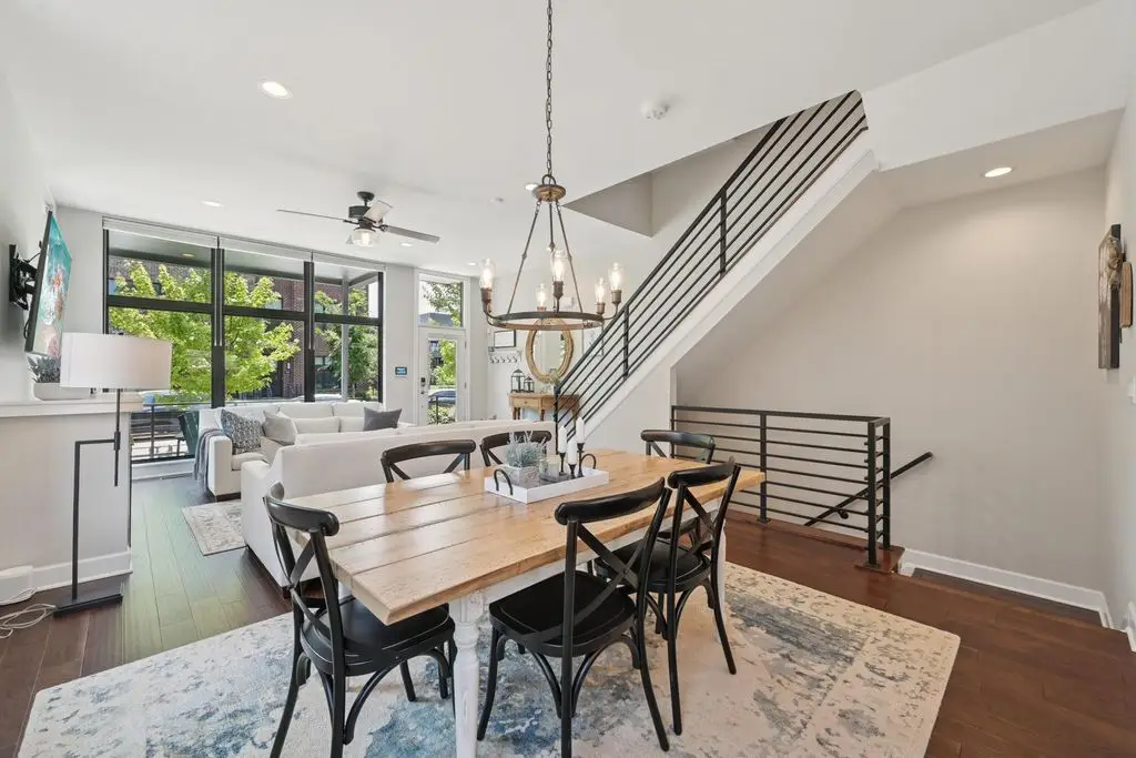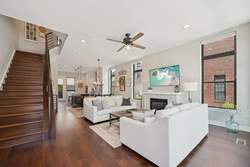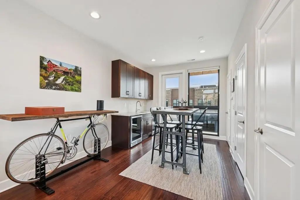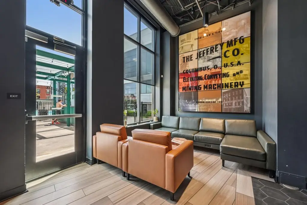 OPEN HOUSE! 9/20,1-3PM. This rare BRIGHT, end unit-with NO SHARED WALLS, has light shining brightly with wonderful views! FOUR LEVELS are finished spaces for you to appreciate including THREE w/ OUTSIDE SEATING. The FIRST FLOOR includes an open concept living room with a fireplace, chef's kitchen, granite countertops, modern stainless-steel appliances, and half bath. The SECOND FLOOR offers a private balcony with relaxing views. from the primary suite, an en suite bathroom with a dual vanity quartz countertop, spa-like shower, two huge walk-in closets. The laundry room, and a second bedroom or office down the hallway. The THIRD ROOFTOP FLOOR boasts a flex space for a bedroom, relaxing or entertaining, a full bathroom, a wet bar, and an outside lounge area-with a remote retractable awning and a view of the city skyline.The LOWER LEVEL provides yet another large room to entertain with, a bedroom, and a full bathroom. Everything you'd want in a community is available for you: Clubhouse, pools, state-of-the-art gym, coffee house and more... Enjoy LUXURY URBAN LIVING here- close to all that Columbus has to offer. *TAX ABATEMENT
