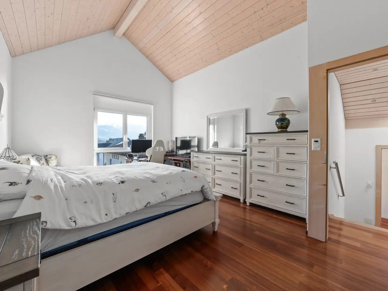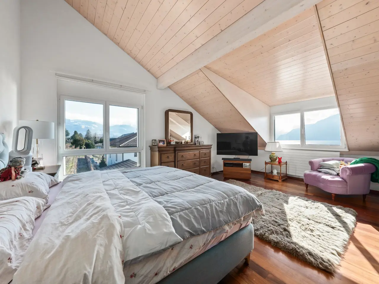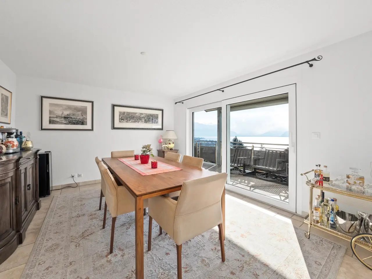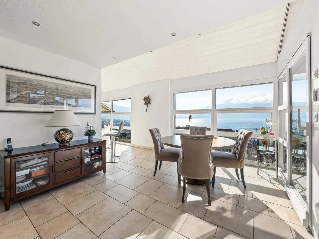 In a residence of just three units, majestically overlooking Lake Geneva, this exceptional property offers an idyllic living environment in the heart of a peaceful residential area, yet within easy reach of the Riviera's economic and cultural centers. This spacious 325 m² luxury apartment boasts breathtaking panoramic views, visible from every room. It features a large, bright living room with wood-burning stove, a pleasant dining area with direct access to a large 18 m² covered balcony, and a semi-open, fully-equipped kitchen. The same level also houses a guest toilet, a bedroom with en suite bathroom, a laundry room, and a second covered balcony of over 14 m², ideal for enjoying the outdoors in any season. The first floor, accessible by elevator, houses an elegant master suite with shower room, dressing room and storage space, as well as a generous second bedroom of 25 m². The impressively spacious attic features two large attic rooms, one with a dressing room. A central shower room and sauna complete this space dedicated to relaxation. An 80 m² garage with space for up to four vehicles (extra charge), a cellar and an air-conditioned wine cellar round off the top-of-the-range features of this unique property. The property is currently rented.