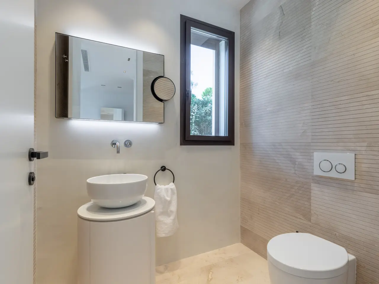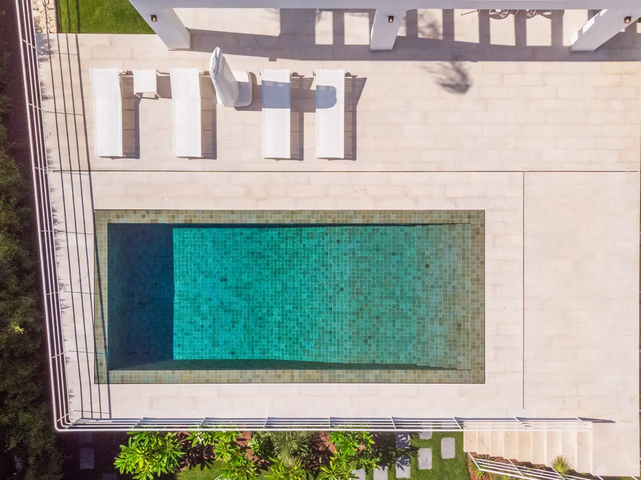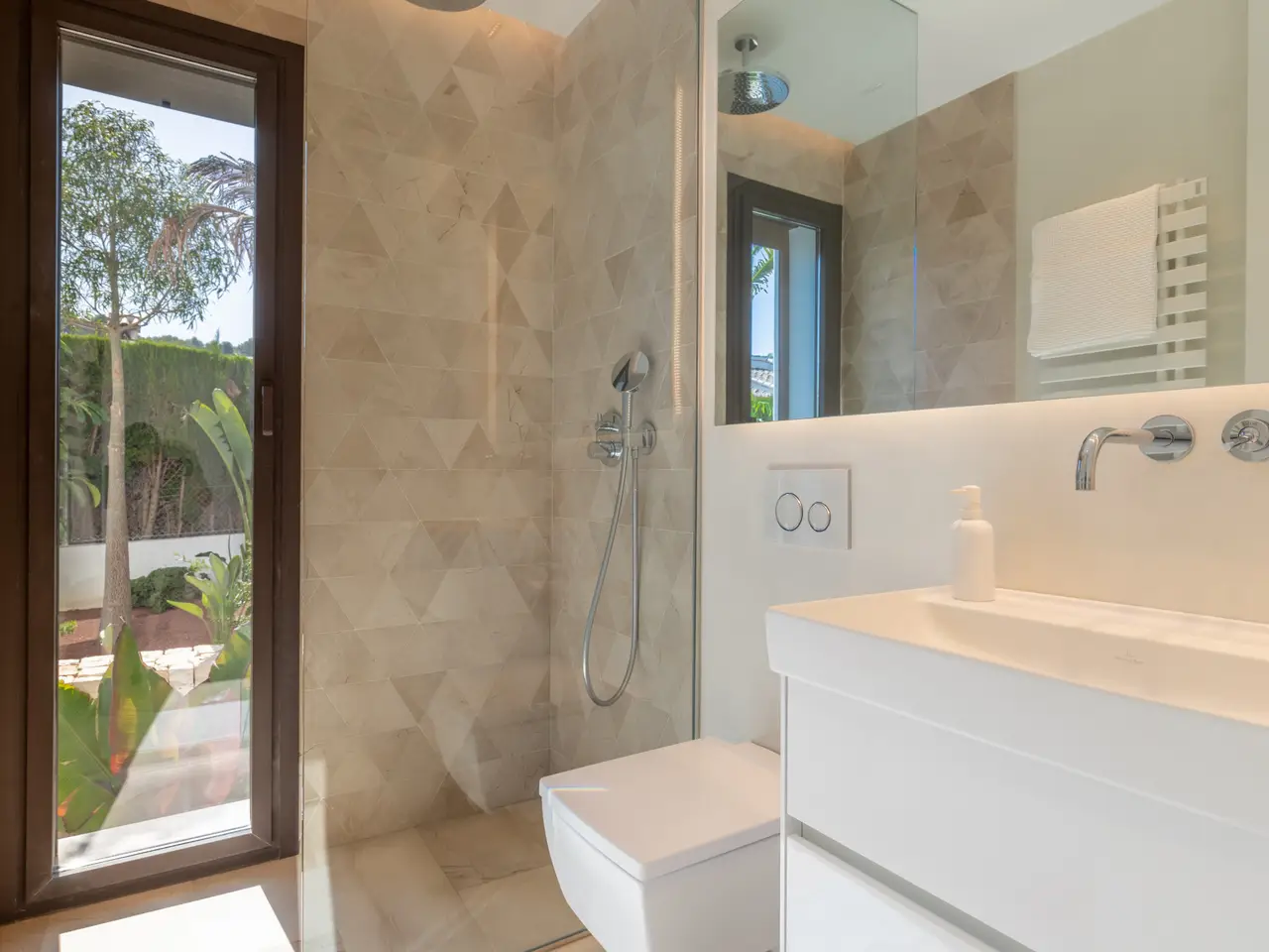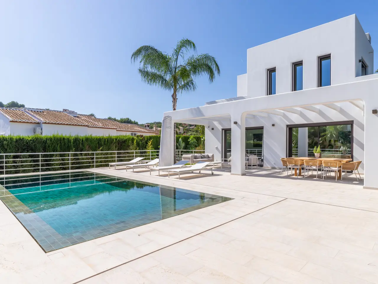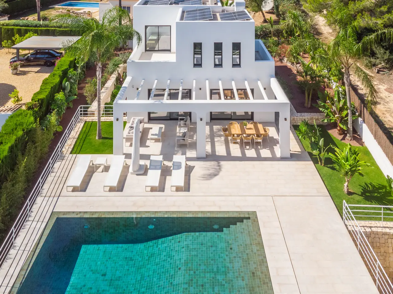 The property is surrounded by a beautiful garden and is distributed on three floors. On the main floor are the living room with access to the terrace and the area of the magnesium pool and volcanic stone, fully equipped kitchenette with higher-end appliances, a courtesy bathroom and double bedroom with en-suite bathroom. On the upper floor there are two bedrooms, each with en suite bathroom, dressing room and access to terrace. On the ground floor there is a double bedroom with dressing room and en-suite bathroom, office, library, bathroom, cellar, cinema room and machine and storage area. The property is equipped with air conditioning, underfloor heating, solar panels and domotic system. It is worth noting the design, the luminosity of the house, its large windows and that all the materials used in the construction are of higher quality. This villa is perfect for both summer and winter. .