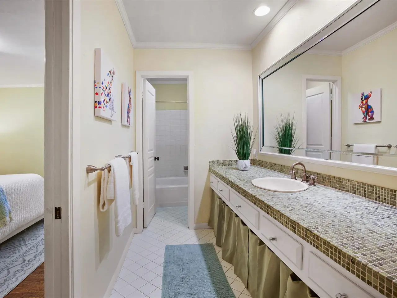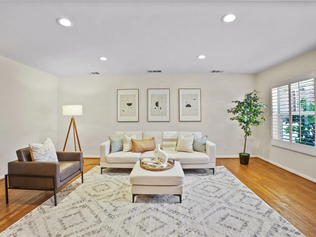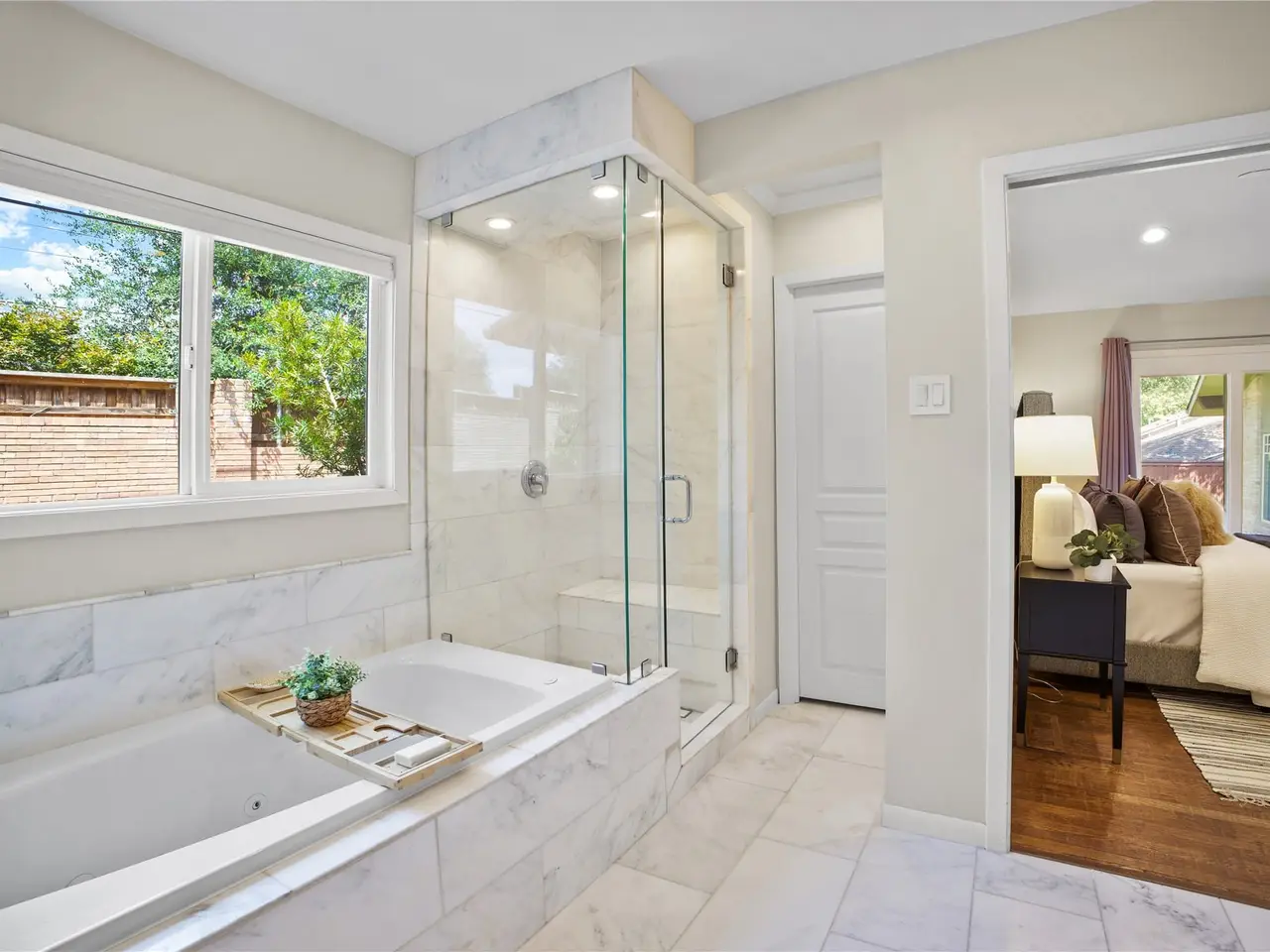 LIGHT, LOCATION, LANDSCAPING!! FABULOUS 99-FOOT FRONTAGE! Move-in-ready 4-bedroom contemporary style home easy walk to Lakewood Elementary, Lakehill Preparatory, White Rock Lake and Lakewood shopping center. Vaulted ceilings, tons of natural light, double-sided gas fireplace, and so much more. Main living and dining areas open onto covered rear patio and landscaped backyard. Front living-office is flooded with light through floor-to-ceiling windows. Updated kitchen features quartz counters, high-end stainless appliances, farm sink, built-in wine cooler, breakfast bar, and walk-in pantry. Primary suite offers dual walk-in closets, Carrara marble vanity with dual sinks, jetted soaking tub and separate shower. Step out of the bedroom onto the deck made of Brazilian walnut hardwood (Ipe wood). Secondary bedrooms are nicely sized with Jack & Jill bath. Large fourth bedroom with updated en suite bath is perfect for guests or as office or playroom. Additional features include sprinkler system, mosquito misters, alarm system, Aquasana whole-home water filtration system, oversized 2-car garage, and a backyard oasis with hot tub, sauna, and bocce court. Improvements include replacement of main HVAC unit with energy-efficient (SEER-19) Daikin HVAC system with Wi-Fi control and upgrade of attic insulation to R32 standard resulting in greatly reduced electricity bills. Gated driveway leads to expanded parking area that doubles as basketball court. This well-maintained, comfortable and functional home is situated on an expansive 99-foot wide lot in the heart of Lakewood.