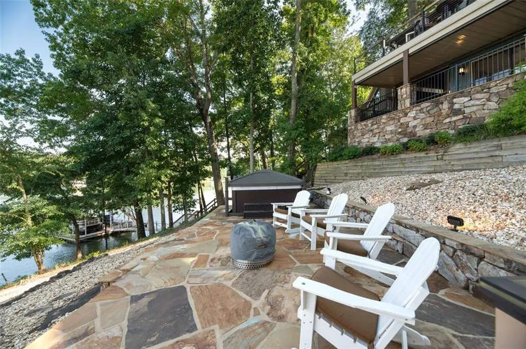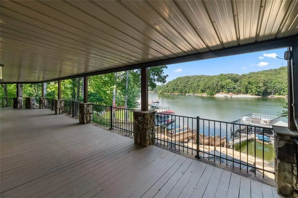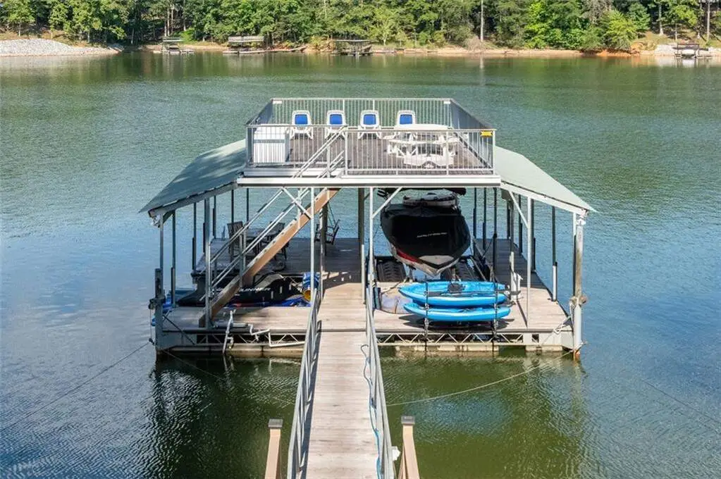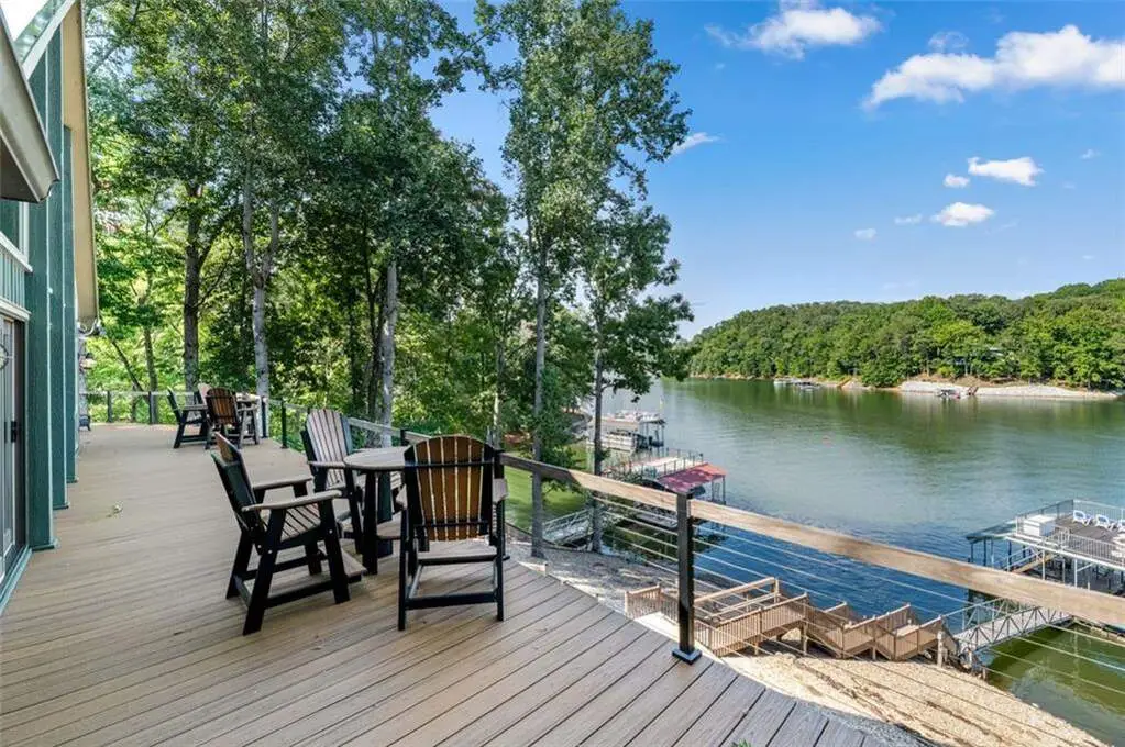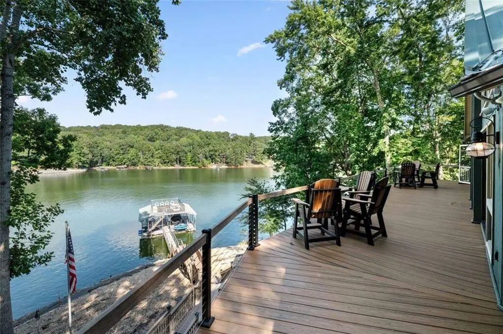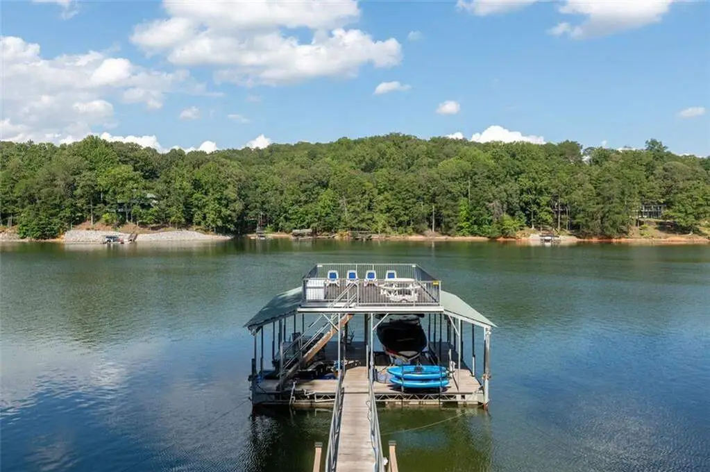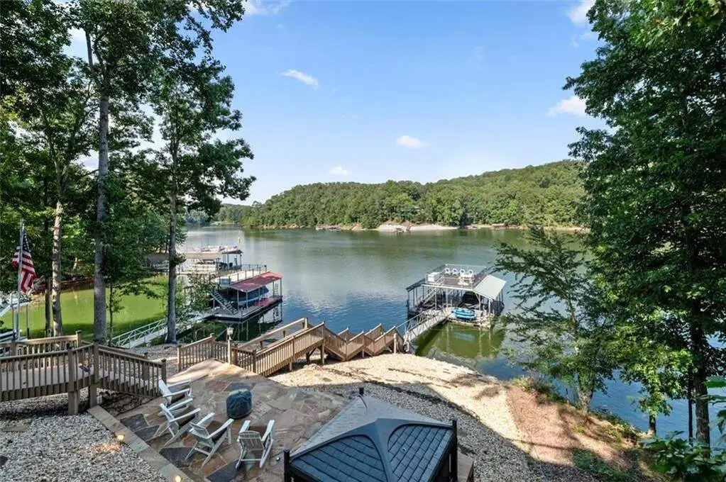 Imagine waking up to panoramic 180 views of Lake Lanier, where the sunrise paints the sky and the water stretches endlessly beyond your back door. Perfectly positioned on a private point lot, this rare property delivers the best of resort-style living without restrictions or dues. Just a short stroll from the award-winning Chestatee Golf Course and Restaurant, it's where lake life and luxury living truly meet. Few homes on Lake Lanier can match what this one offers! Year round deep water, breathtaking sunrise vistas, and The Army Corps of Engineers line that runs all the way into the lake, unlocking endless opportunities for your dream backyard oasis. Picture an infinity edge pool spilling toward the shoreline, a terraced garden, or an outdoor entertaining space like no other. Here, imagination becomes reality. Follow the professionally landscaped, stepped path to your private 32x32 double-slip dock with a party deck, complete with an 8,000-lb boat lift and new jet ski ports. Whether you're hosting friends or going for a quiet paddle at sunrise, every day is a lake day. Designed with both relaxation and entertaining in mind, the home offers two expansive Trex decks, a new hot tub with automatic cover, and an oversized flagstone patio ideal for fireside evenings under the stars. The entire back of the house is framed in sliding glass doors, creating a seamless flow between indoor comfort and outdoor living. Inside, light filled spaces open to sweeping lake views from nearly every room. The main level primary suite is a warm, inviting retreat with wide plank pine floors, while the chef's kitchen features a gas range, double ovens, and granite countertops. Upstairs, a spacious loft adds flexibility for a bunk room, office, or epic game room. On the terrace level, you'll find three bedrooms, including a private suite with its own fireplace, plus an additional living room and an incredibly designed bathroom that elevates guest comfort. This level was created with gathering in mind.