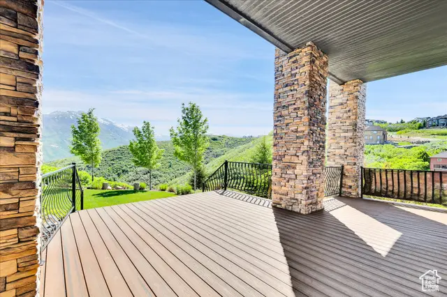 Nestled in the heart of SunCrest, this 5-bedroom, 4-bathroom home stretches across 8,499 square feet of mountain living on a .76-acre lot. You couldn't build this kind of home, on this kind of lot, for this kind of price in today's market. Not even 20 years old, it captures everything SunCrest is known for: fresh air, miles of hiking and biking trails, wide-open space, and views that make you stop mid-sentence. Four decks wrap around the exterior, offering front-row seats Lone Peak, Timpanogos sunrises and twinkling city lights at night. And with a brand-new roof just installed, you get peace of mind to match all that curb appeal. Inside, the main level is all about ease and elegance. It offers true main-floor living with two full bedroom suites. The primary retreat includes a private deck, spa-like ensuite with a walk-in shower, jetted tub, dual vanities, and a roomy walk-in closet. On the opposite side of the main level, a second bedroom also features its own ensuite. Perfect for guests, multigenerational living, or long-stay visitors. The kitchen, dining, and family room flow together seamlessly, making it ideal for both daily life and entertaining. Real hardwood floors, tall ceilings, and windows that frame mountain views add warmth and light throughout. Add in a formal living room, an office with fireplace, and main-floor laundry, and you've got the ideal daily setup. Details like plantation shutters and crown molding add charm and polish throughout. Upstairs, you'll find three additional bedrooms, two bathrooms, a second family room, a game area, and a second laundry room so there's no hauling baskets between floors. The basement is unfinished but well on its way. It features 9- to 11-foot 6-inch ceilings, framing in place, and roughed-in plumbing, and may even qualify as partially finished. The original plans (included) call for 2 full bathrooms, 2 bedrooms, a theater room, laundry, and a wide open family room. Whether you follow the original layout or bring your own vision to life, you'll appreciate the full walkout design and the wraparound deck that steps down to the lower level grassed yard. SunCrest continues to be one of Utah's best-kept secrets, and this home reflects the very best of it. The HOA includes internet, cable, a community clubhouse with a pool and gym, and events that make the neighborhood feel like home. A home this size, on a lot this rare, in a setting this special? That's not just a listing. It's a rare find that actually lives up to the phrase.