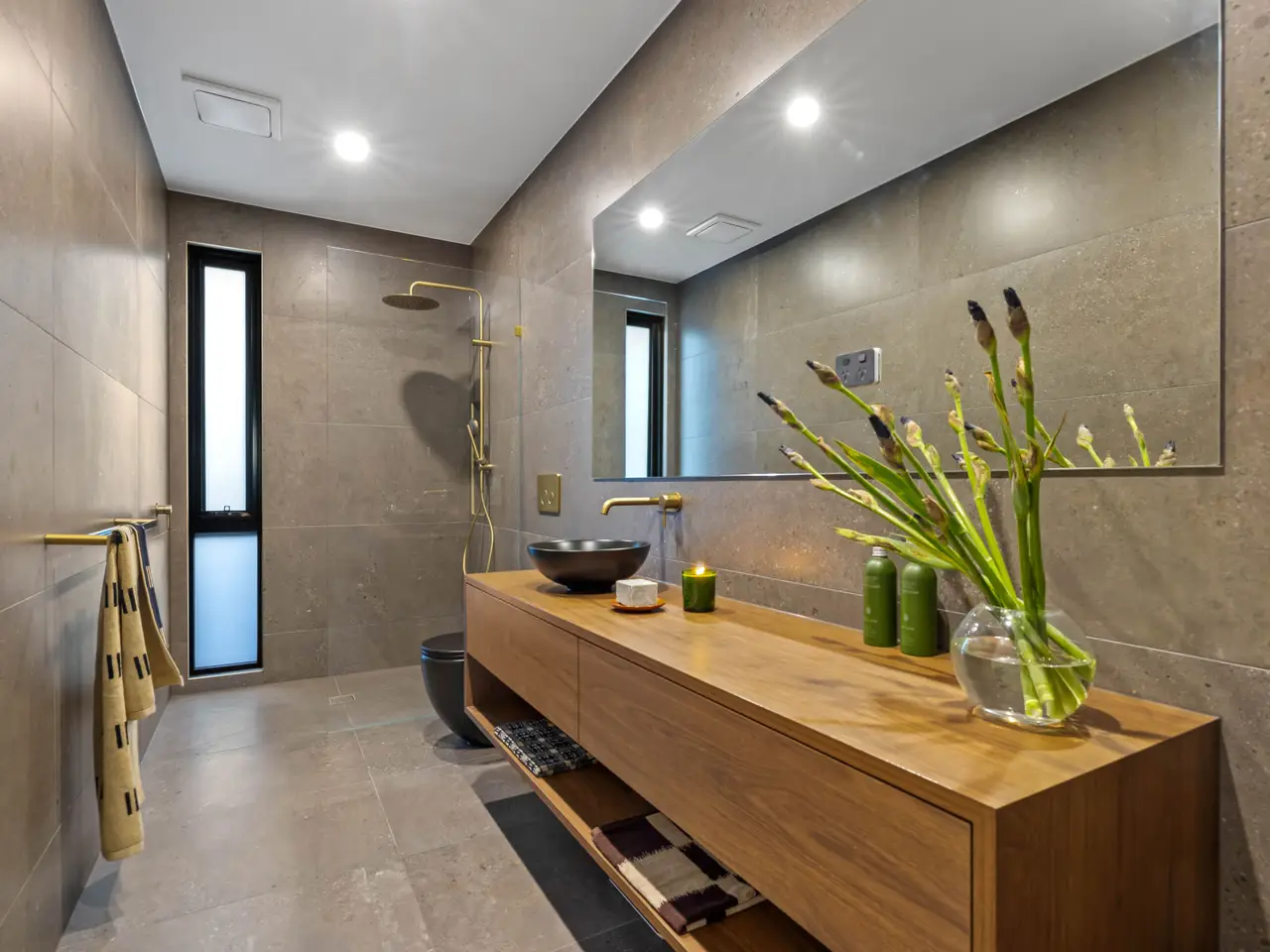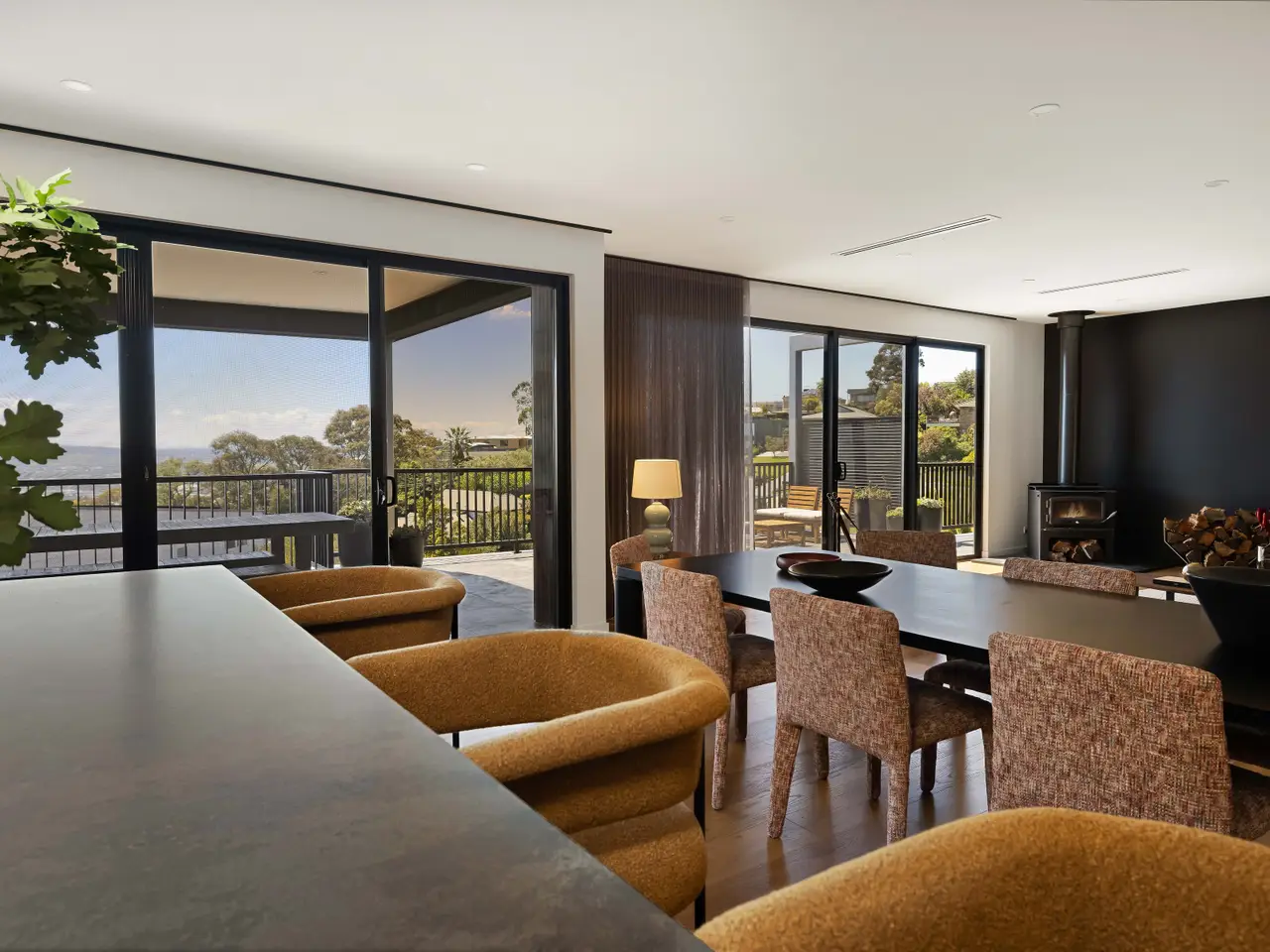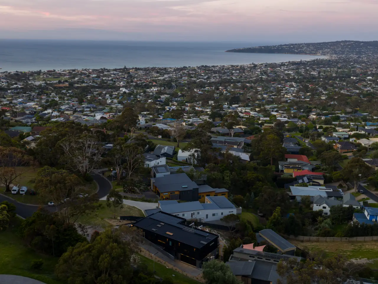 Capturing 180-degree, panoramic views across the coastline to the pristine waters of Port Phillip Bay and beyond, this brand new, architect-designed masterpiece offers more than 60 squares (approx.) of unparalleled luxury in a prized hillside location. Set against the dramatic backdrop of Arthurs Seat State Park, a truly exceptional lifestyle awaits those fortunate enough to secure this incredible property positioned on 1235m2 (approx.) with an 8m x 4m self-cleaning, solar-heated swimming pool and a fire pit area set amongst stunning gardens designed by The Block's Colin Hyett. Evoking sophistication and warmth with premium finishes and exquisite attention to detail throughout, the home boasts a showpiece kitchen with stone benchtops and splashbacks, Smeg appliances plus a large butler's pantry and bar, alongside a vast, ambient living/dining zone anchored by a striking feature wall and wood-burning heater. Designed for indoor/outdoor living, this space flows seamlessly onto a broad balcony with a built-in barbecue area and alfresco / lounge areas that set the scene for sunset drinks, entertaining in style or simple relaxing and enjoying the tranquil surrounds. Enjoy the twinkle of evening lights across the Peninsula from the private master suite which also has balcony access, a generous walk-in robe and a sumptuous ensuite with a bathtub and walk-in shower with a light well. Two additional bathrooms and a powder room are equally well-appointed with floor-to-ceiling tiles, timber accents and brushed brass tapware. Other highlights include an integrated home office and a downstairs second living zone that opens to the pool and outdoor shower with its own entrance and an adjoining bedroom and bathroom, making it ideal for further entertaining or a self-contained teenage / guest retreat. Tinted bronze toughened, double-glazed windows, skylights, two oversized pivot entry doors and electric curtains in the living areas and master suite are quality inclusions along with ducted refrigerated cooling / heating, 15kw solar panels with 24kw batteries, full security system with phone tracking plus a remote double garage, storage room, fruit trees and a vegetable garden. Just minutes to shops, restaurants, cafes, beaches and world-class wineries, hot springs and golf courses, this unique offering is truly one of a kind.