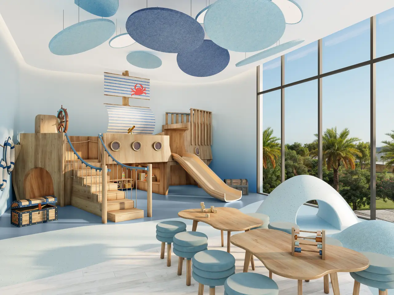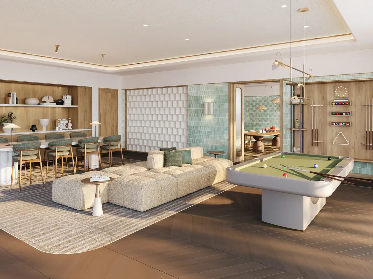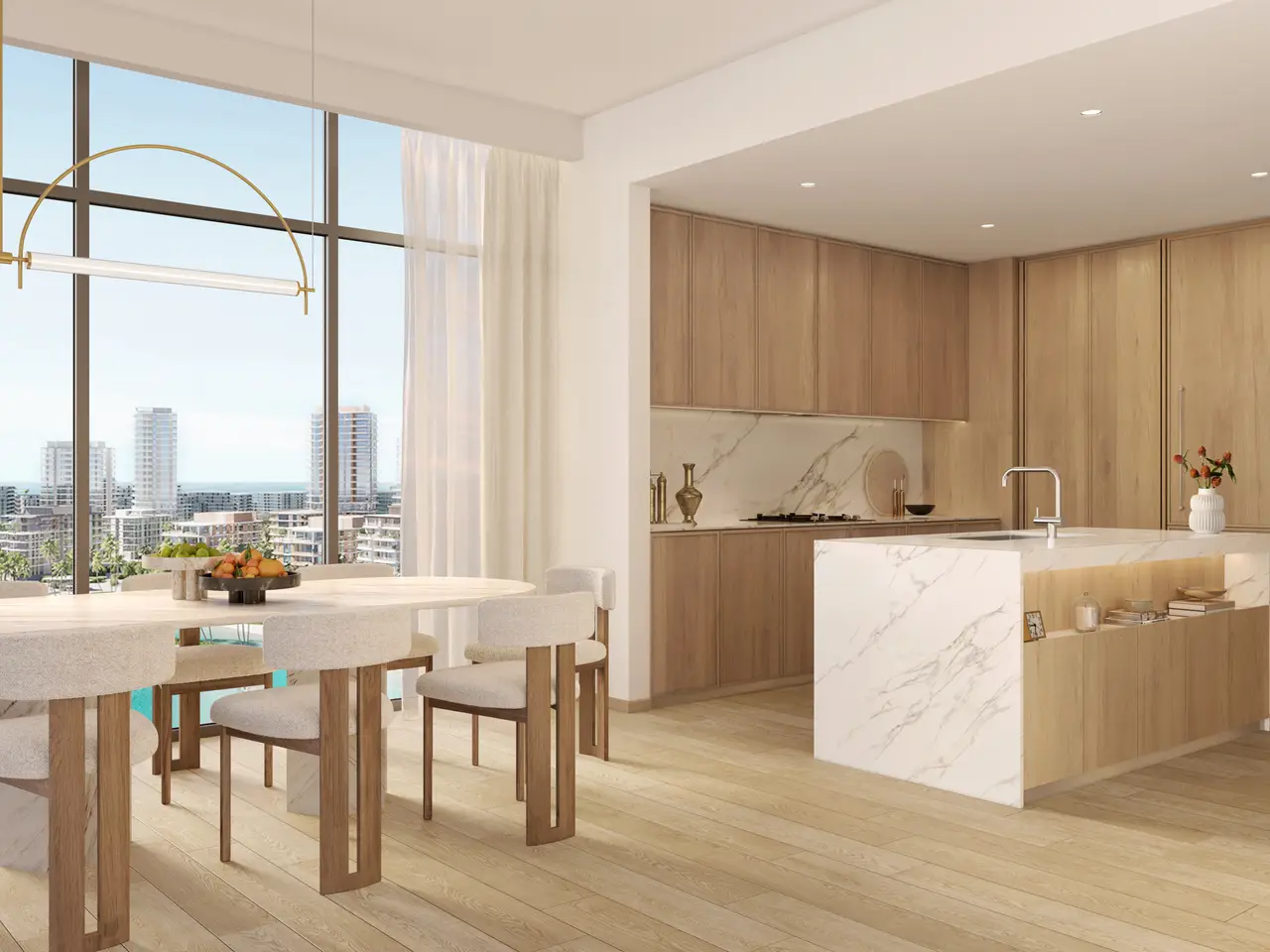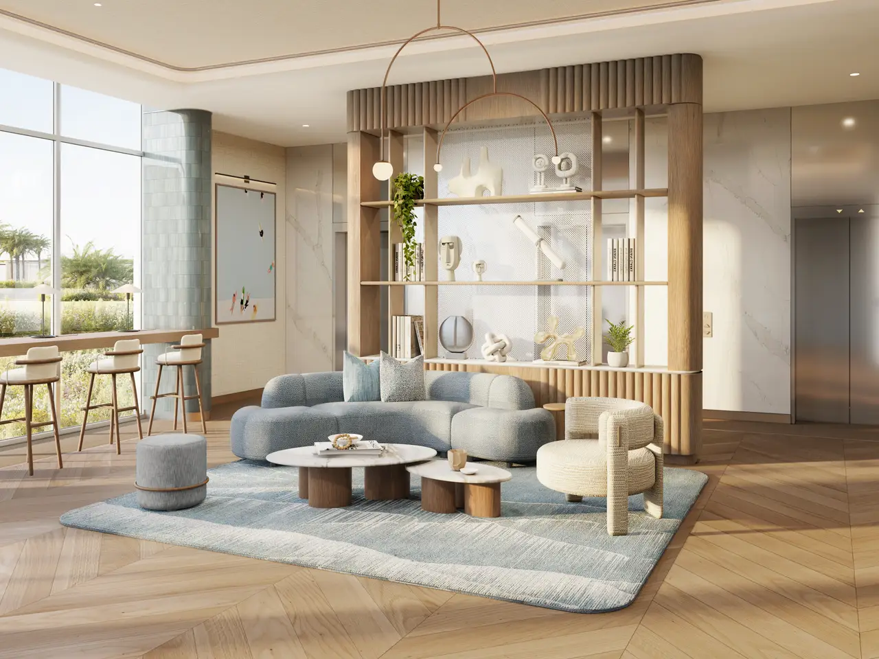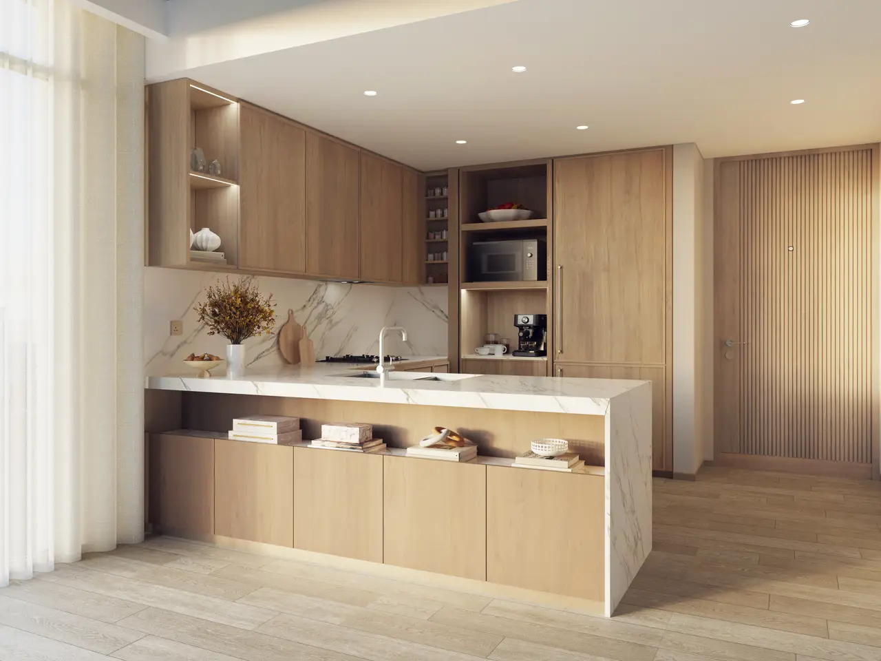 - Premium finishes throughout: warm wood-grain textures, understated stone surfaces and a palette inspired by coastal calm.