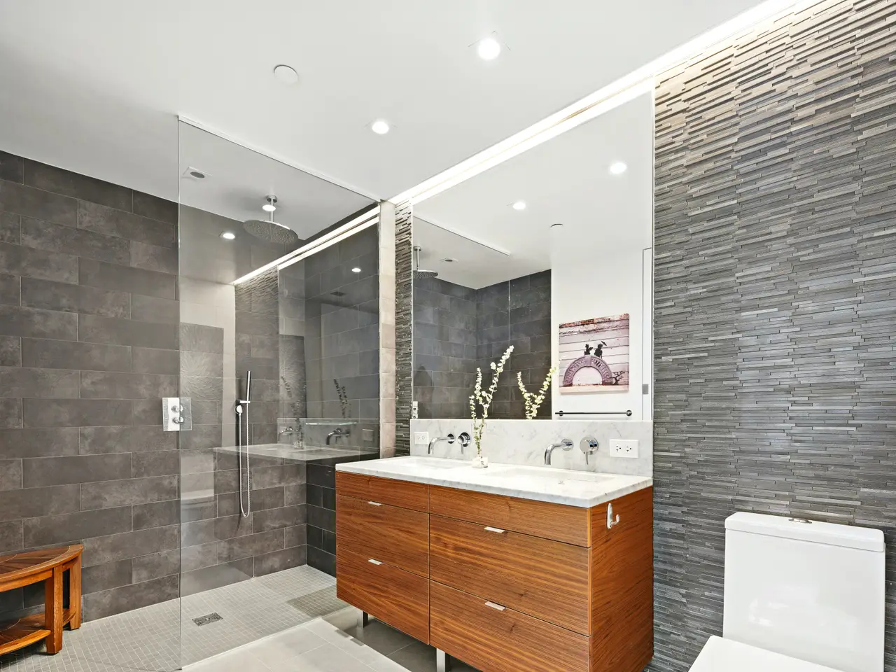 CONVERTIBLE THREE BEDROOM WITH HUGE PRIVATE TERRACE AND ON-SITE PARKING AVAILABLE! Formerly a legal 3 bedroom, (see original floorplan in media) this truly stunning, light-filled apartment has been thoughtfully reimagined as a magnificent 2 bedroom, 2 bathroom home with an expansive living/dining room. Featuring bespoke custom finishes throughout that add beauty and enhance function at every turn, the breathtaking interior could only be rivaled by the grand exterior terrace. (1,042 SF) A terrace that runs the entire width of the apartment and can be accessed from the living room and the master bedroom suite! This exquisite apartment is finished with 5" fumed white oak flooring and show stopping floor to ceiling black metal framed windows of double layered insulated glass that provide energy efficiency, pin drop quiet and pour light into the space. The open kitchen with abundant cabinet and counter space and large pantry features a large Luce de Luna Quartzite island with a built-in custom banquette for added storage. Additional kitchen features include a Thermador range, Insinkerater garbage disposal, wine fridge, Sub Zero refrigerator and a Bosch dishwasher. Journey down the hallway toward a charming sunny second bedroom on your left and a large spa-like second bathroom with a deep soaking tub to your right. Continue on and pass a large laundry closet that has been outfitted with built-in shelving that includes a folding table, a Bosch washer/dryer and plenty of extra room for household cleaning supplies. At the end of the hallway you'll discover a beautiful and bright master bedroom suite with large built-in closets and another direct access point to the magnificent private terrace. The en suite master bathroom features Carrera marble countertops, Italian porcelain tiles and a rain shower. Building features include a full-time attended lobby, live-in super, state of the art fitness room (with a Peloton bike!), bicycle storage, a common media lounge and two common outdoor spaces. 205 WATER was ground up new construction, (fully completed in 2012) and was uniquely designed for sustainability and achieved the prestigious LEED Gold Certification. On-site parking and two storage units are available for additional purchase!