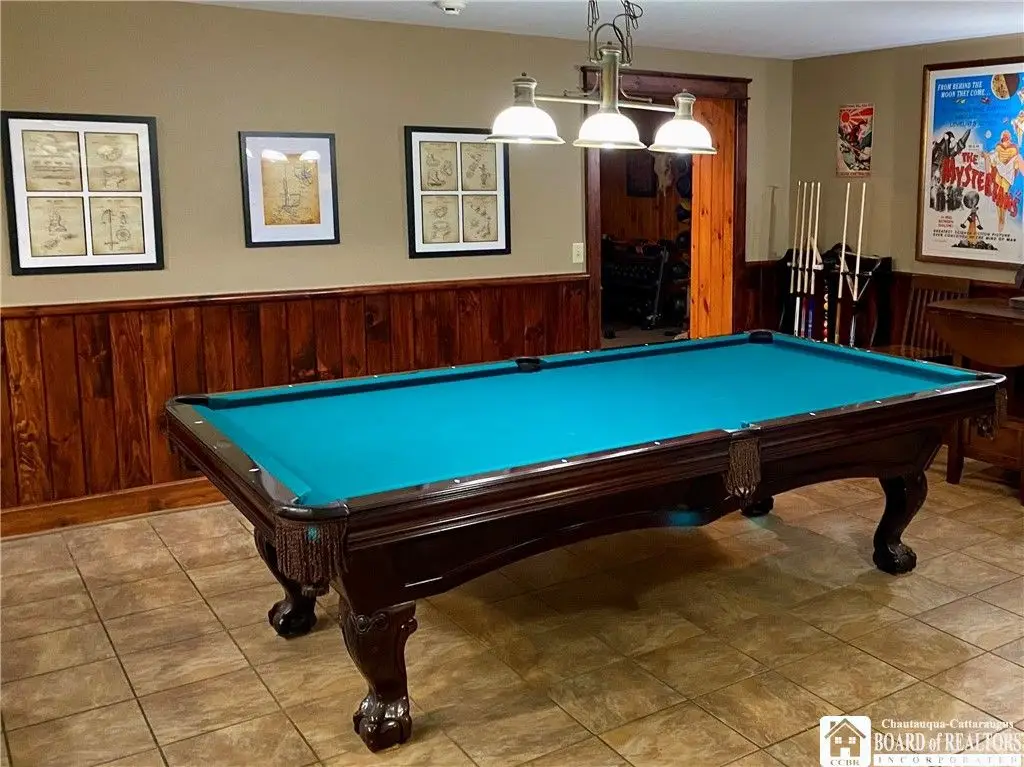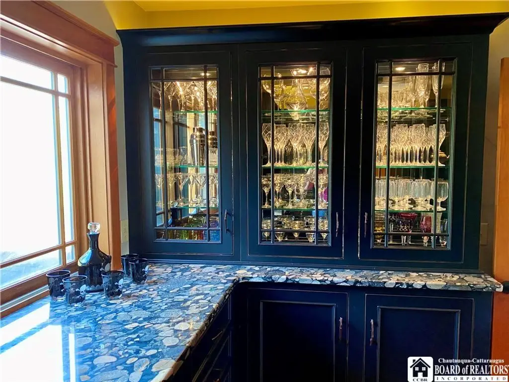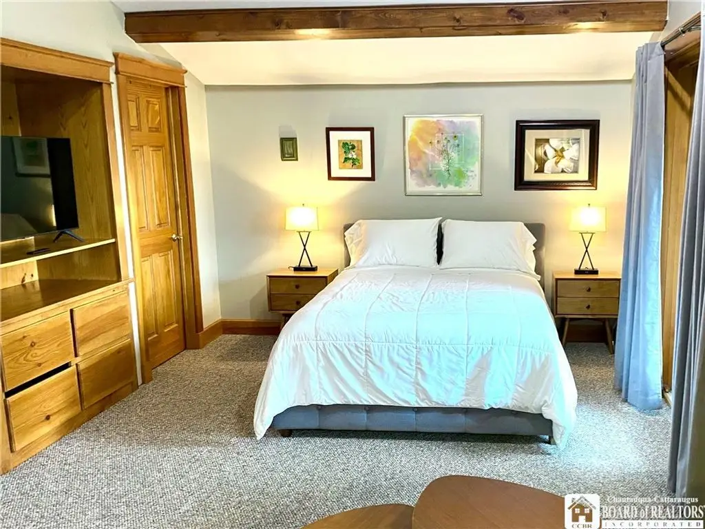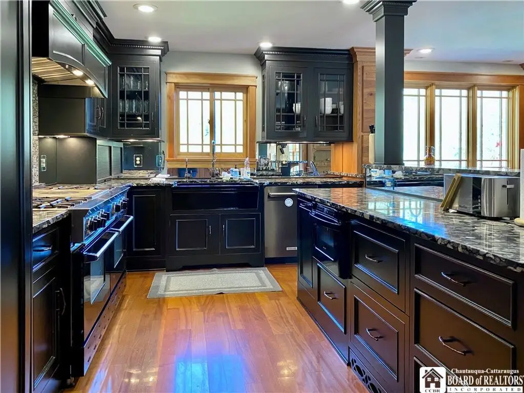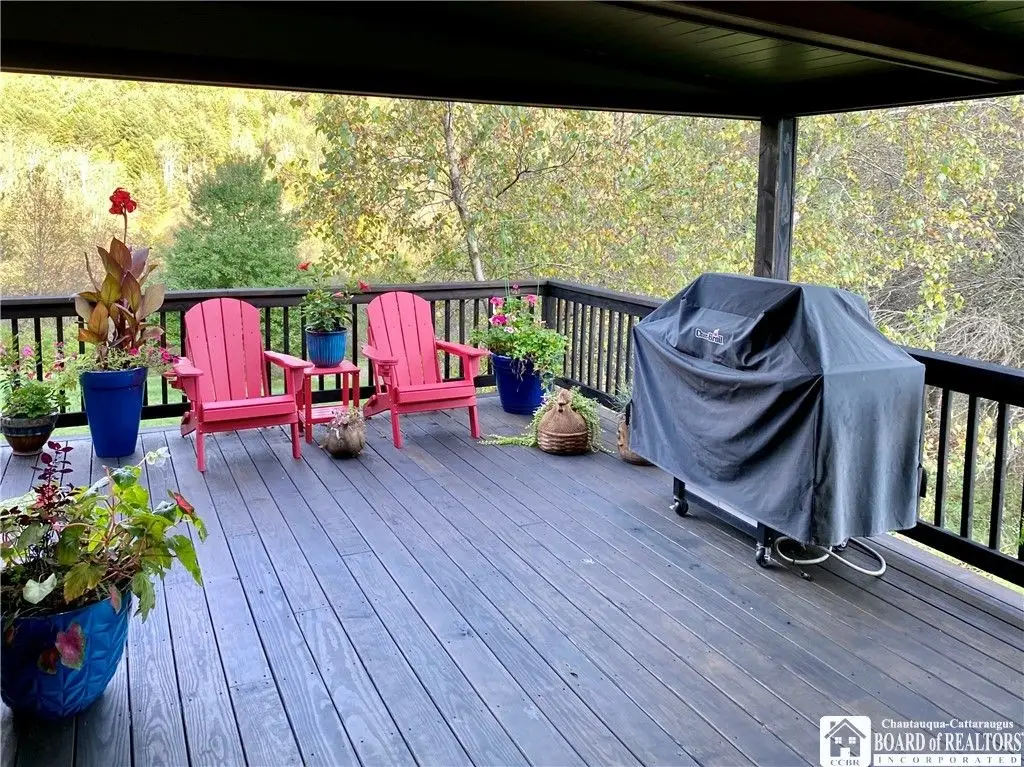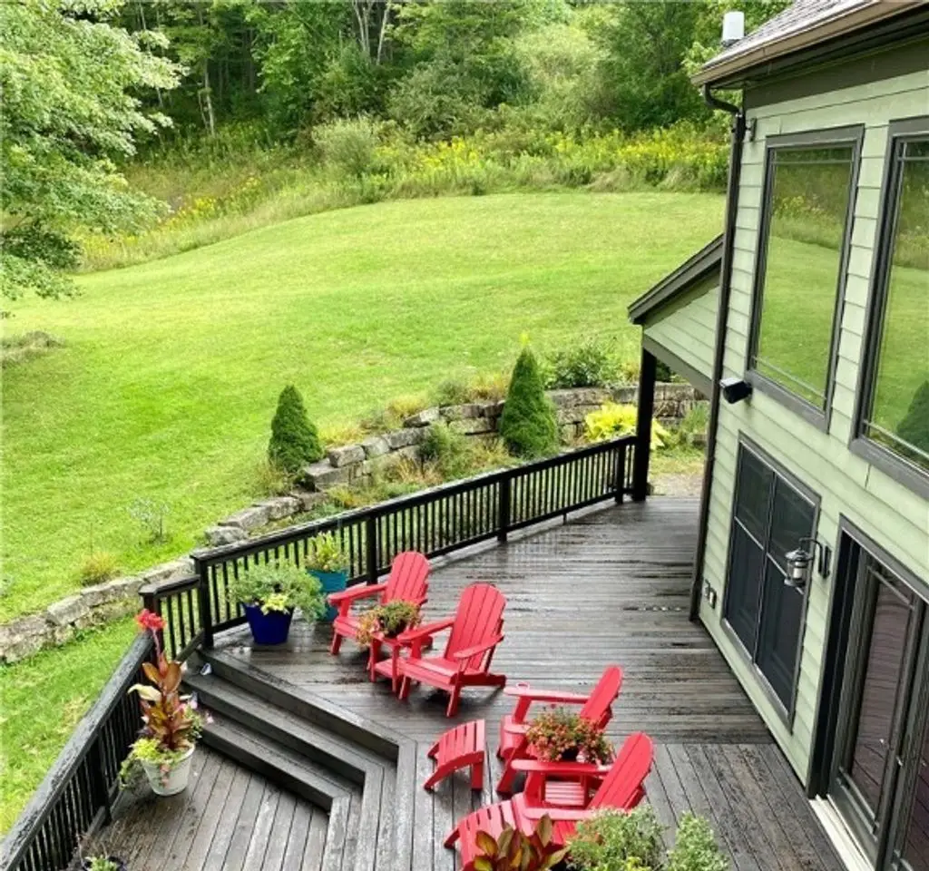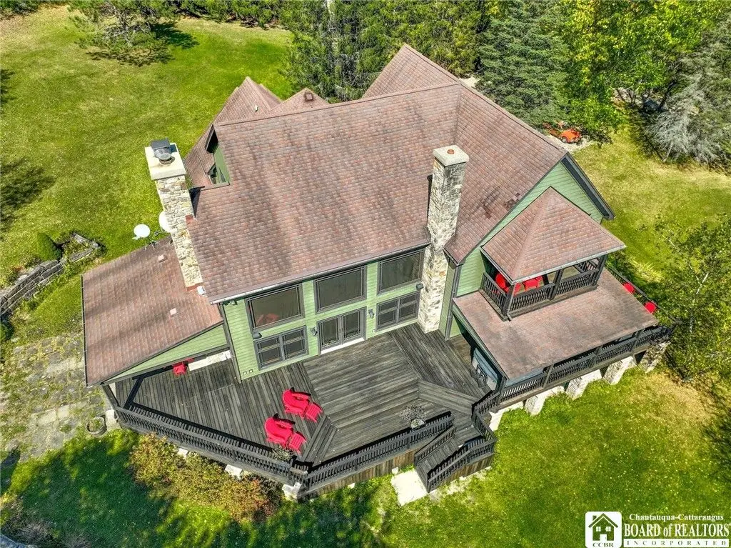 Tucked away on 20 acres of land, just 1 mi. from the Village of Ellicottville and 10 minutes from skiing, this unique home offers the space you need and the amenities you deserve. 5600+ sq/ft of interior space includes a spacious primary suite on the main floor, a spacious junior suite (with balcony overlooking the pond and slopes at Holiday Valley), 5 guest rooms, for a total of 7 bedrooms and 6 full baths. The centerpiece of the house is the great room, with its vaulted ceilings, towering stone fireplace (1 of 3), wall of windows, wet bar, and magnificent chandelier. In-floor radiant heat keeps the large space feeling cozy in the coldest weather. Multiple doors lead out to deck that wraps around 3 sides of the house, including a covered porch in back with an outdoor fireplace. Custom, chef's kitchen, equipped to feed a crowd, with a 6-burner Blue Star range, double ovens, two warming drawers, an extra deep farmhouse sink (instant hot water), 20+ ft of granite countertop, large island workspace/breakfast bar, & plenty of storage. Lower level includes a mudroom & 2 1/2 car garage. Laundry room, firewood-storage room, party-sized wet bar & seating area with a w/b fireplace & home theater system (projector, 110" screen, high-end surround sound system (professionally tuned for the space), and rack-mounted entertainment system - except for Roku and gaming consoles - included with the house). 17 zones of separately-controlled radiant, hot-water heat. 2 central Unico-type air conditioning systems. A whole-home generator. Alarm system, with sensors throughout the house. This 20 acre property includes 2 ponds (1 swimmable), an apple orchard (also plenty of wild apple trees, berry bushes, etc.), woods (mostly maple), and a separate, climate controlled, toy garage/workshop. Additional 3000 sq/ft "barn" with finished 2nd floor!